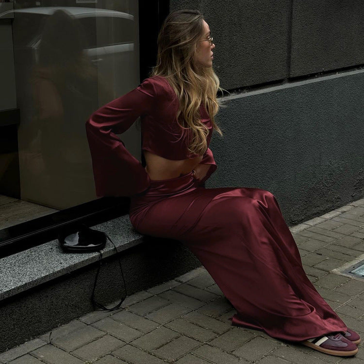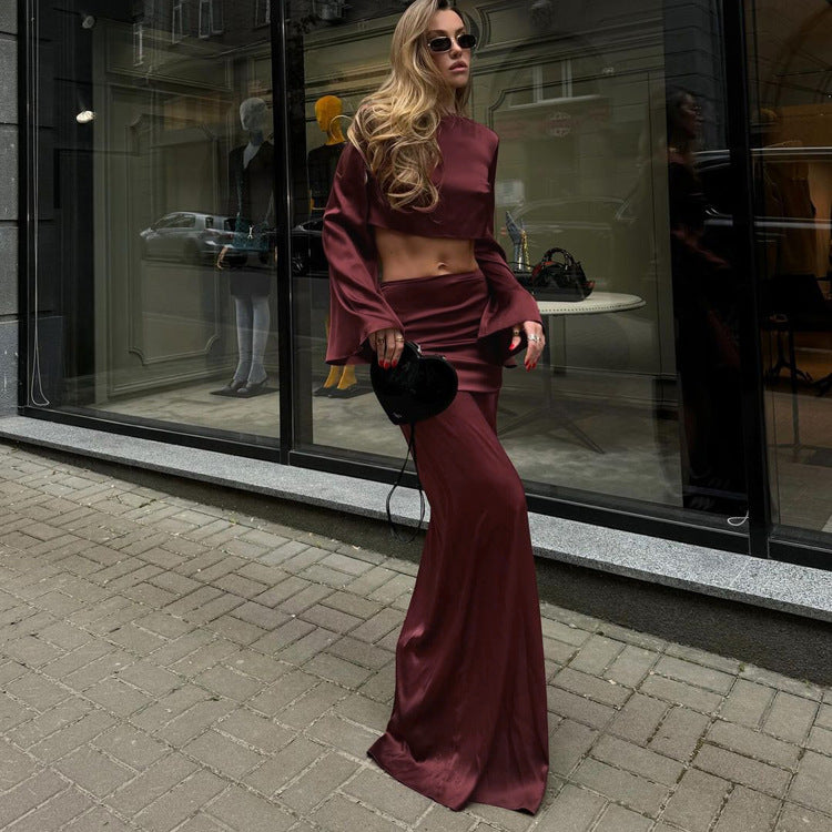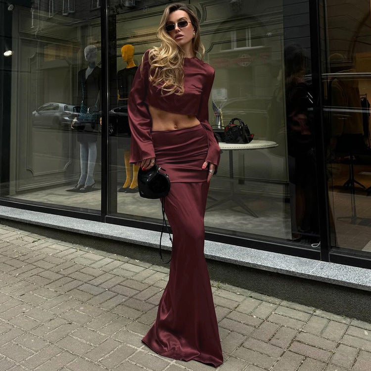 Long Sleeves Cropped Top Satin Draping Skirt Set Ruffle Hip Long Skirt Two Piece Set