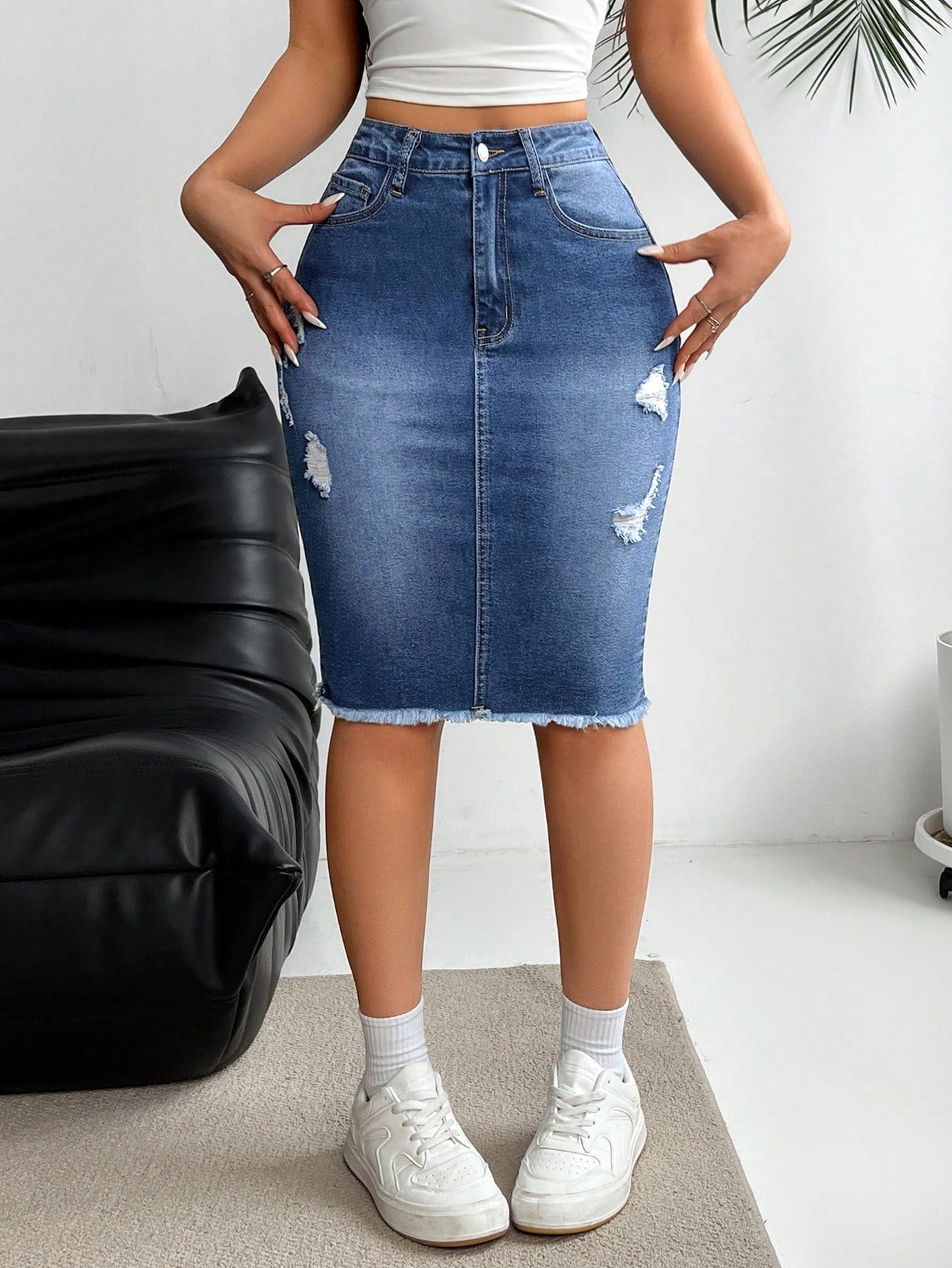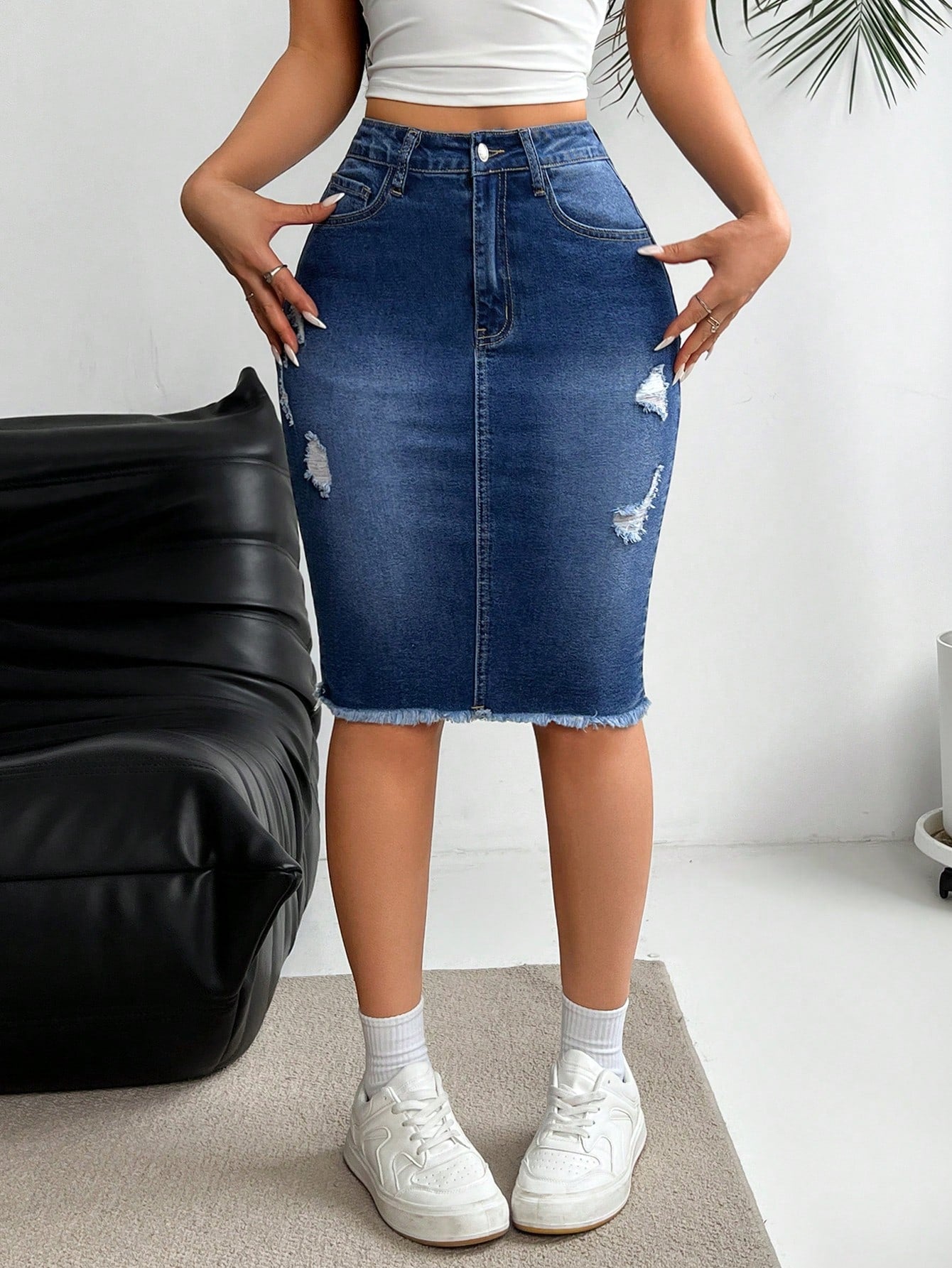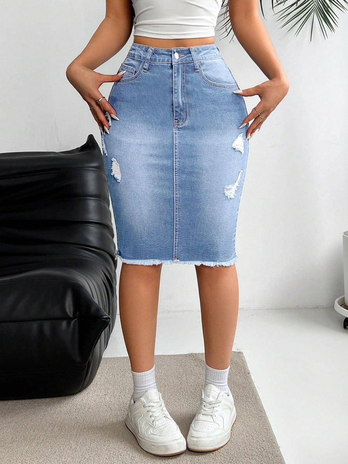LUNE Casual Distressed Hem Fitted Denim Skirt, Summer