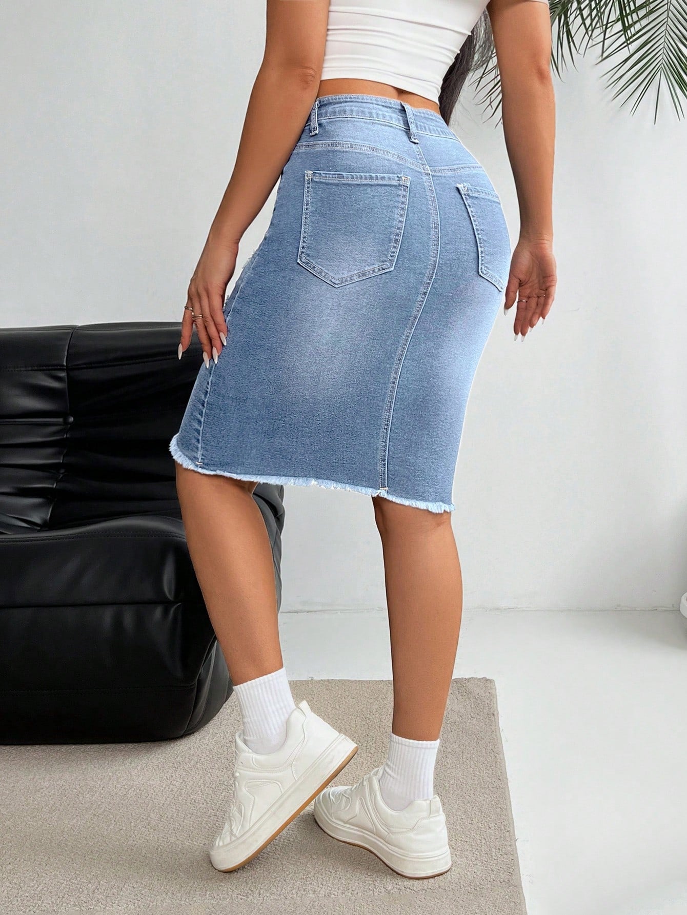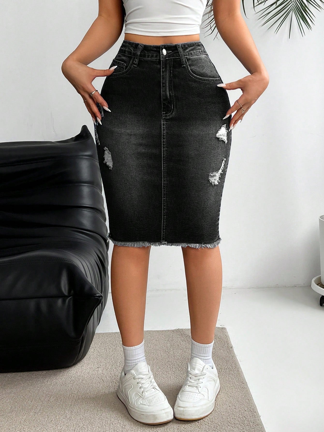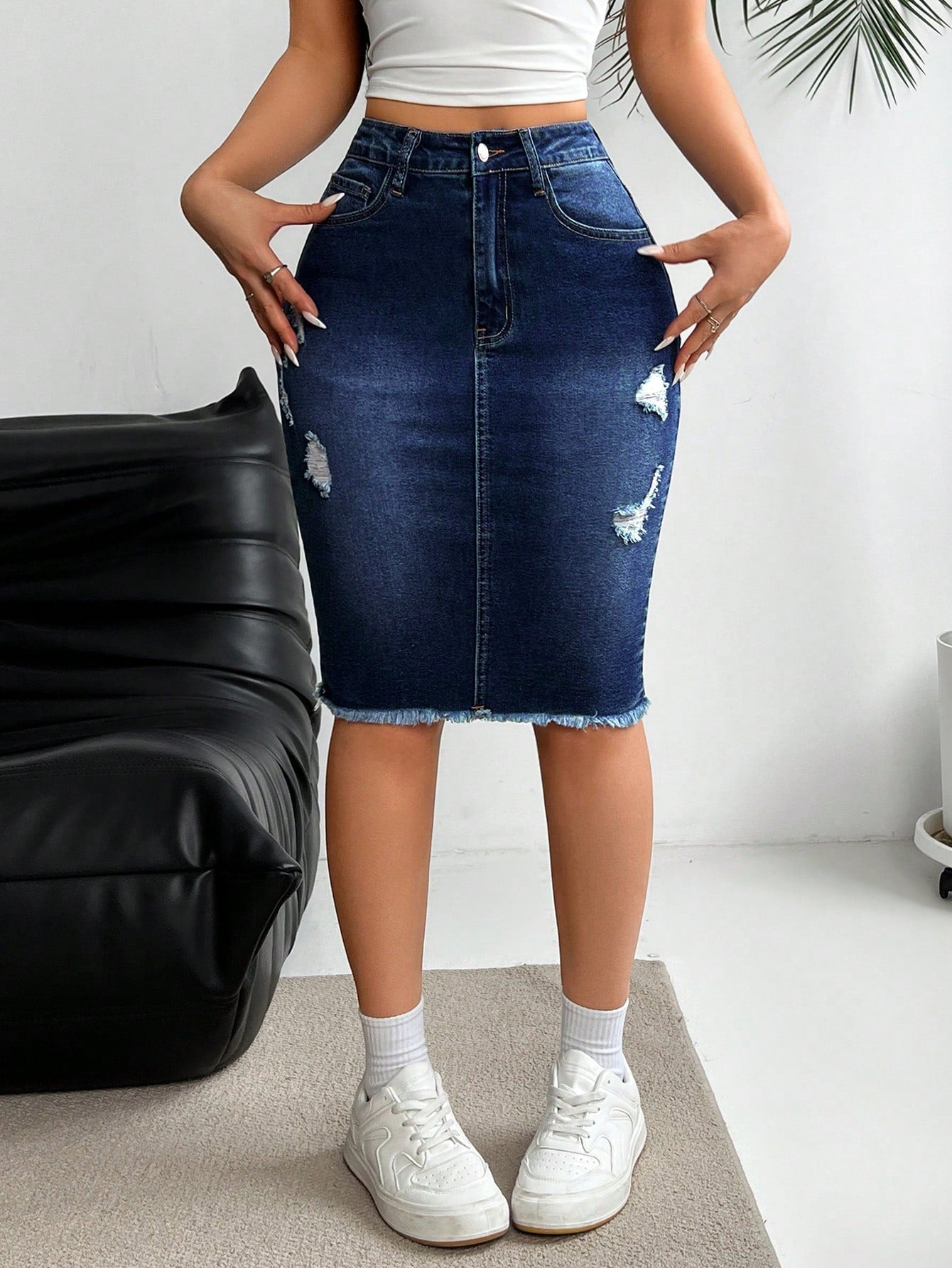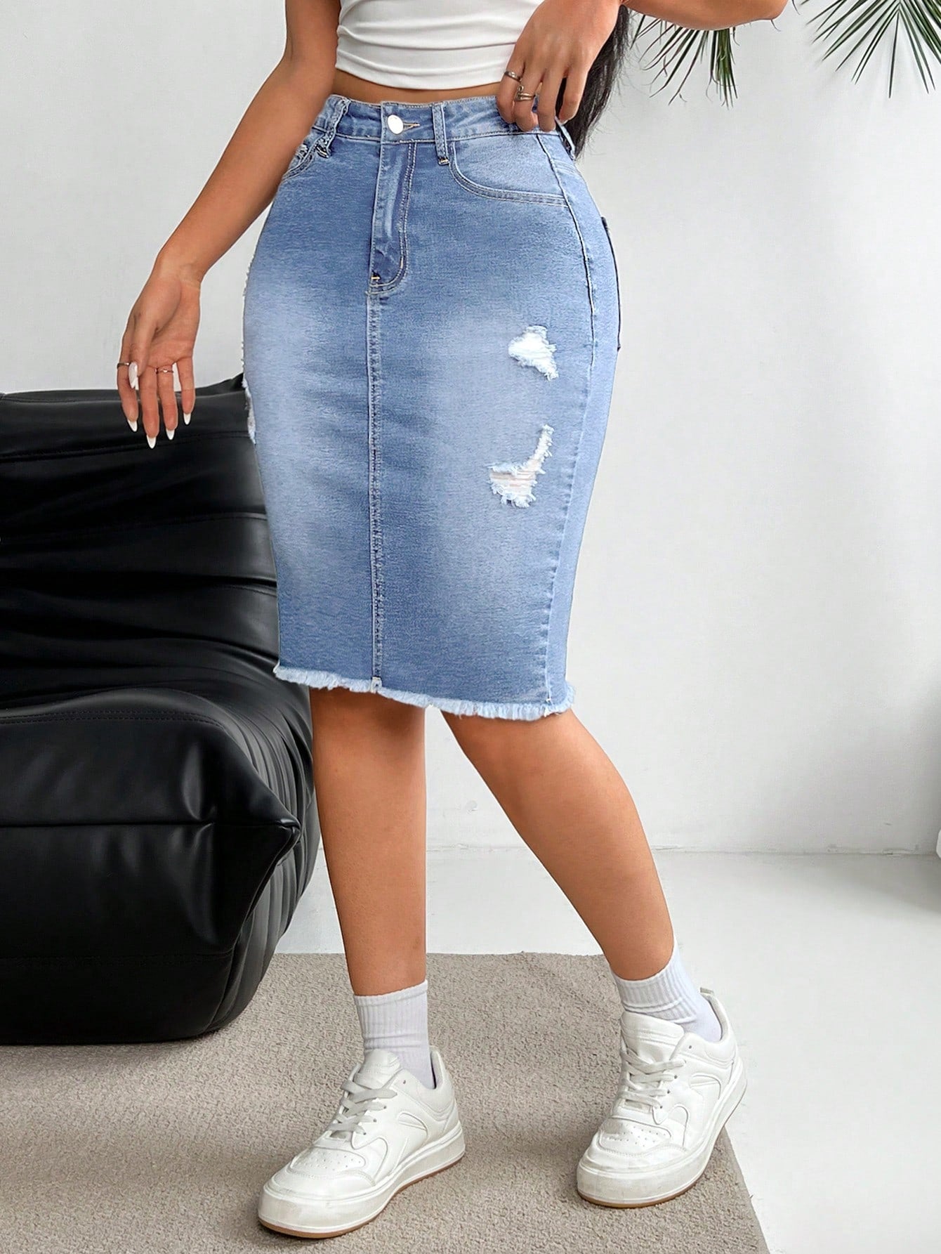 LUNE Casual Distressed Hem Fitted Denim Skirt, Summer