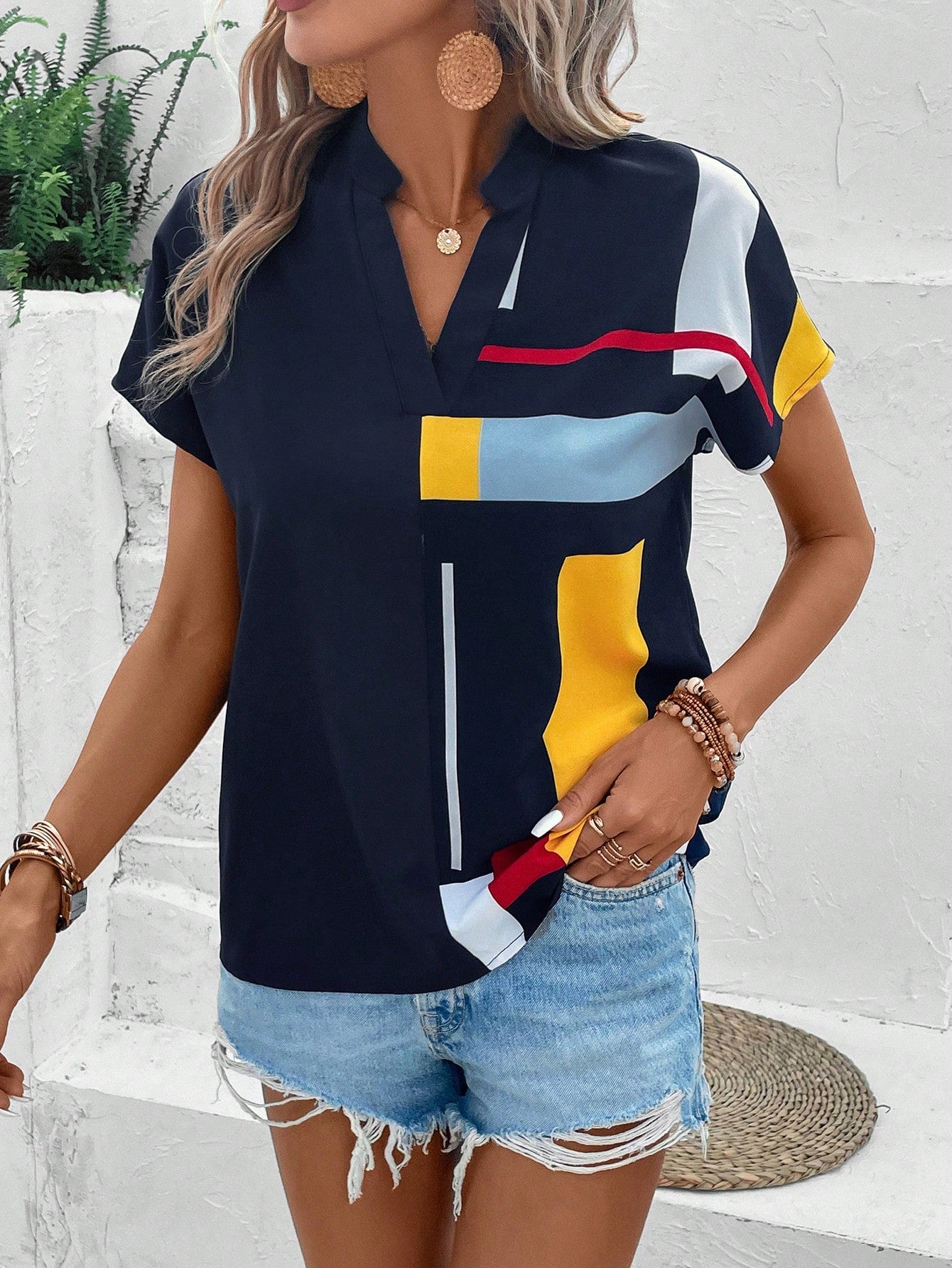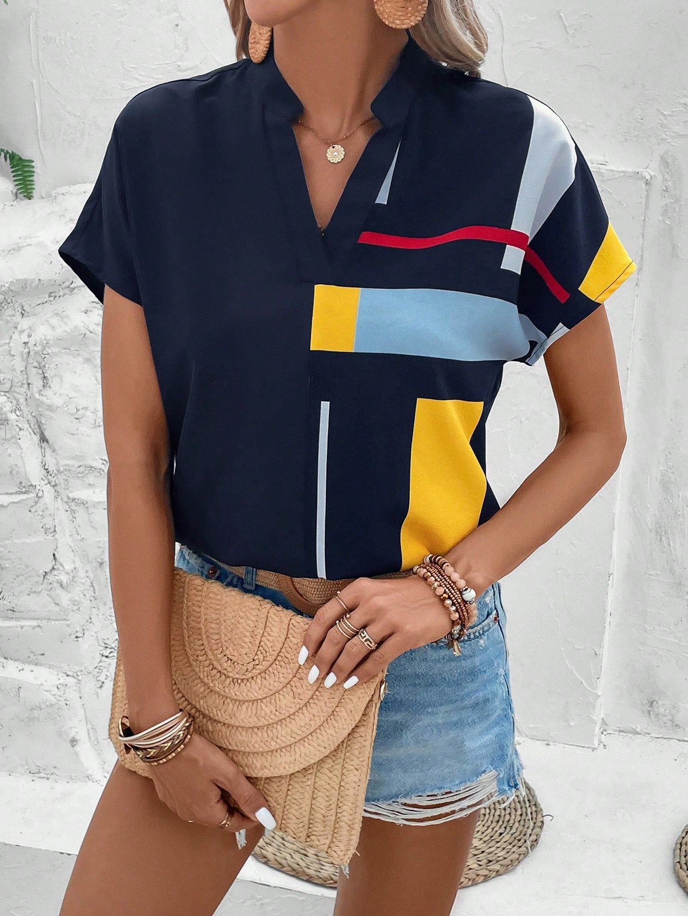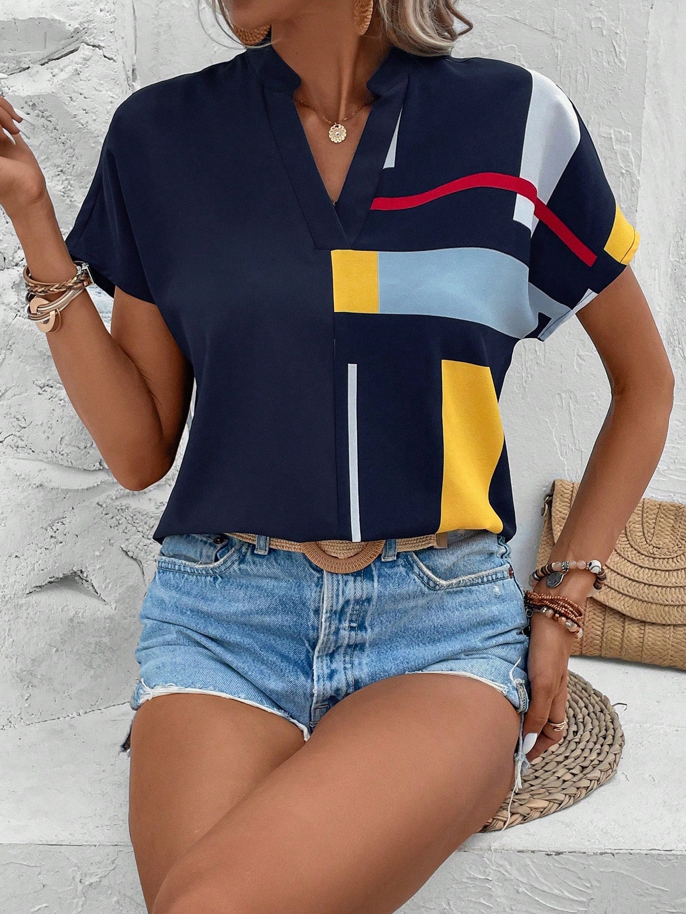 LUNE Geo Print Batwing Sleeve Popover Blouse,Short Sleeve Tops