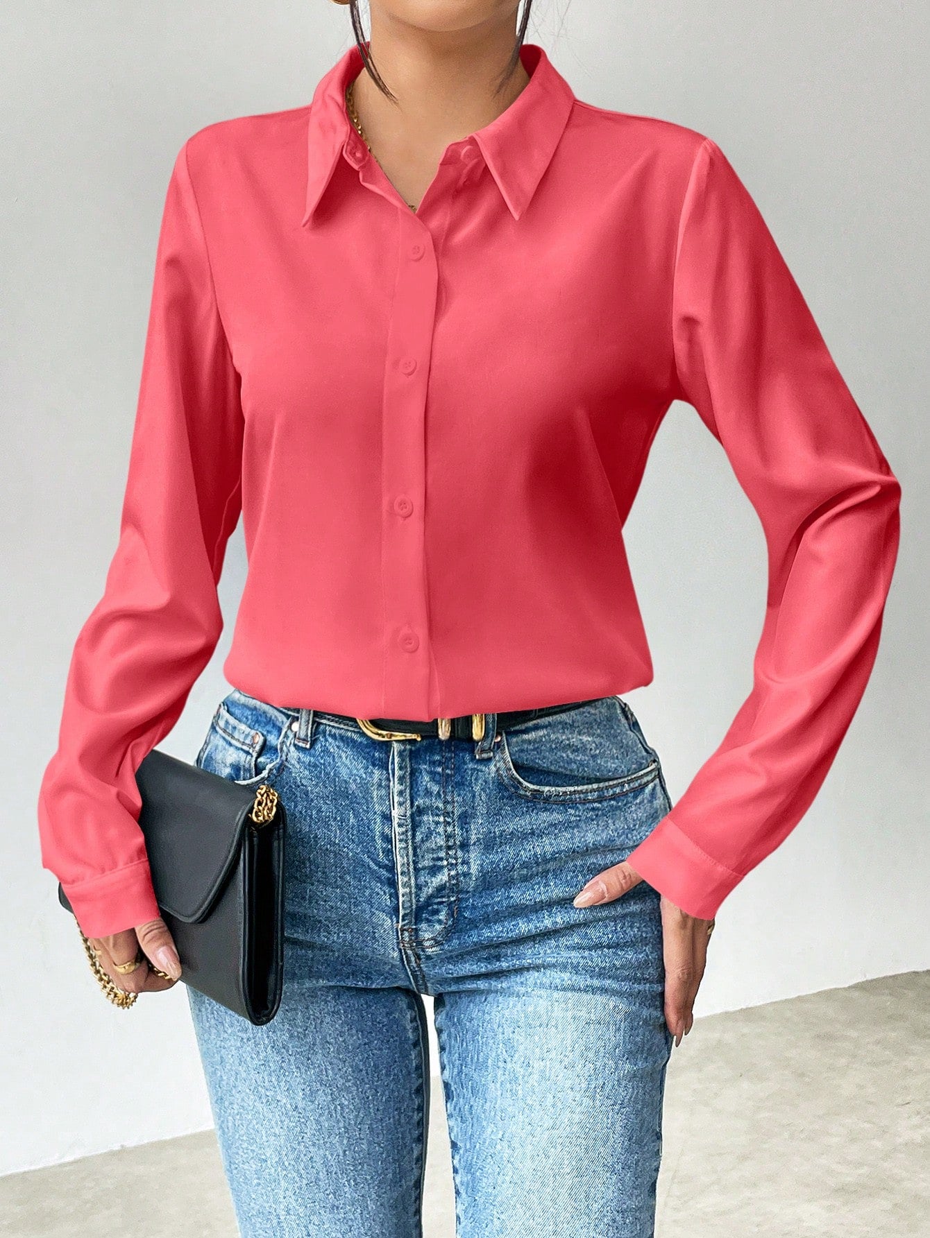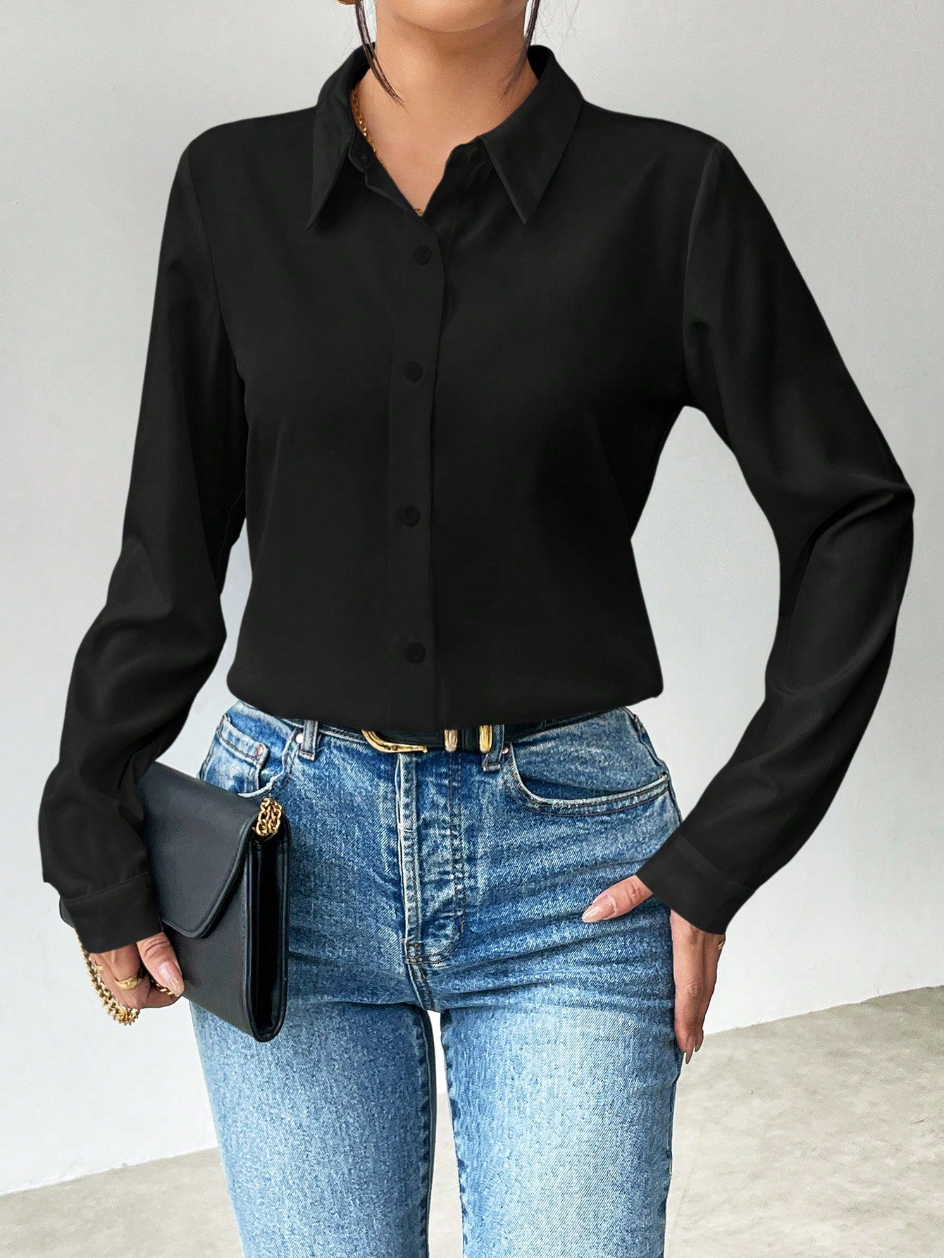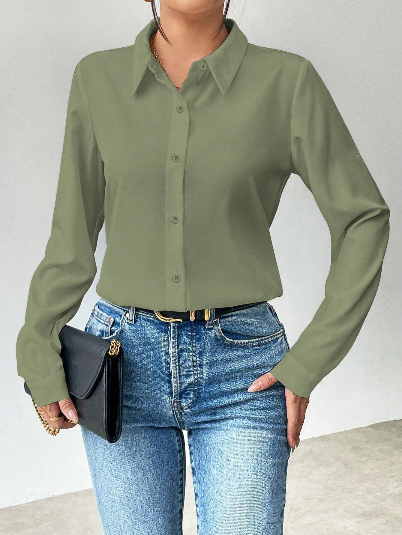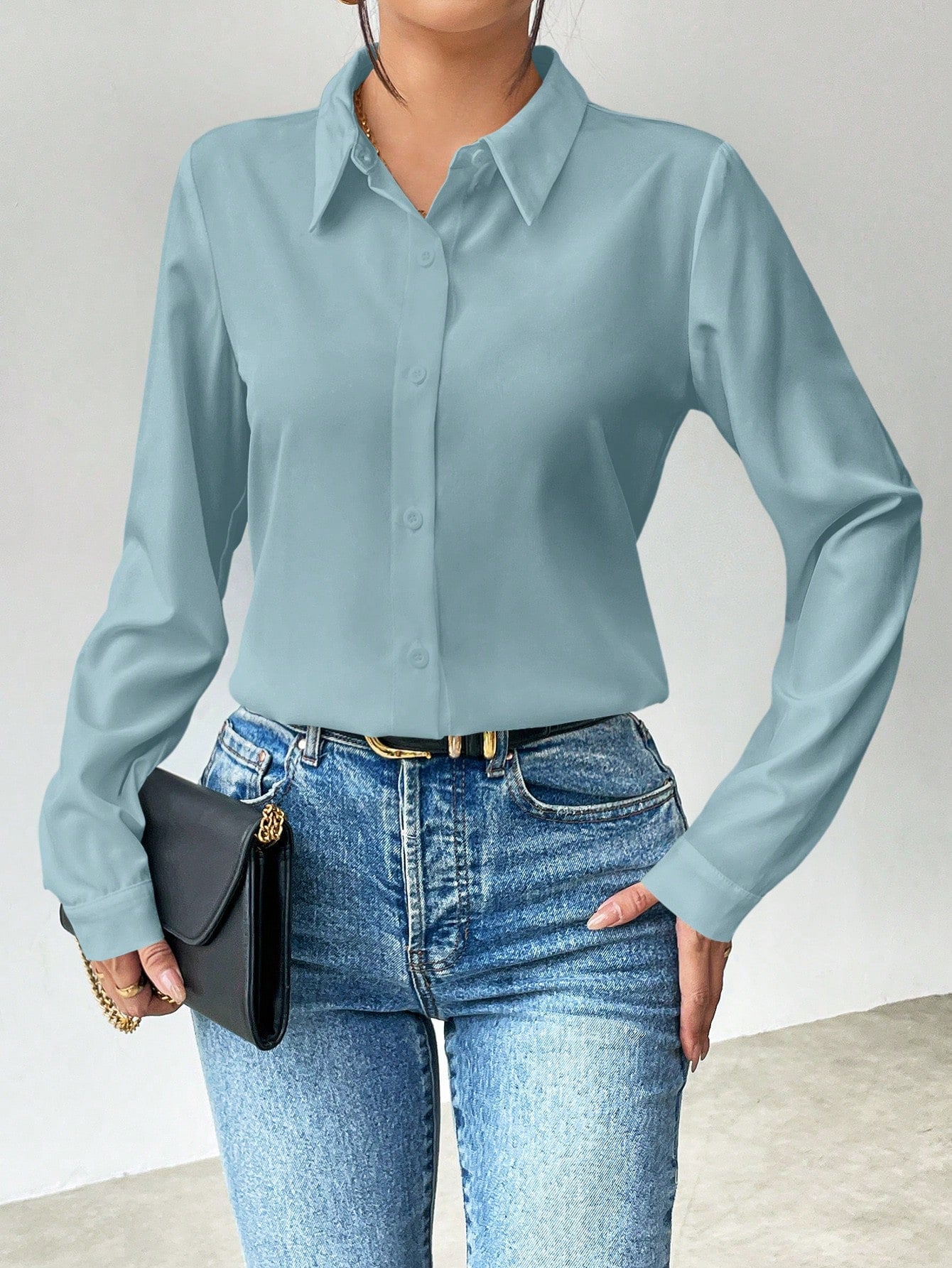 LUNE Women's Solid Color Minimalist Buttoned Shirt,Long Sleeve Tops