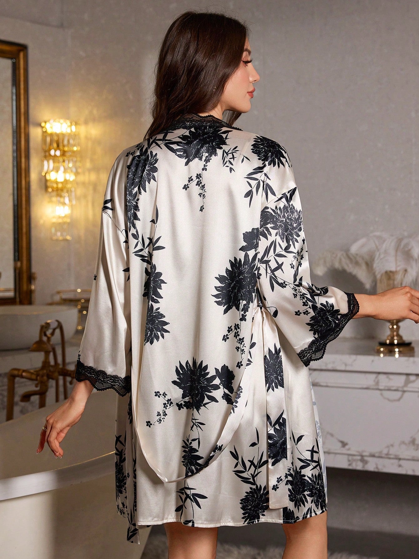LuxeNights Lace Trim Floral Print Satin Camisole Nightgown And Robe Set
