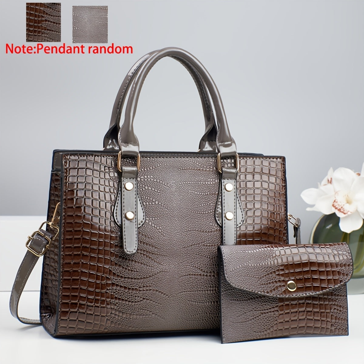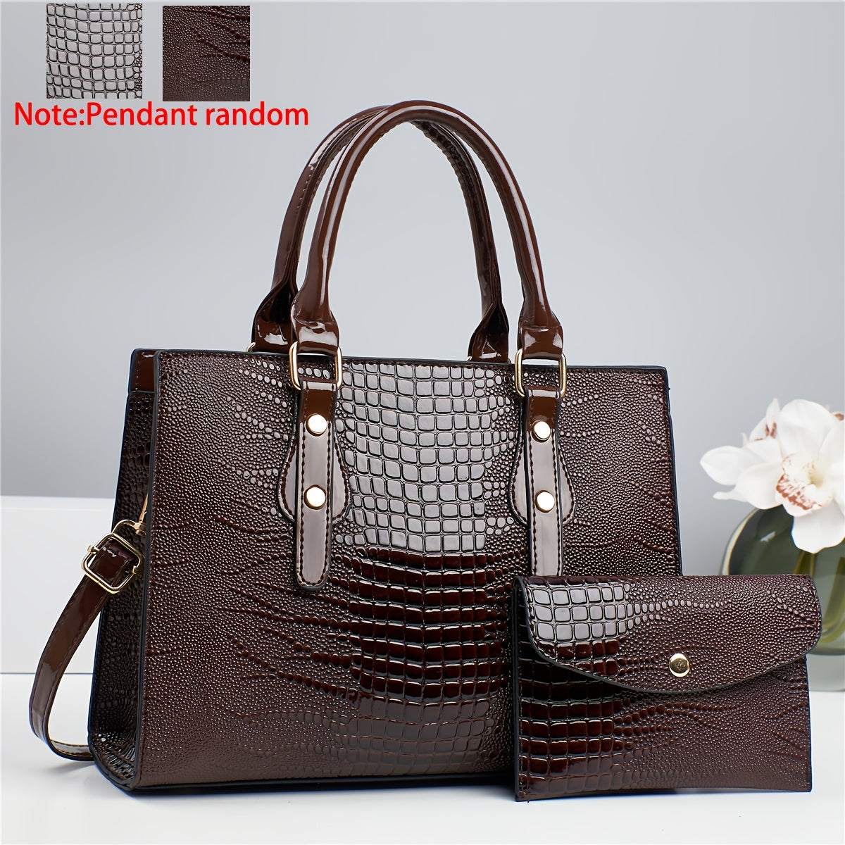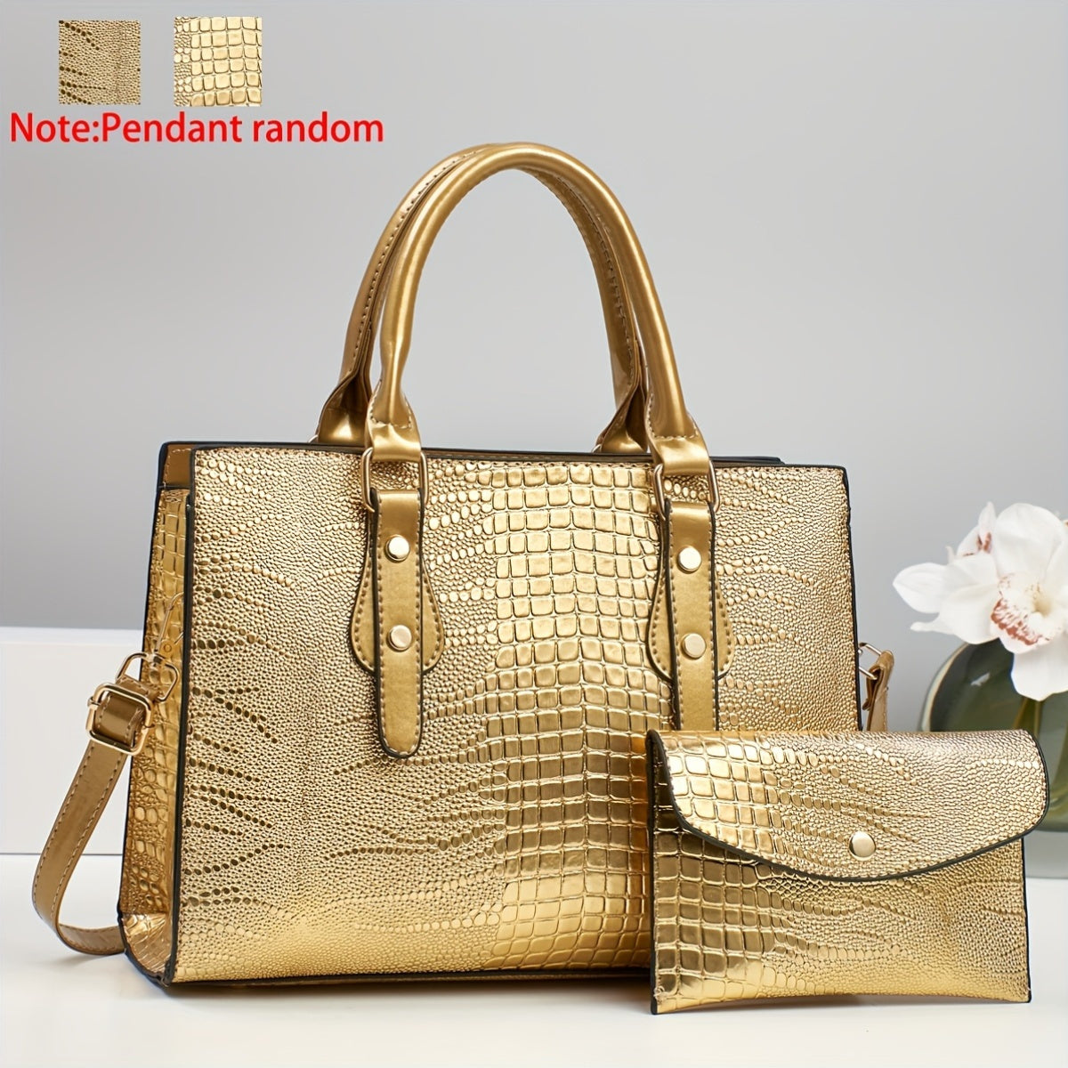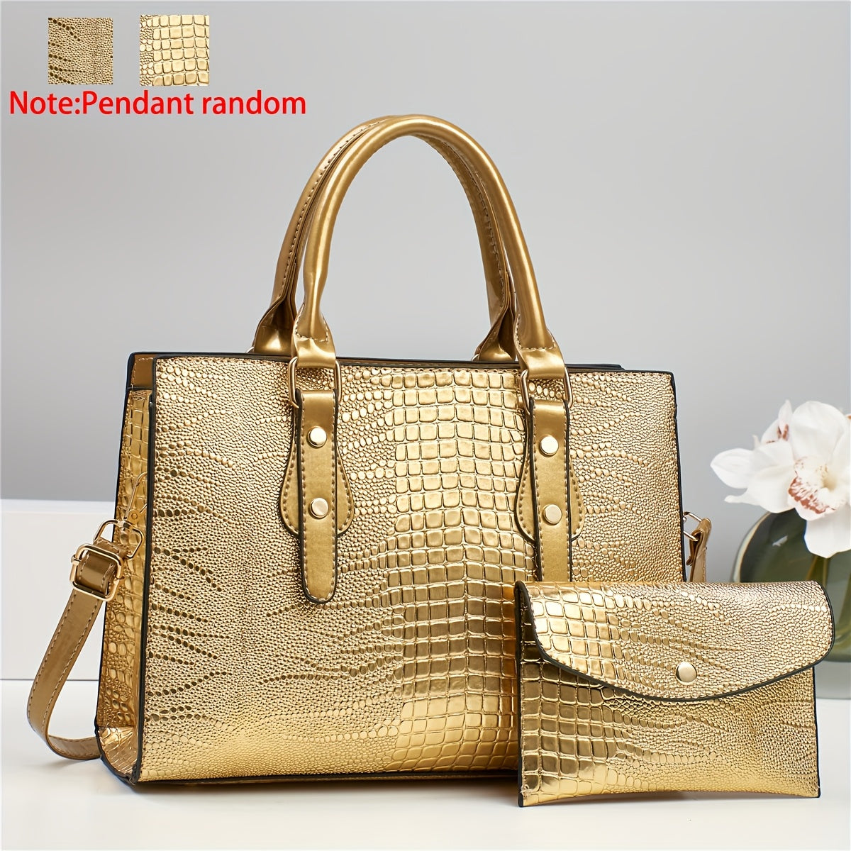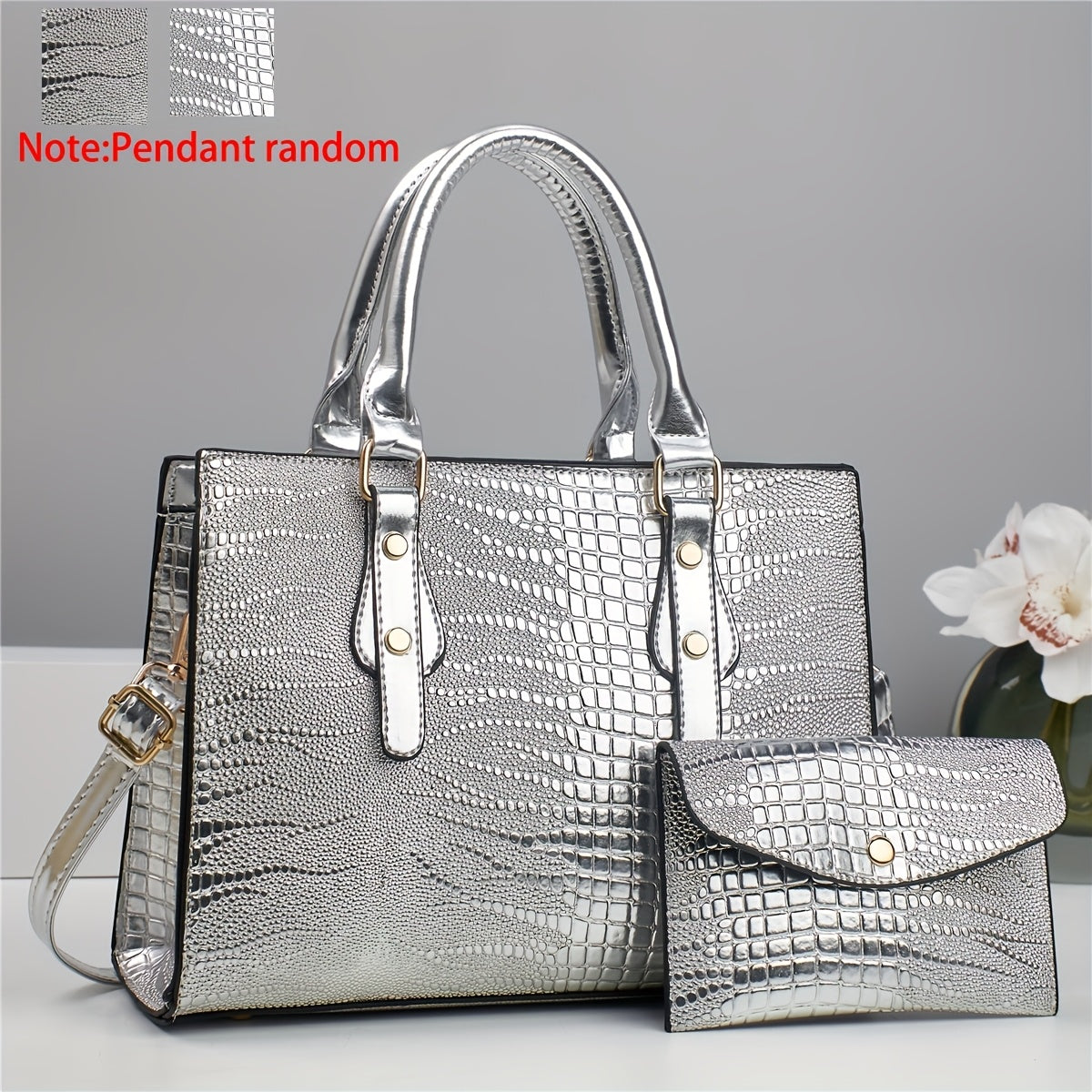 Luxurious Set Of 2 Crocodile Pattern Handbags For Women, Including A High-end Silvery Wallet, A Shiny Leather Fashion Tote Bag With Rivet Decoration, Zipper Closure, Large Capacity Shoulder Bag, Perfect For Valentine's Day Gift, Versatile Choice For Work