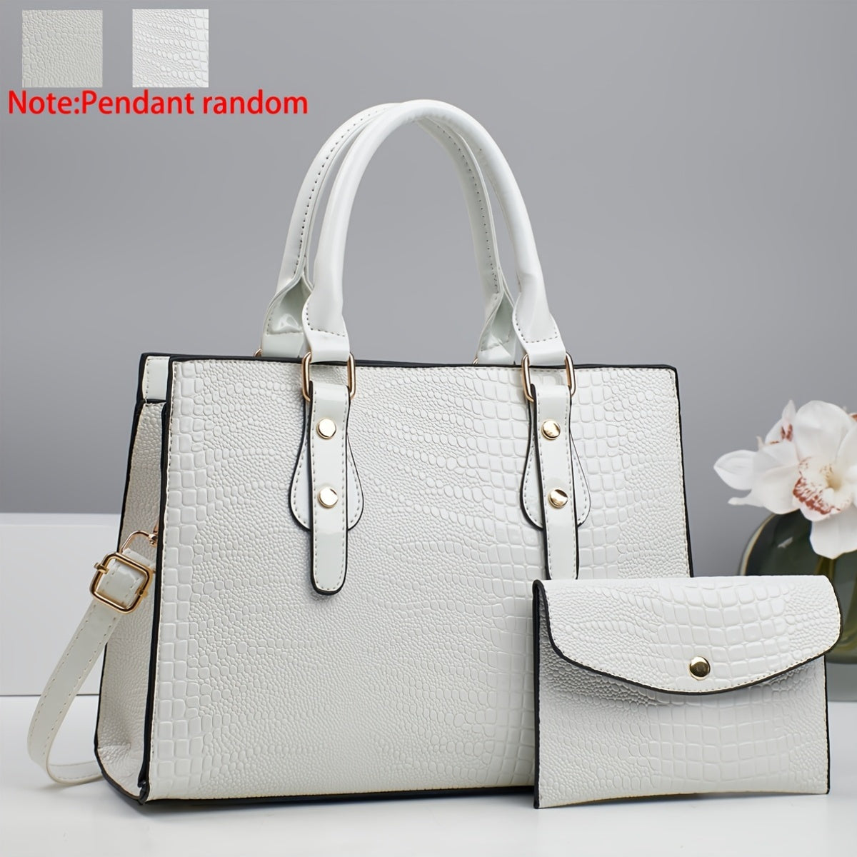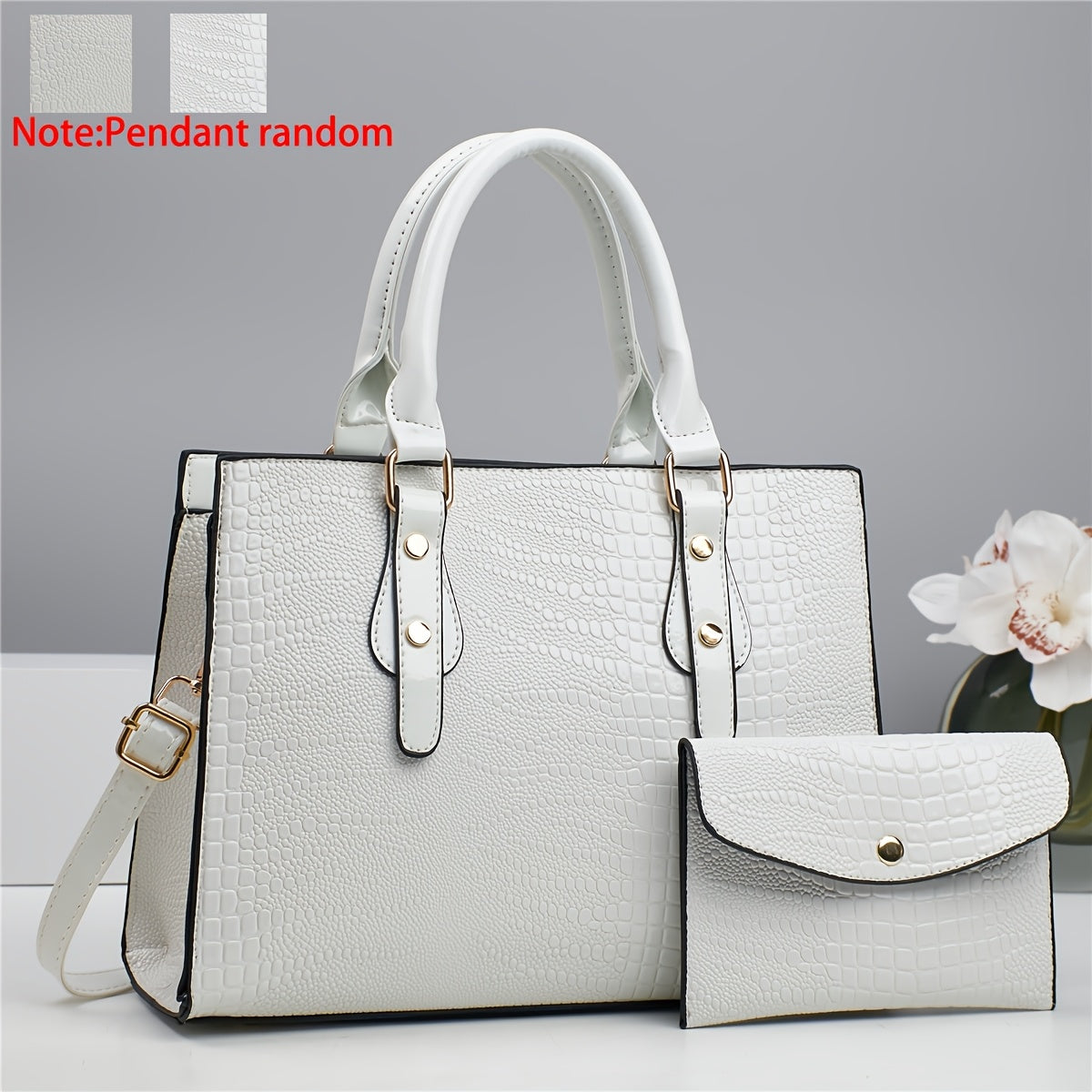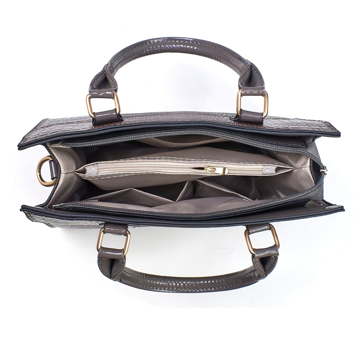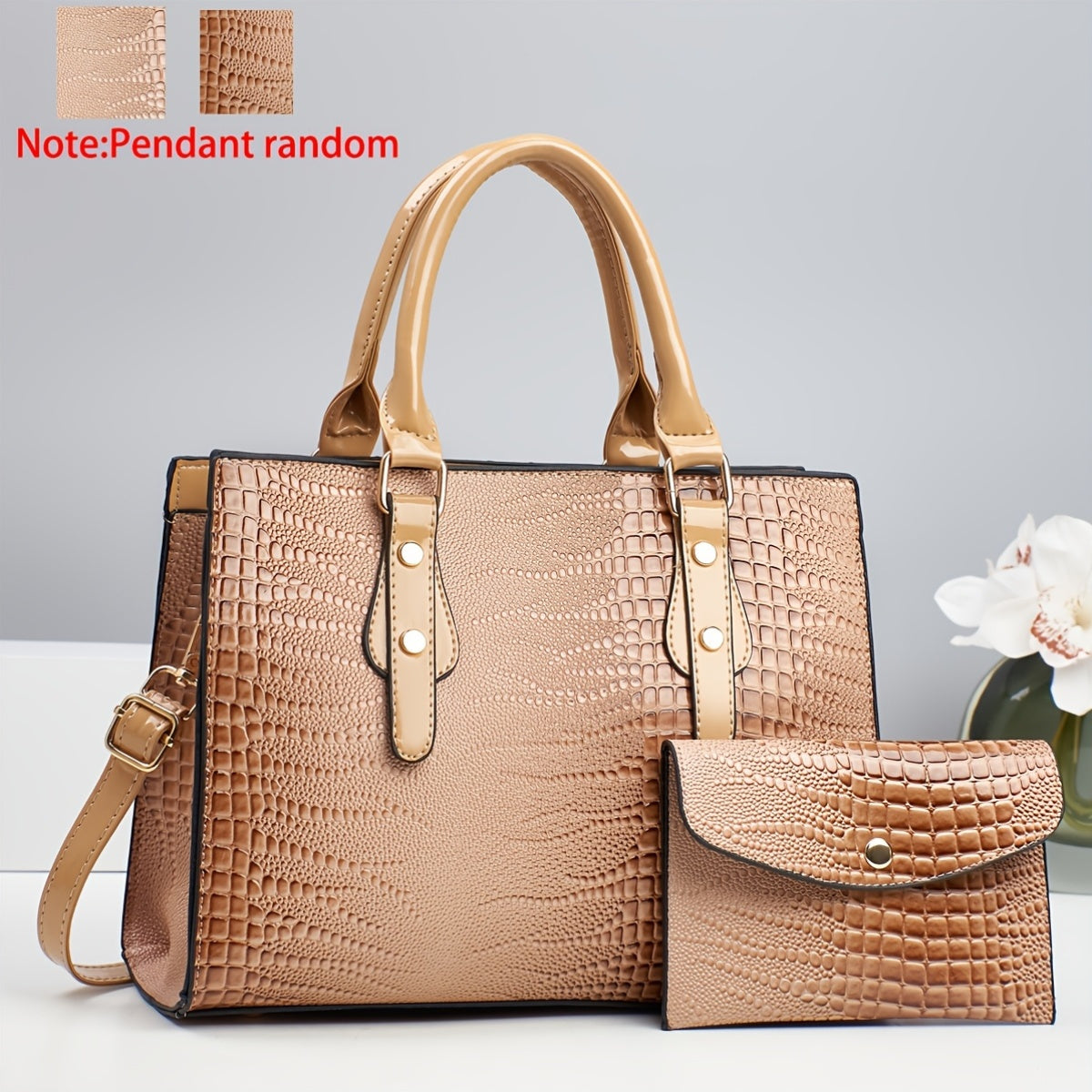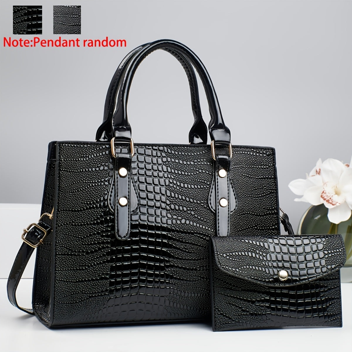 Luxurious Set Of 2 Crocodile Pattern Handbags For Women, Including A High-end Silvery Wallet, A Shiny Leather Fashion Tote Bag With Rivet Decoration, Zipper Closure, Large Capacity Shoulder Bag, Perfect For Valentine's Day Gift, Versatile Choice For Work
