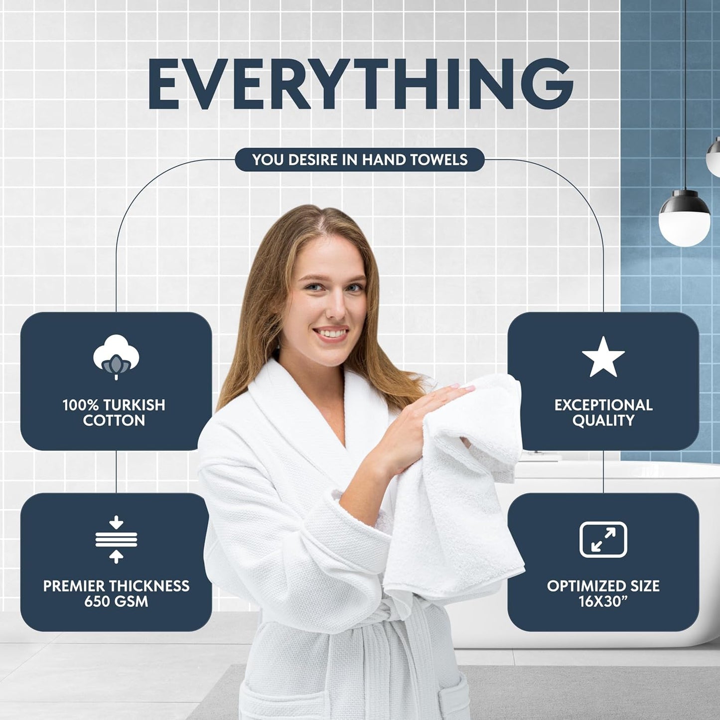 Luxury White Hand Towels - Soft 100% Turkish Cotton | Highly Absorbent Hotel spa Bathroom Towel Collection | 16x30 Inch | Set of 6