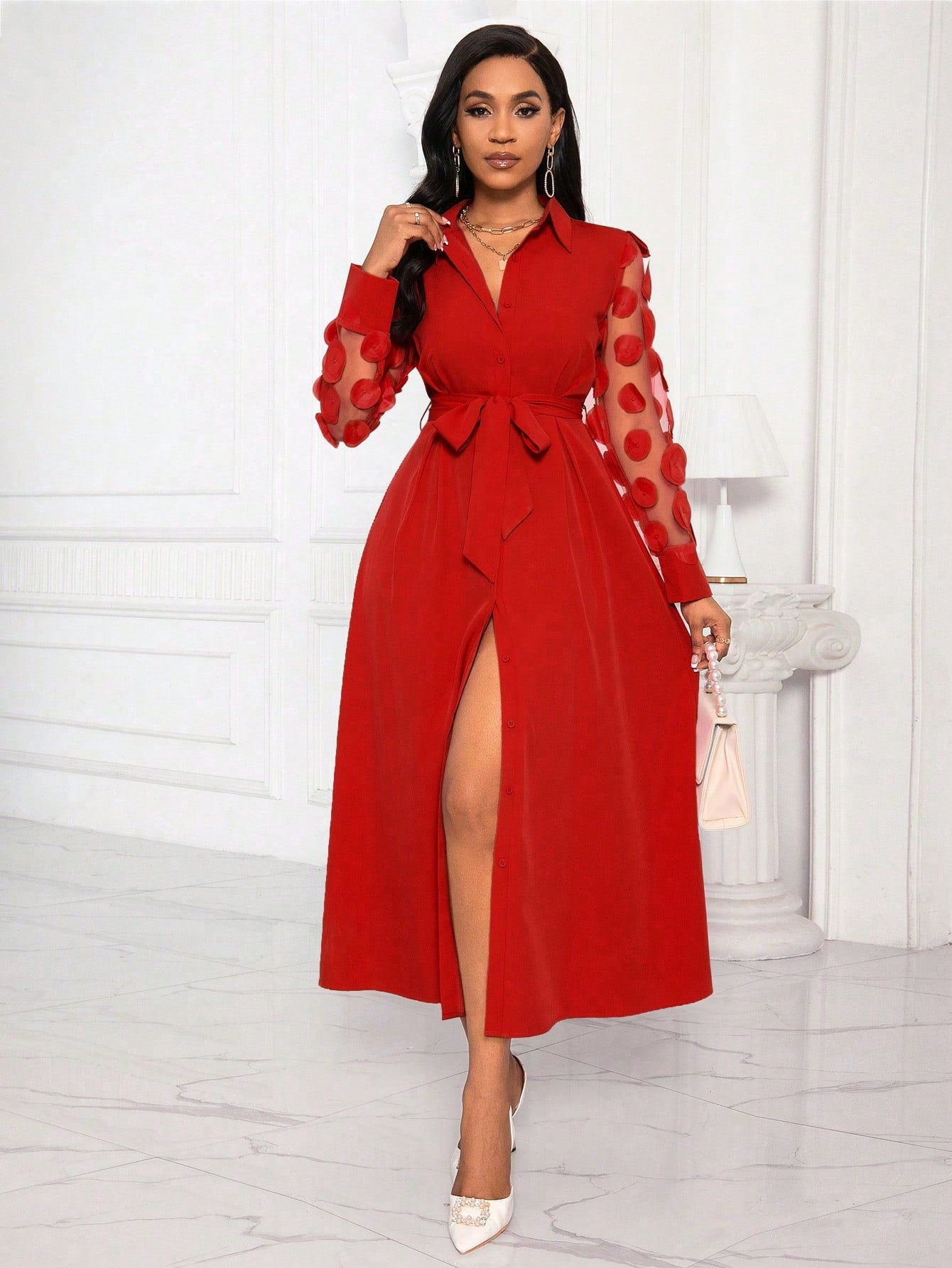 Lyxana Women's Solid Color Patchwork Floral Applique Front Button Long Sleeve Casual Dress, Vacation Maxi Women Outfit