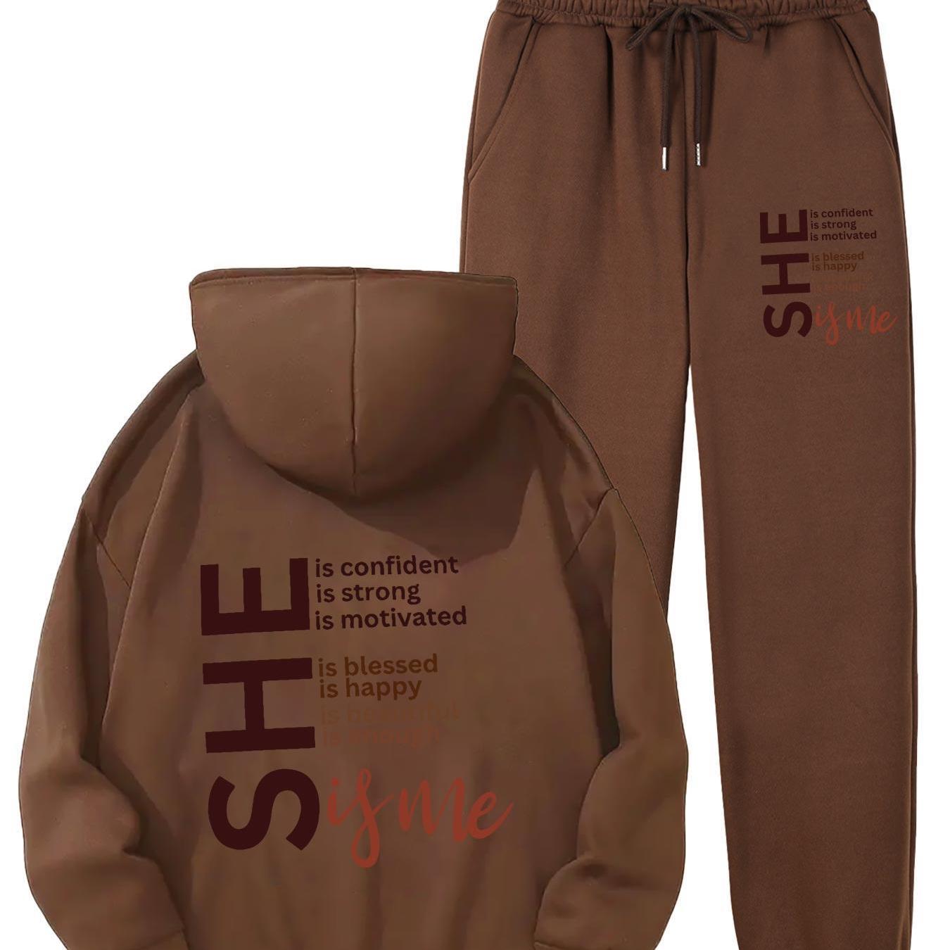 Machine Washable Fleece-Lined Women's Hoodie & Sweatpants Set with Letter Print, Pocket Detail, Polyester