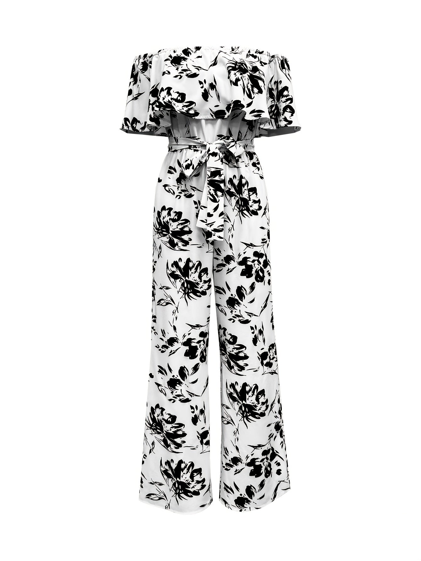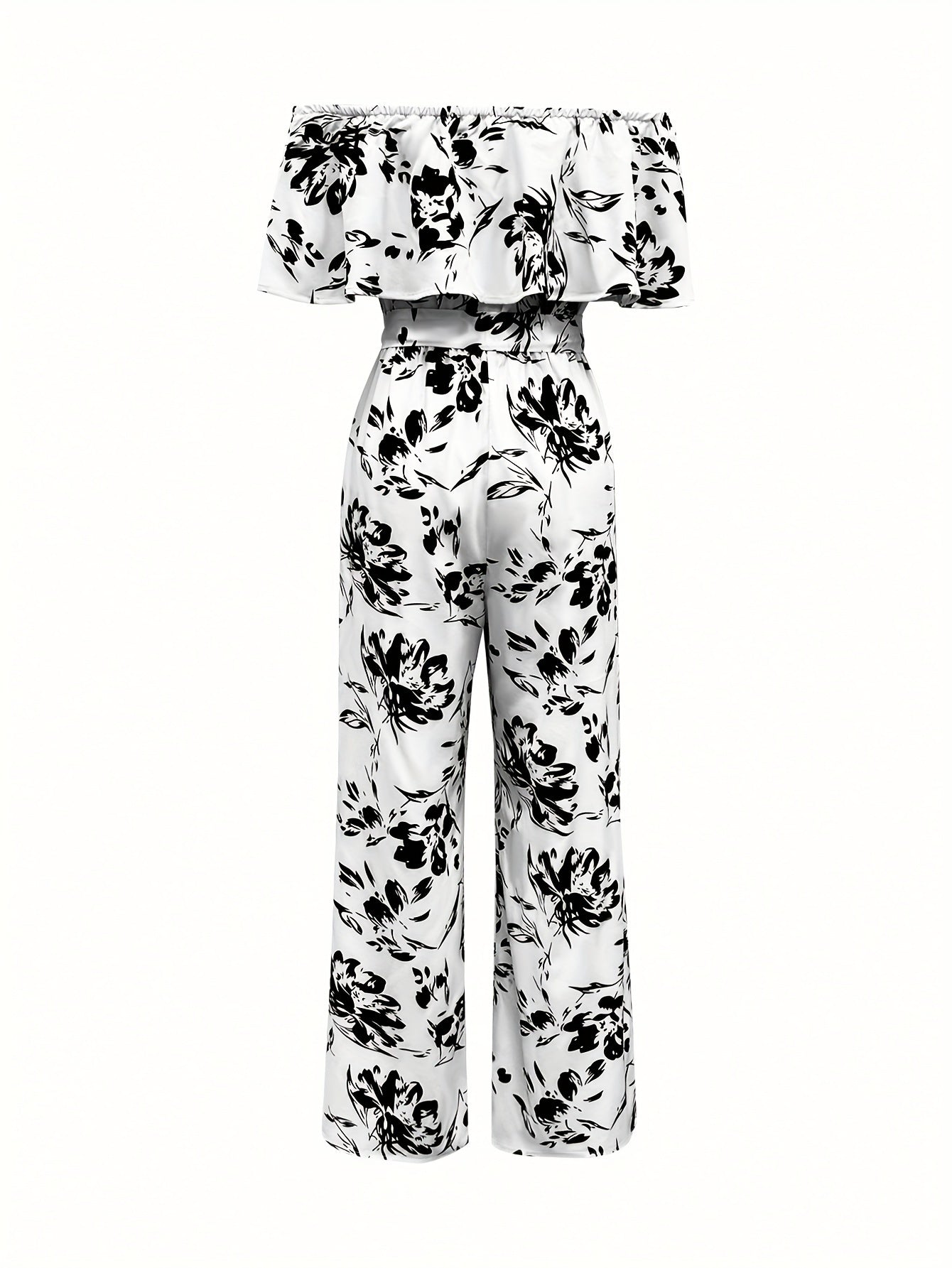 [Machine Washable Polyester Jumpsuit] Elegant Off-Shoulder Floral Print Jumpsuit for Women - Polyester, Machine Washable, Summer Fashion