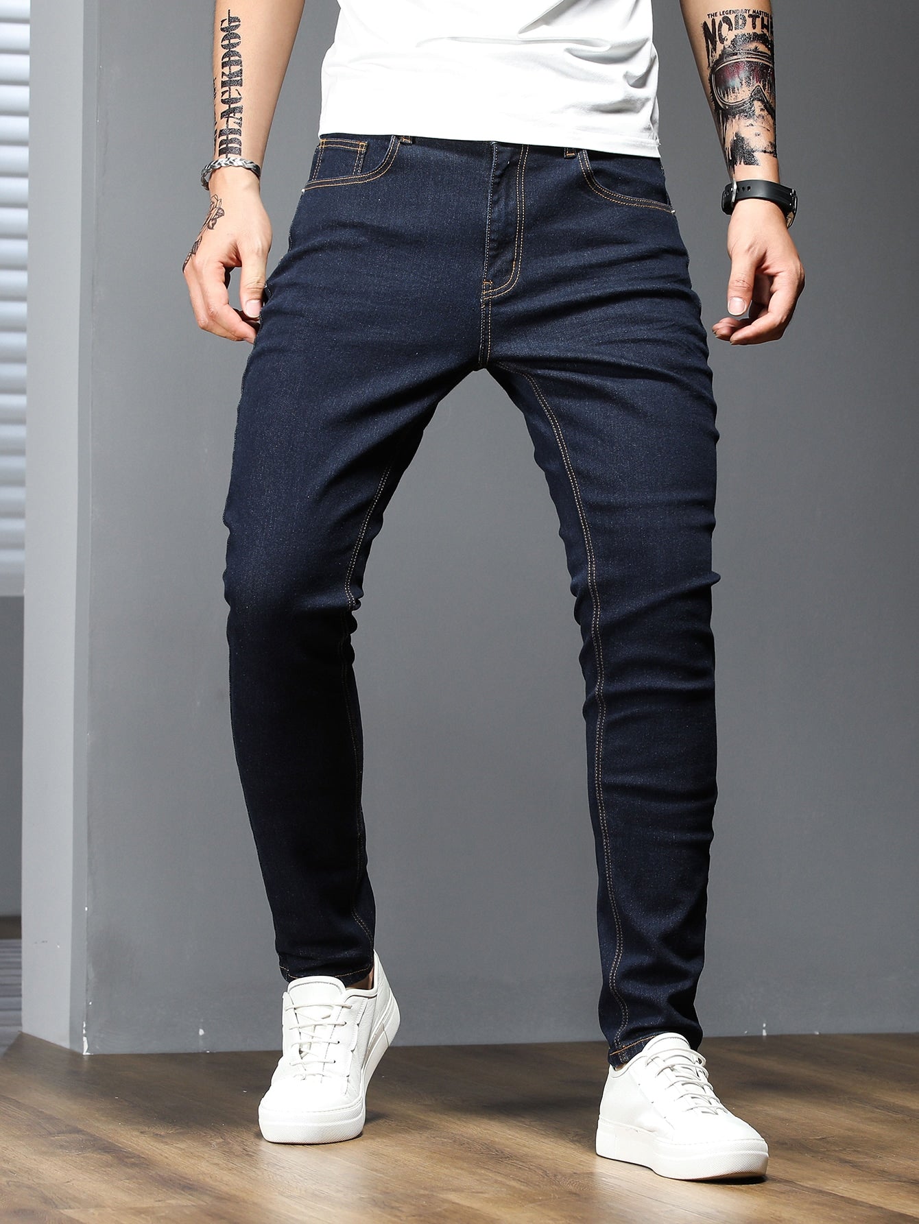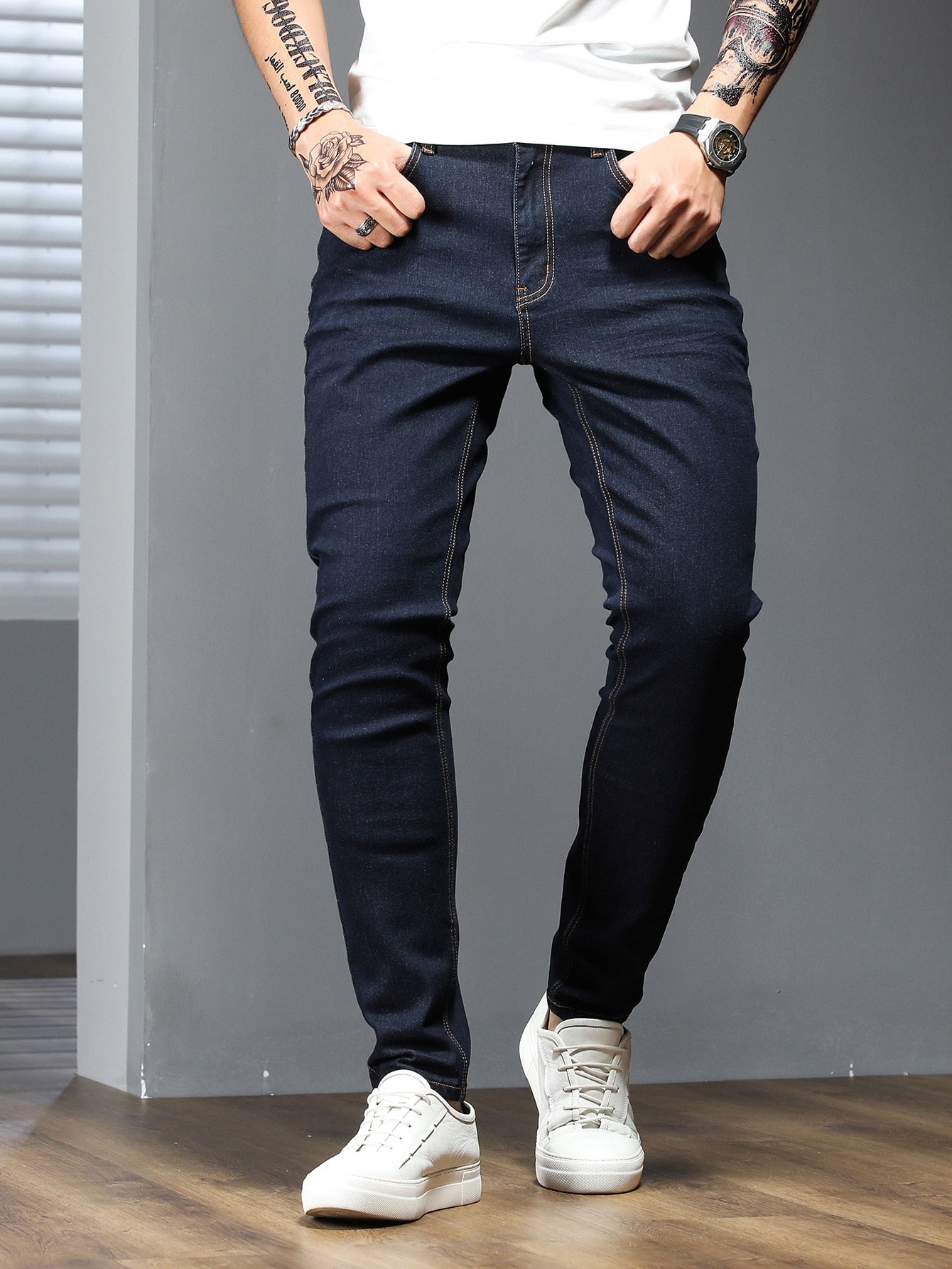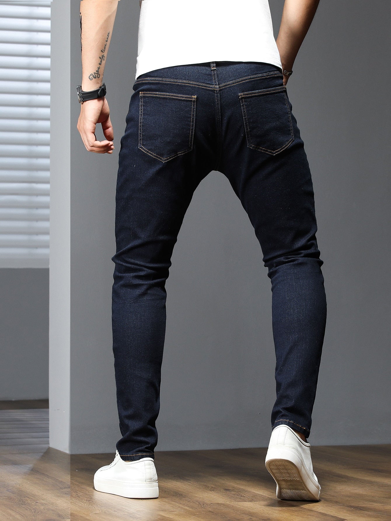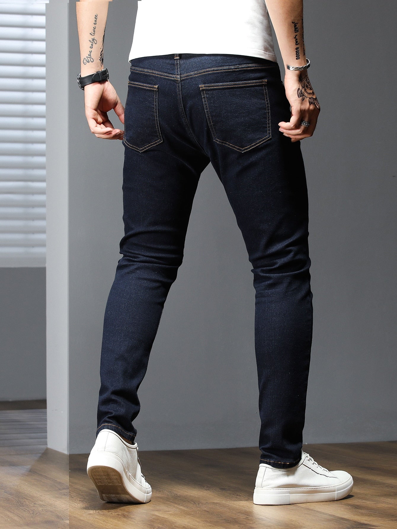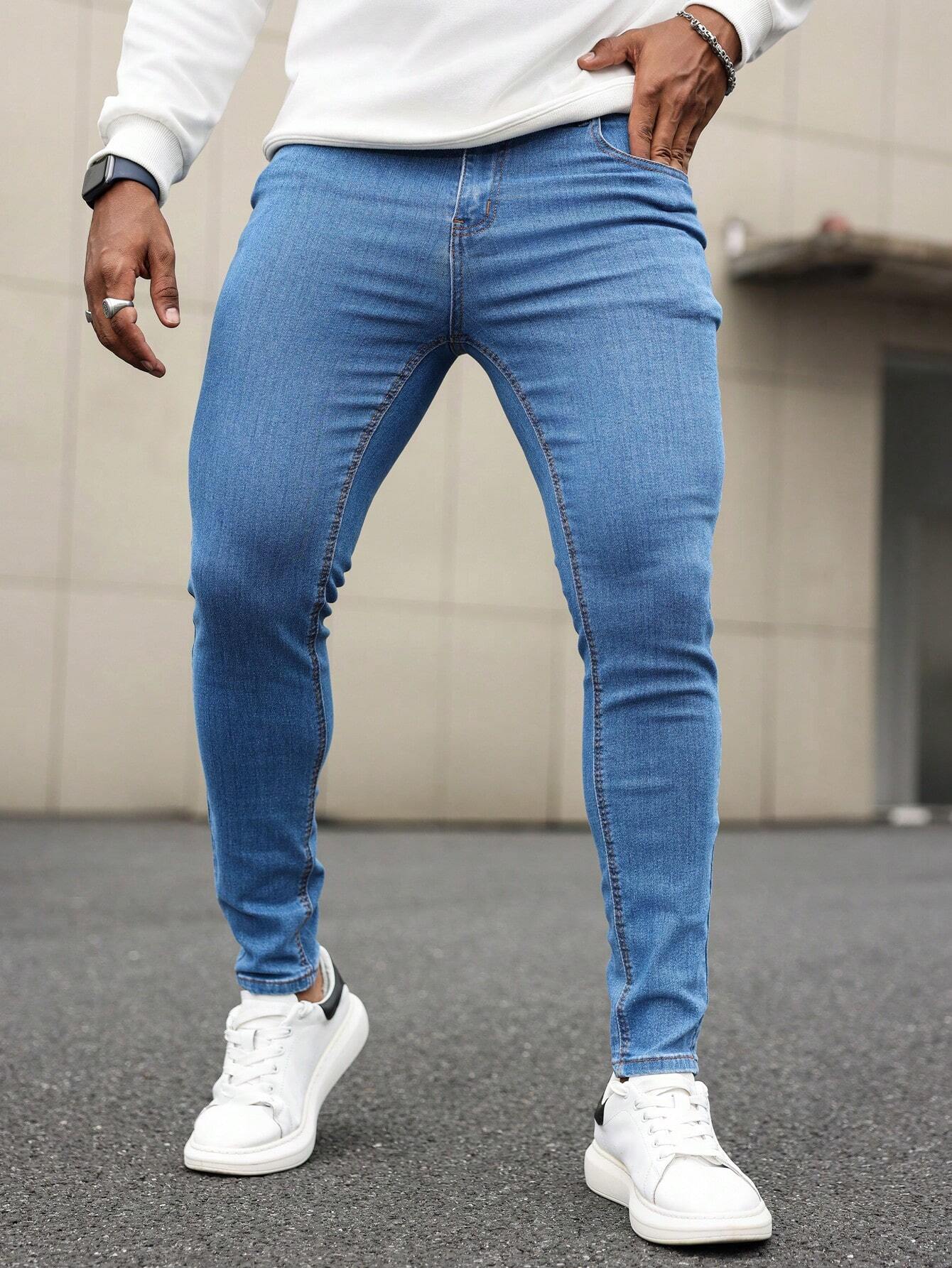 Manfinity Homme Men Cotton Solid Skinny Jeans Plain Dark Blue Slim Fit Long Dark Wash Jeans Washed Cargo Jeans, For Husband, Boyfriend Gifts