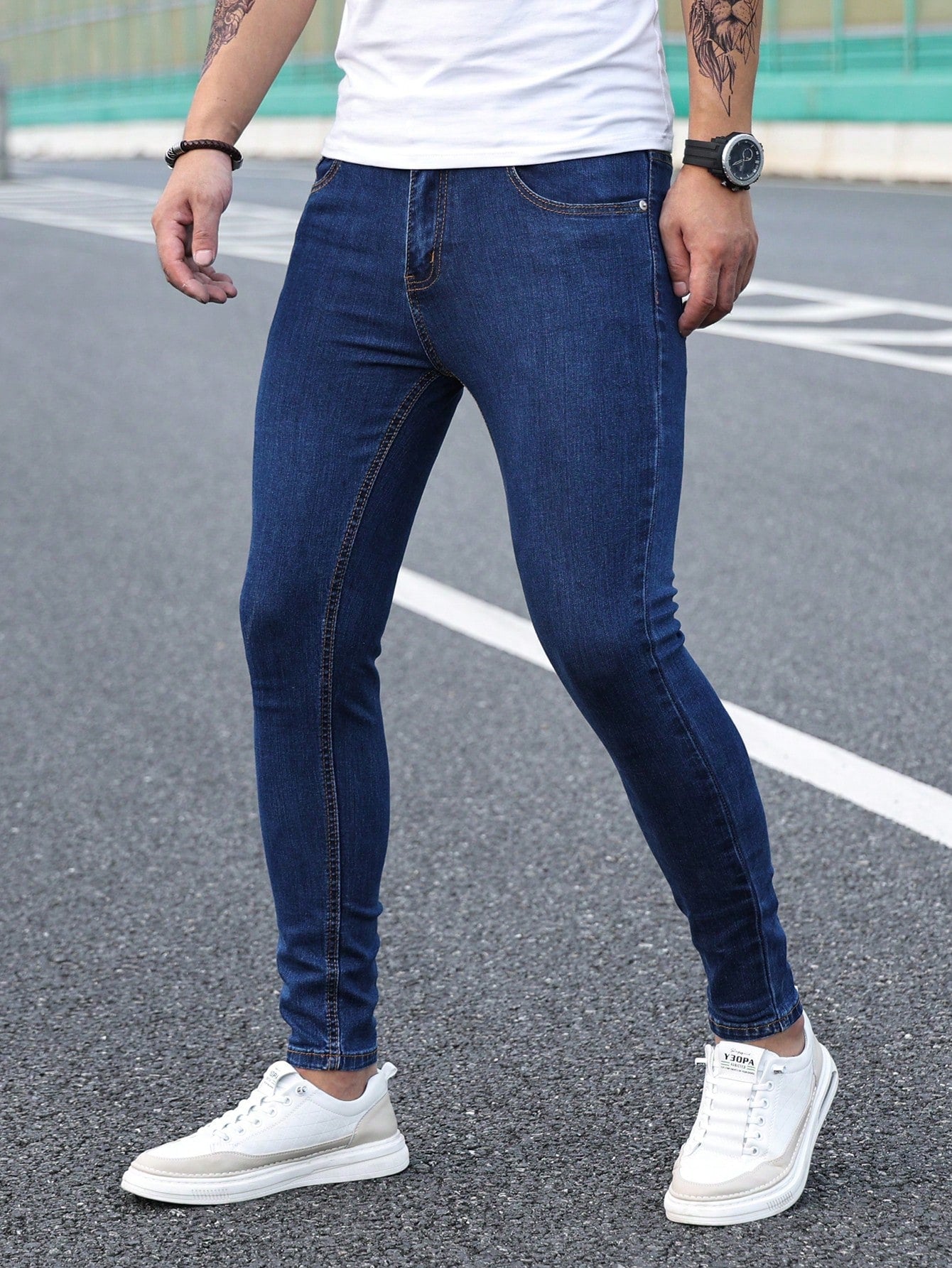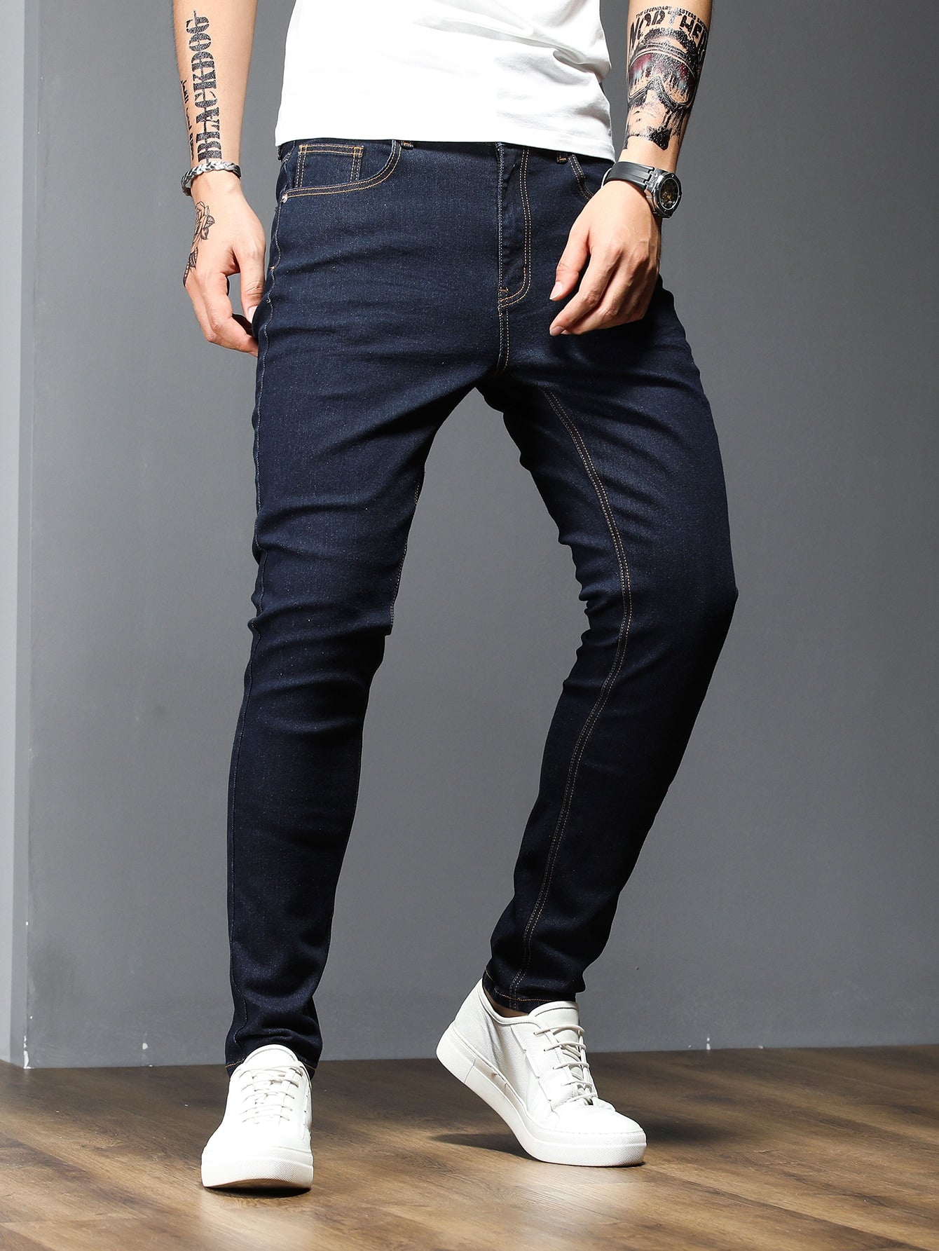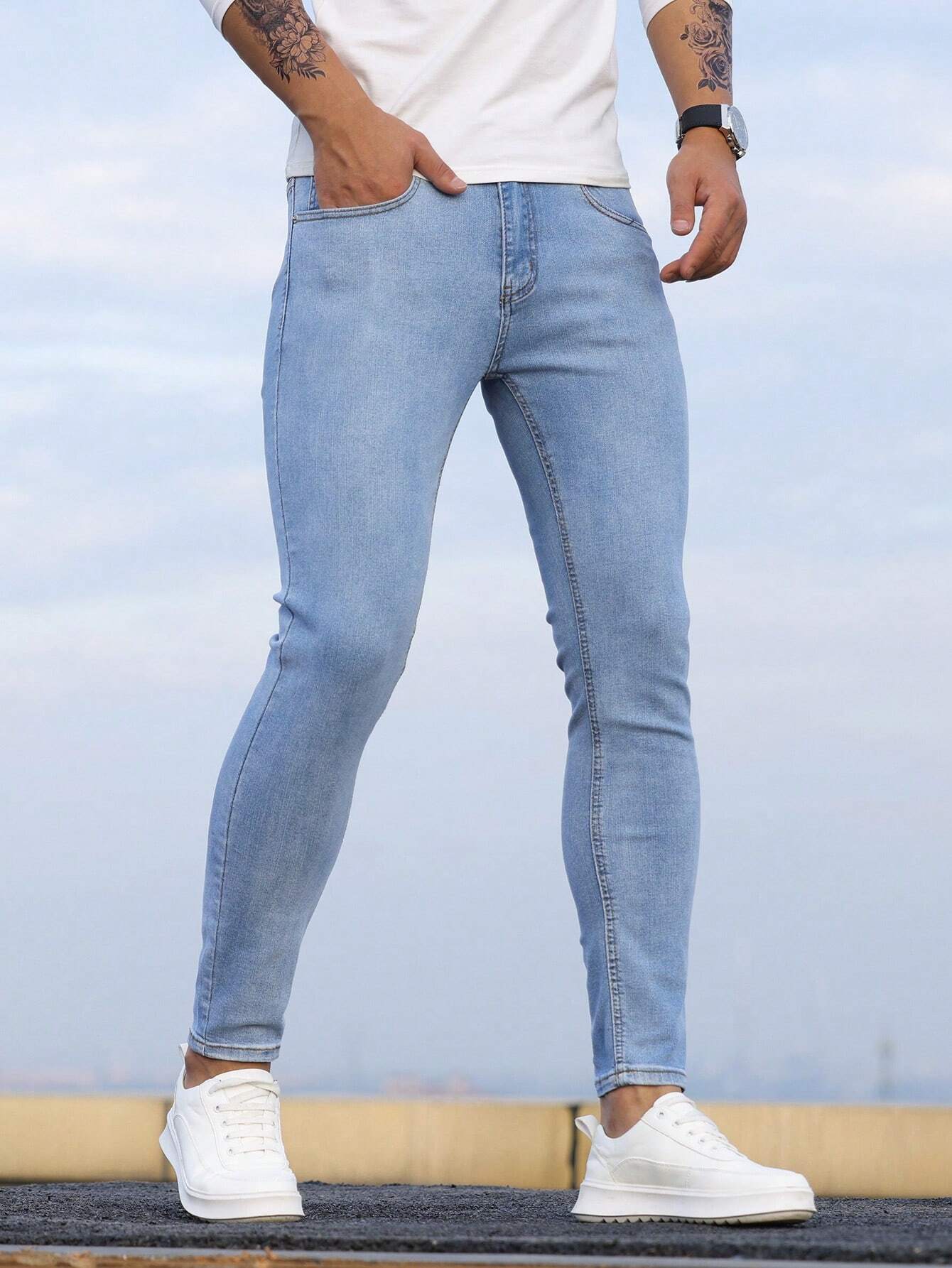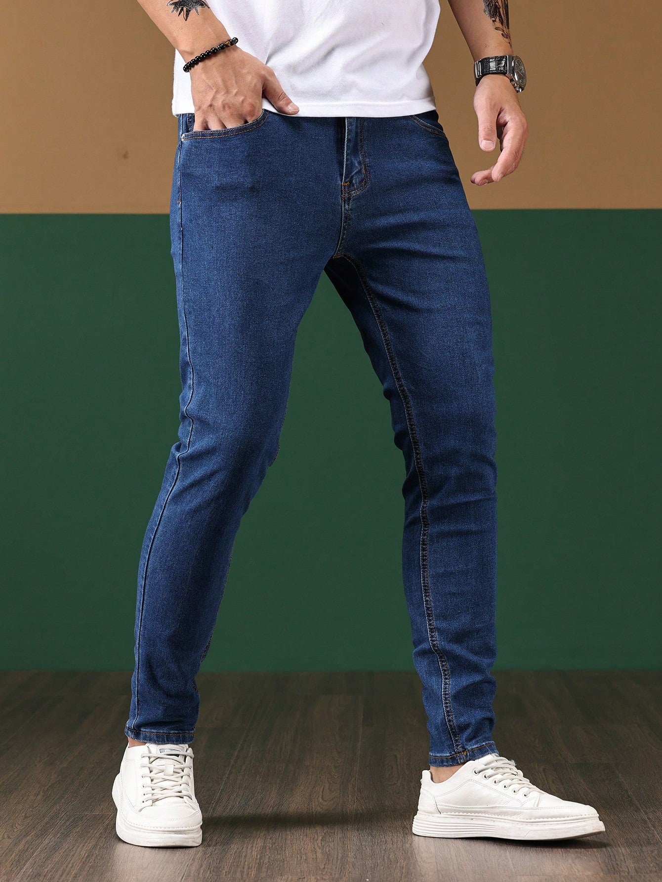 Manfinity Homme Men Cotton Solid Skinny Jeans Plain Dark Blue Slim Fit Long Dark Wash Jeans Washed Cargo Jeans, For Husband, Boyfriend Gifts