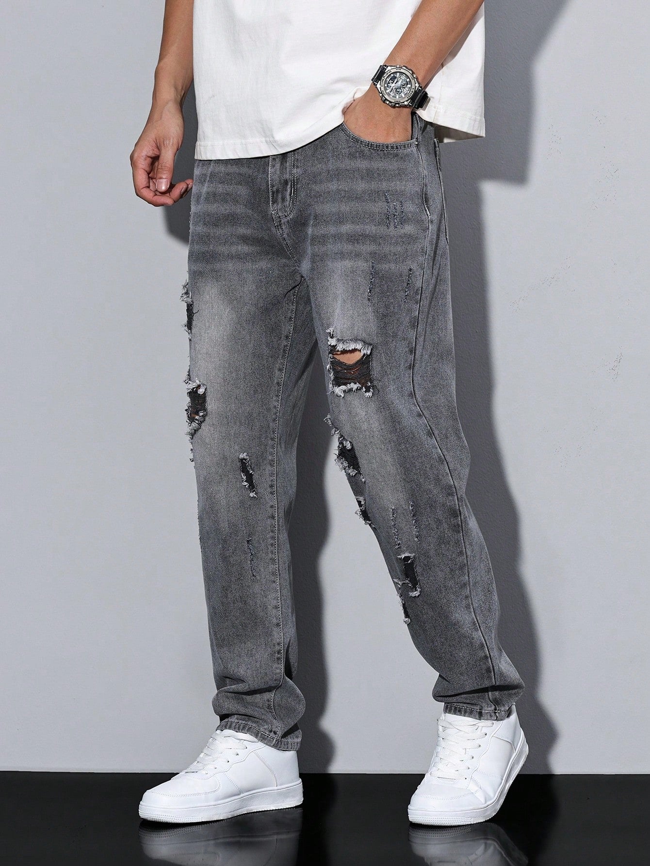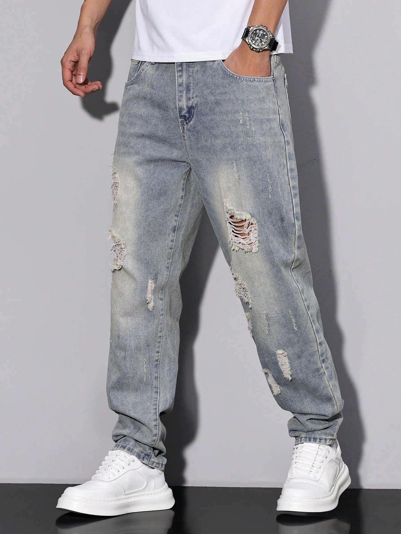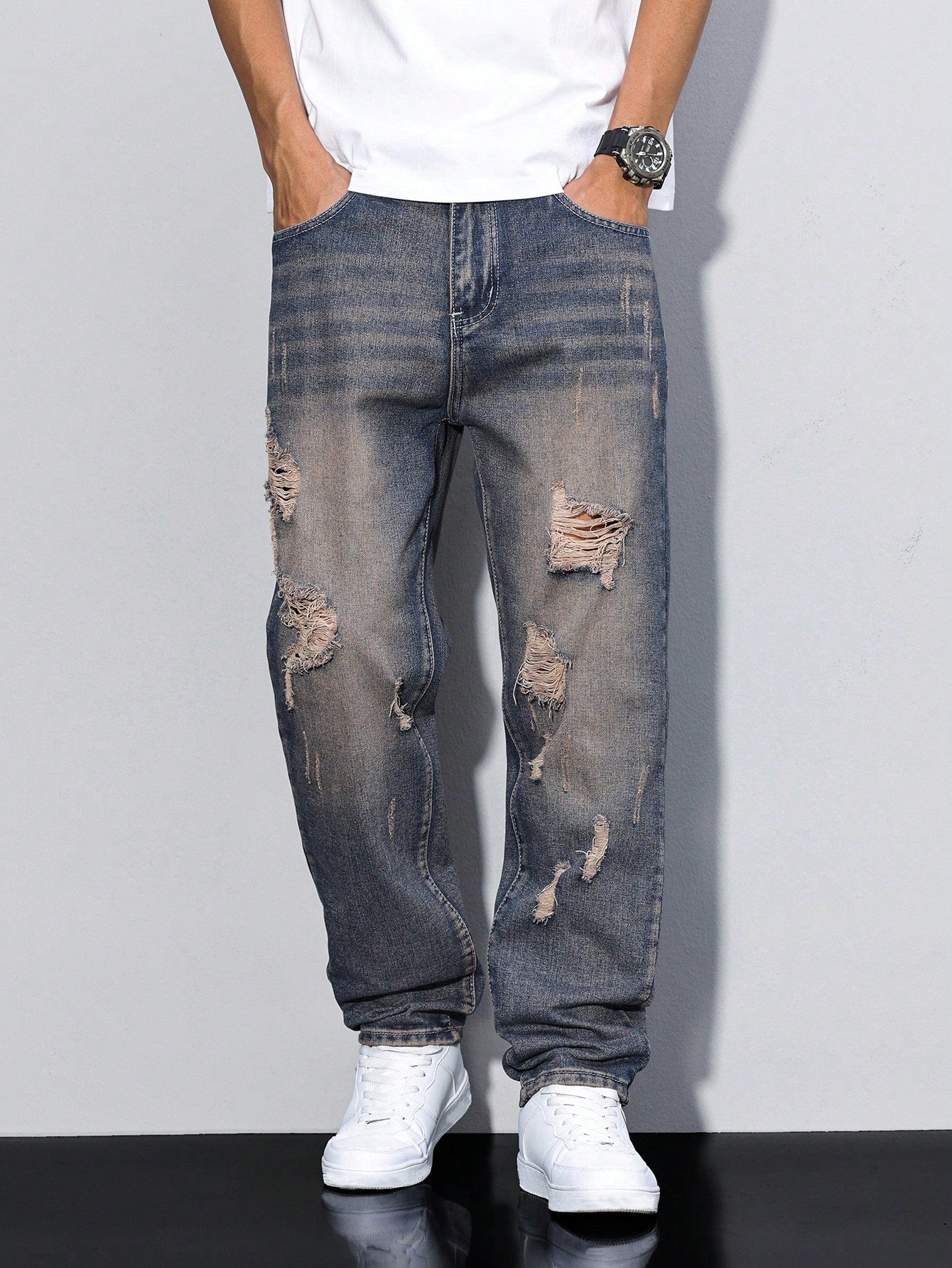 Manfinity Homme Men's Casual Loose Straight Leg Distressed Pockets Denim Jeans