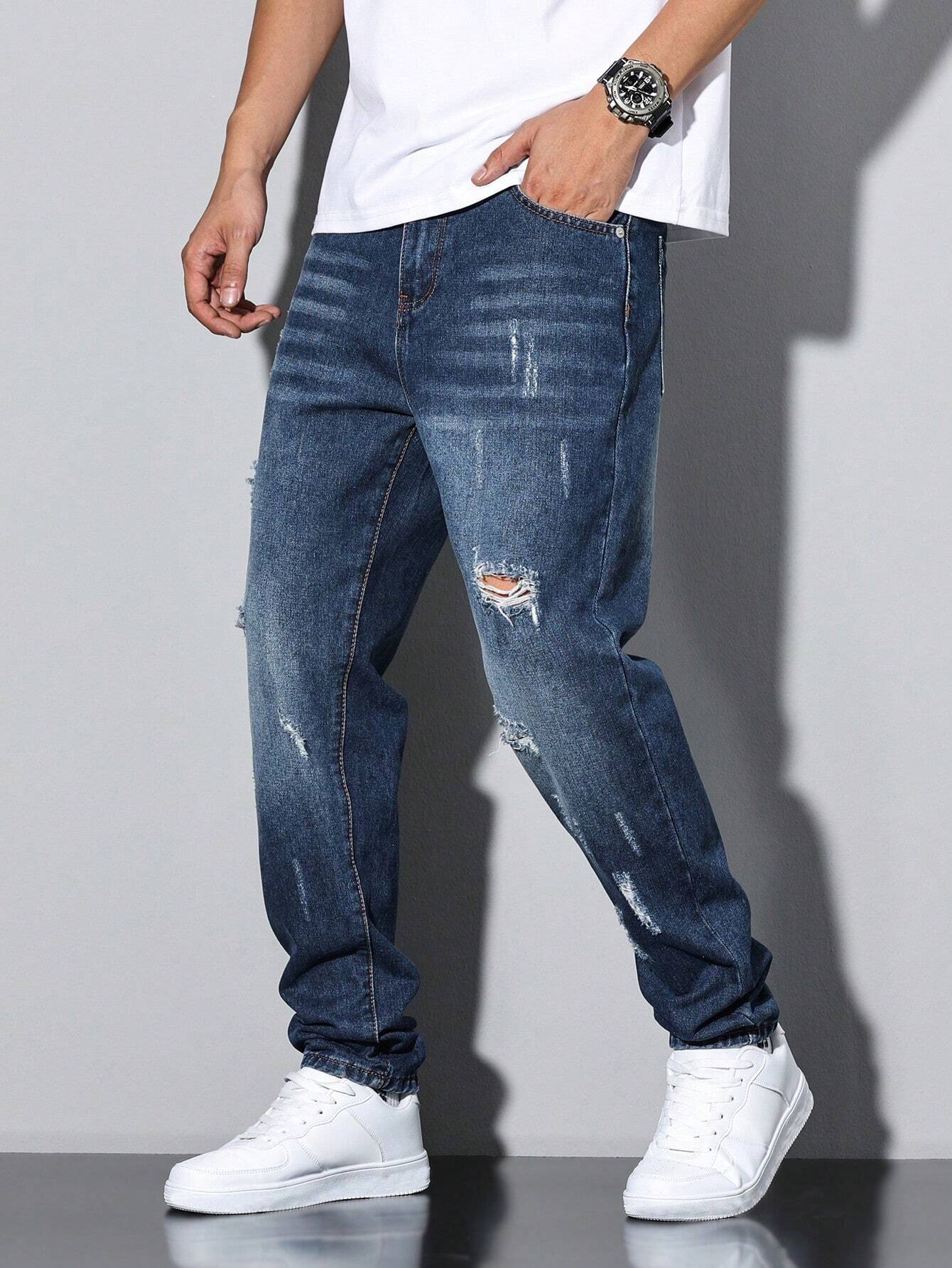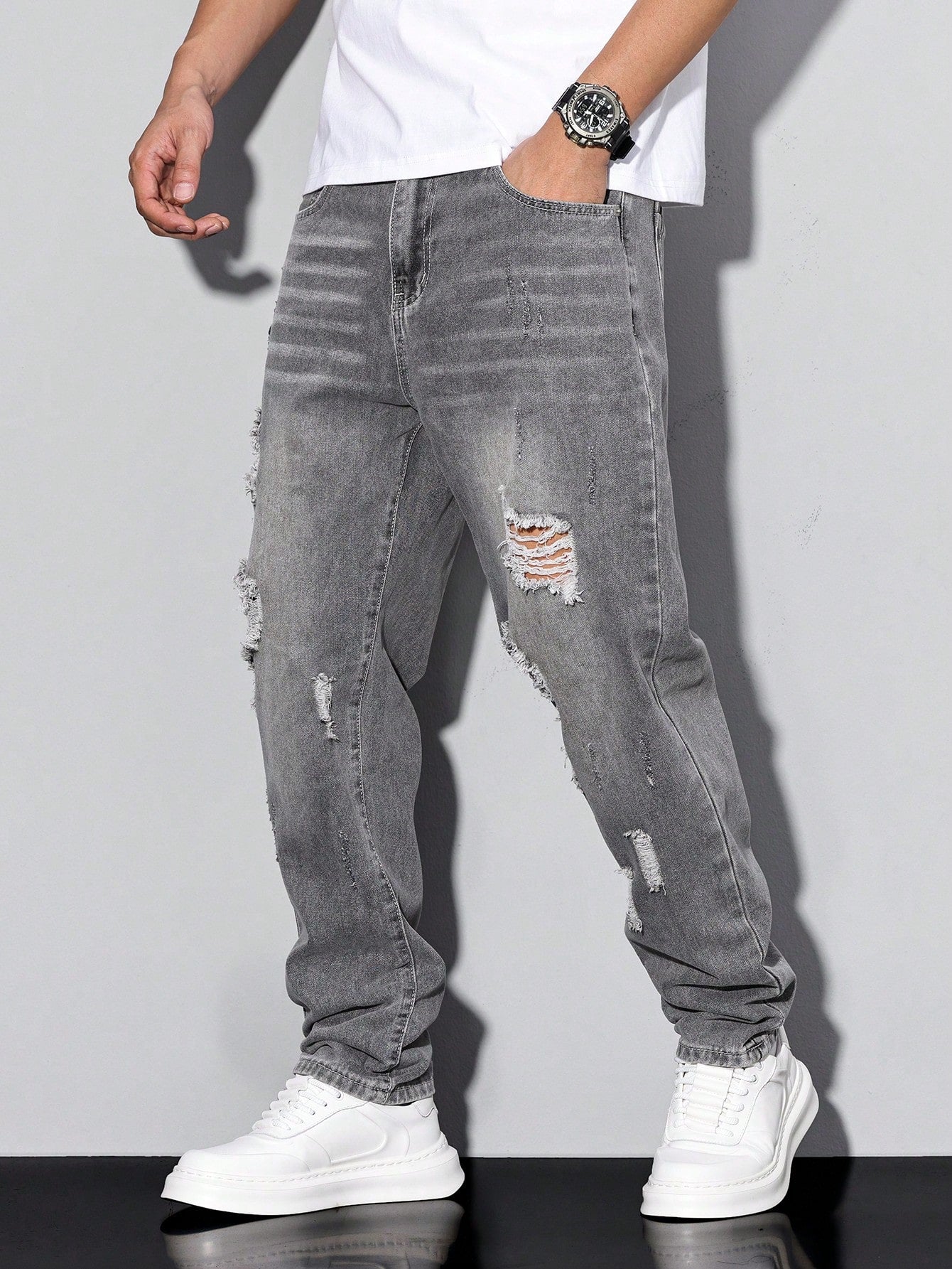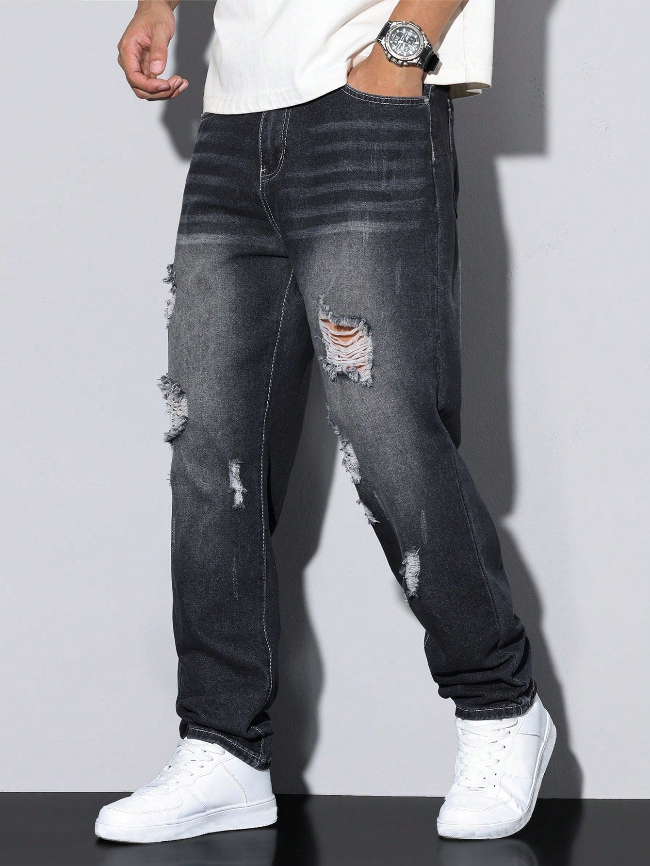 Manfinity Homme Men's Casual Loose Straight Leg Distressed Pockets Denim Jeans
