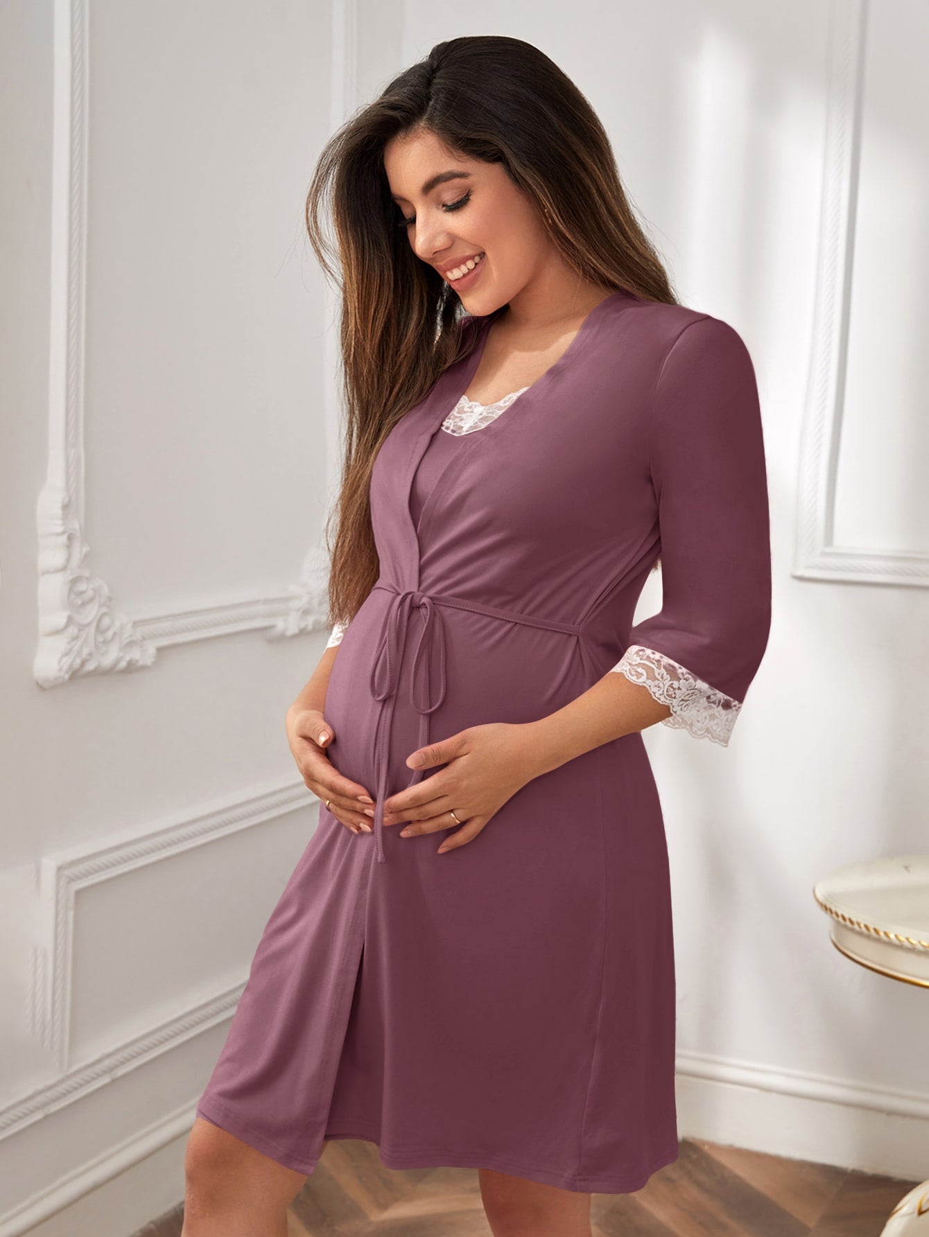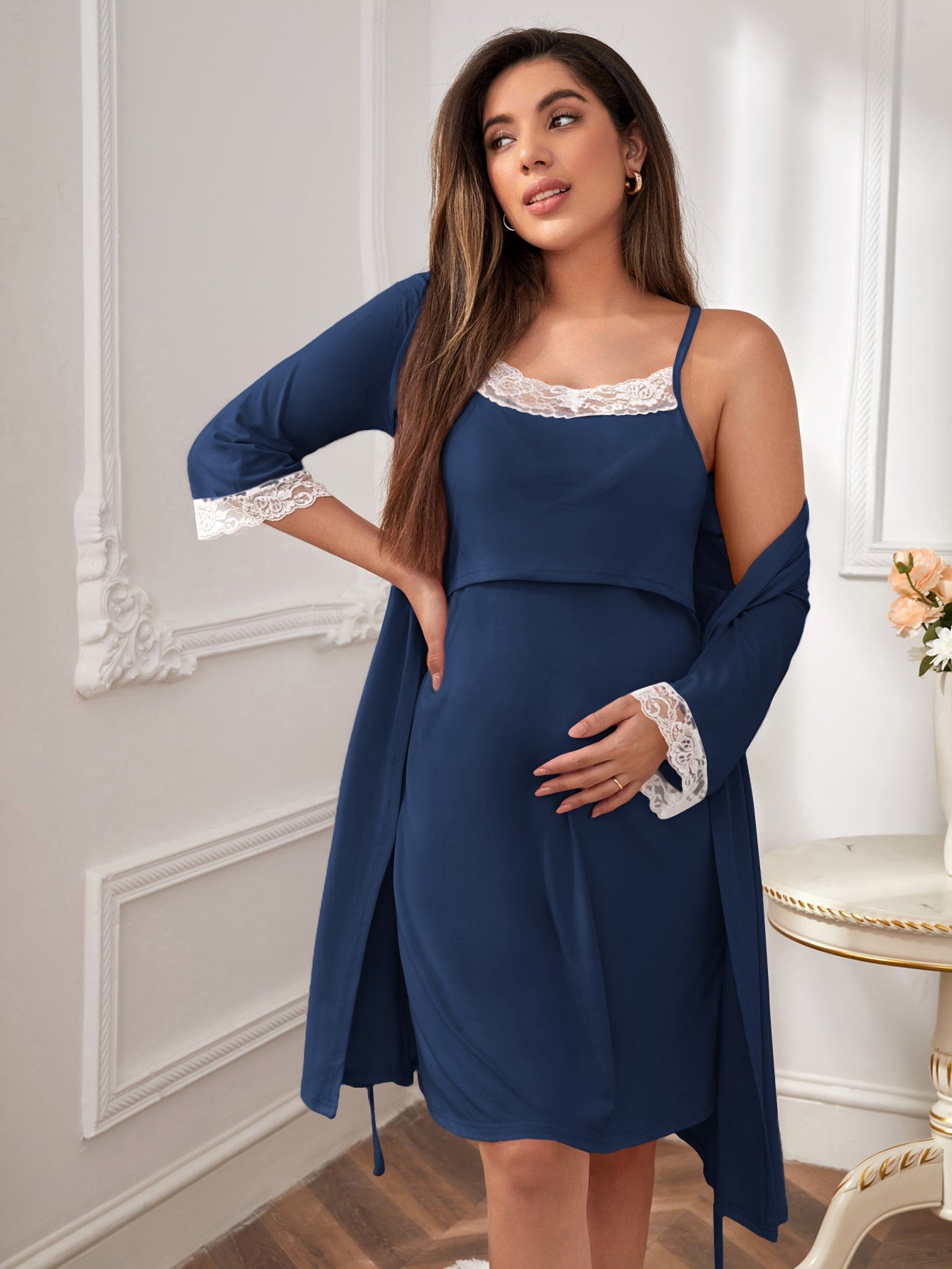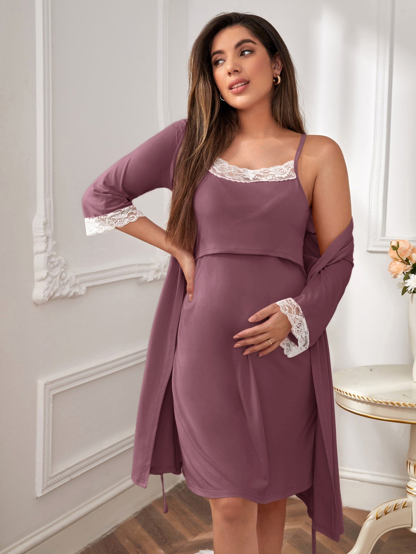 Maternity Floral Lace Trim Robe & Slip Dress For Mother