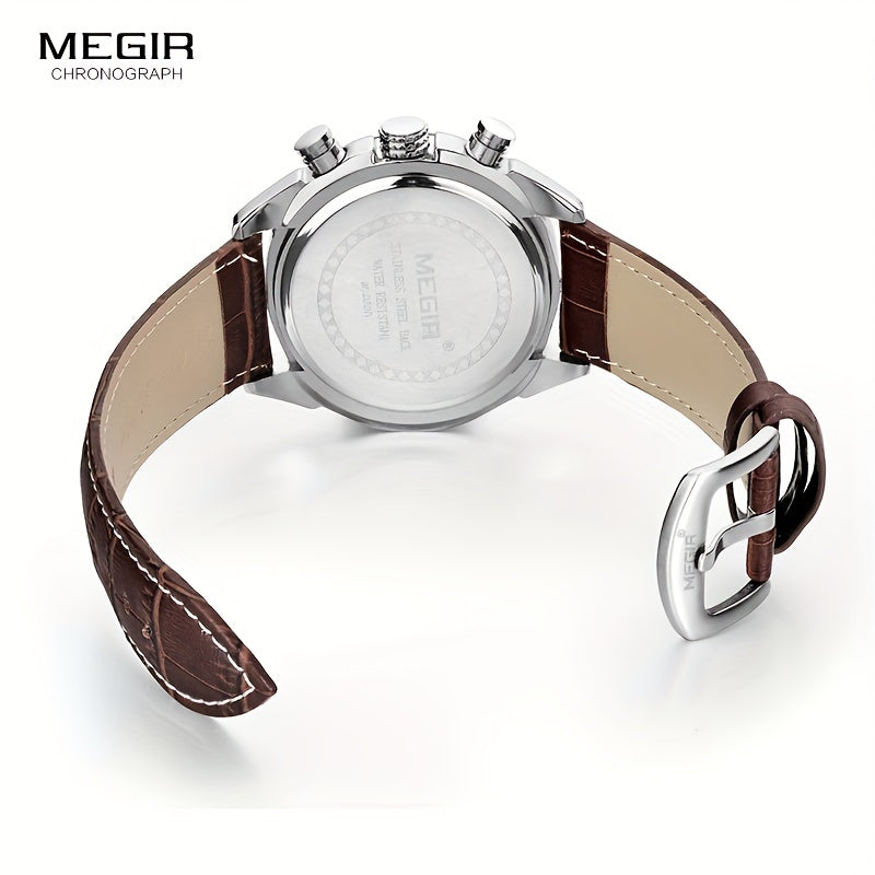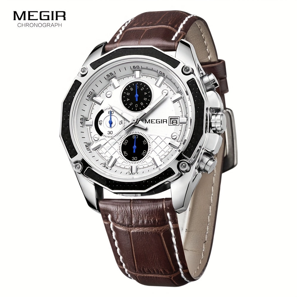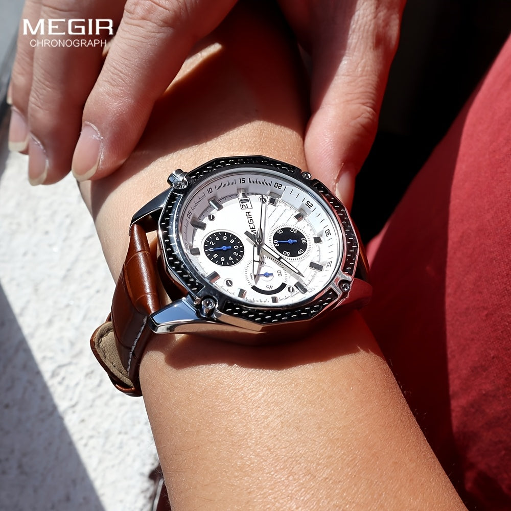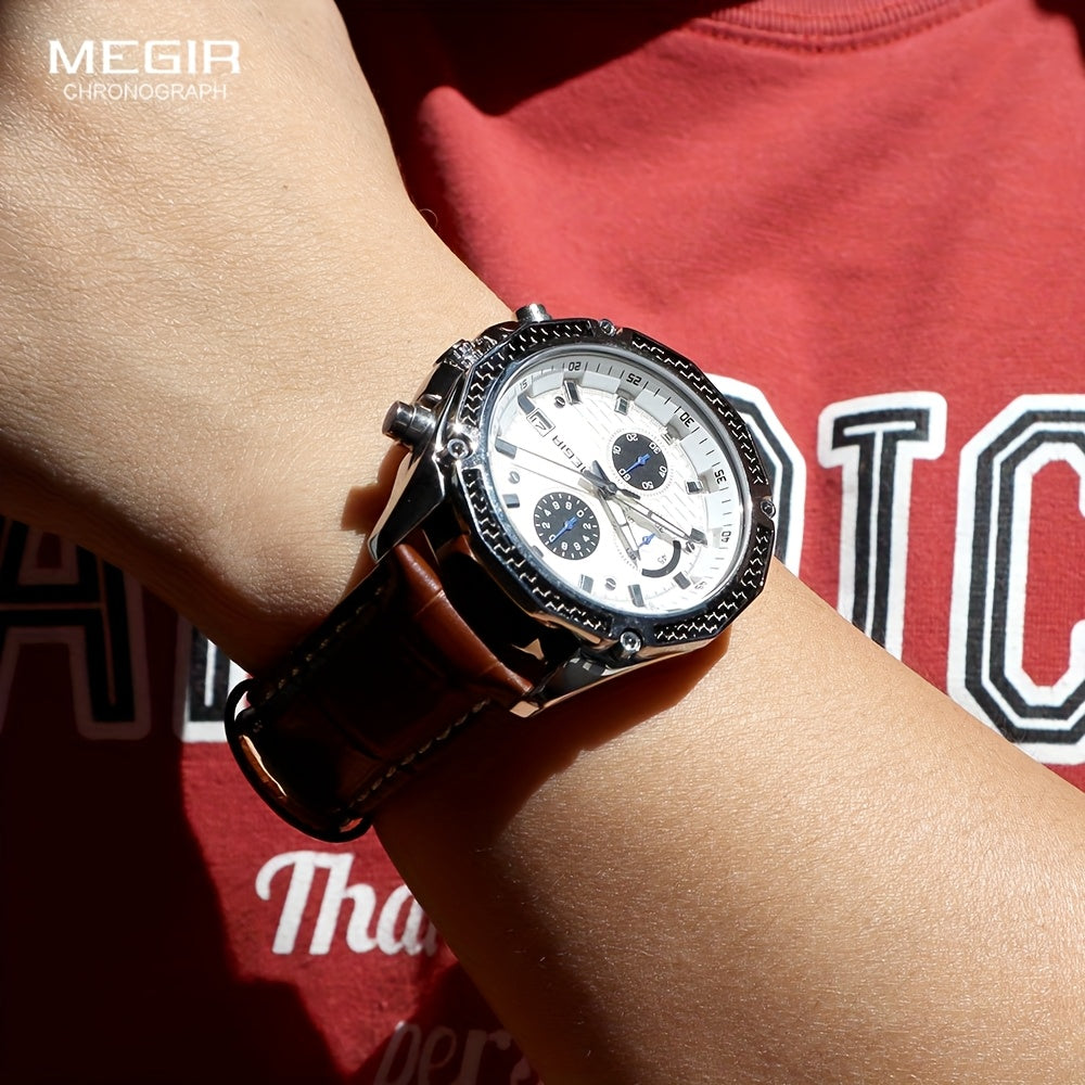 MEGIR Men'S Casual Quartz Watch with Date and Stopwatch Function, Leather Strap, Button Battery, Round Dial