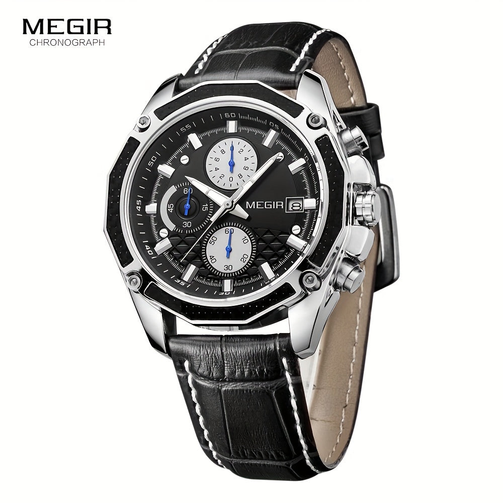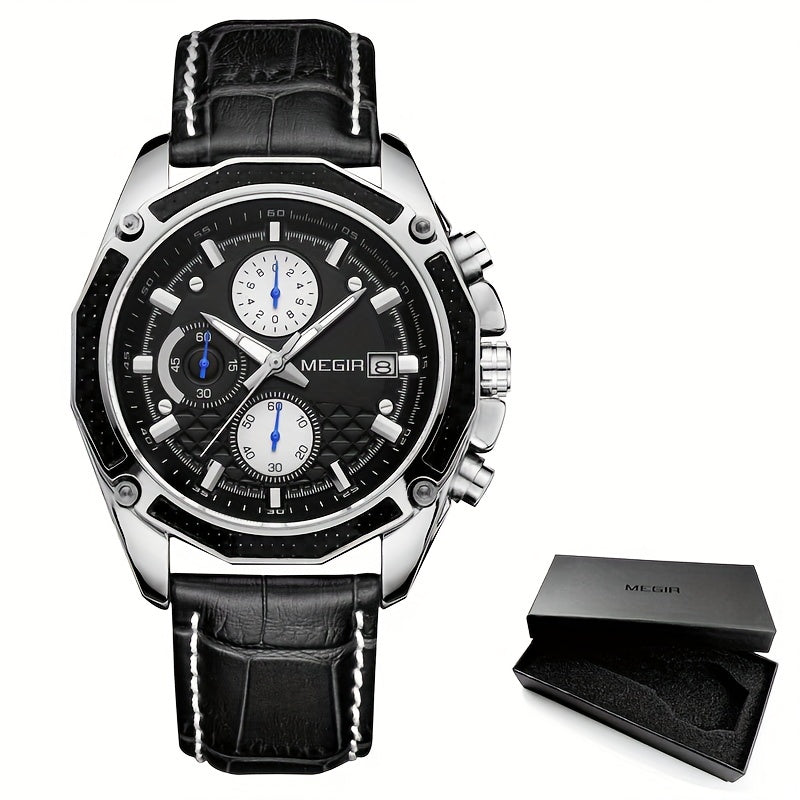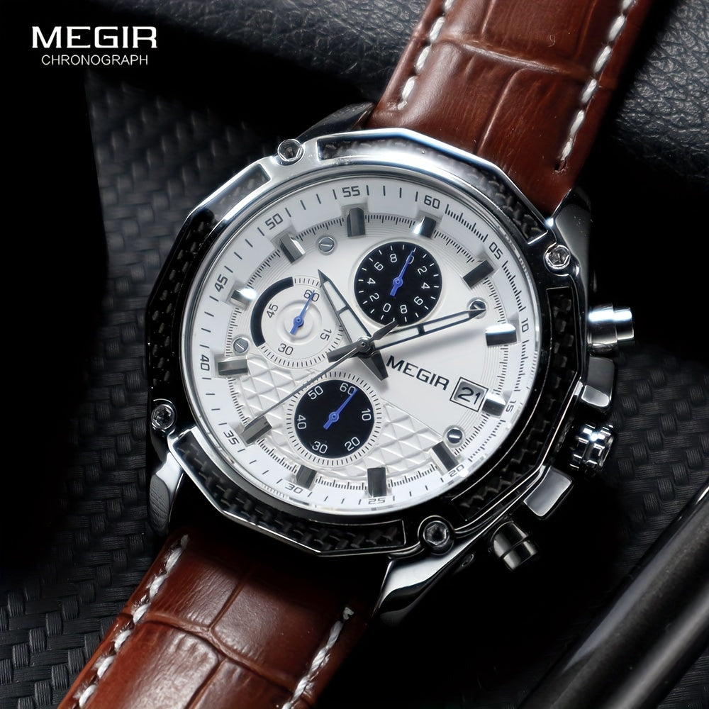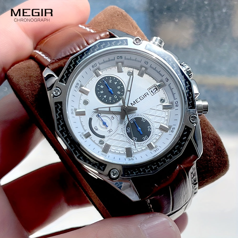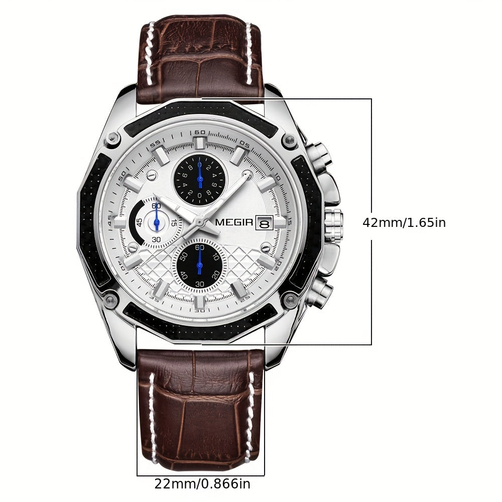 MEGIR Men'S Casual Quartz Watch with Date and Stopwatch Function, Leather Strap, Button Battery, Round Dial