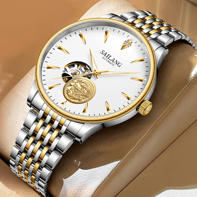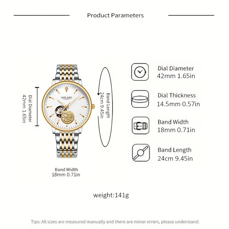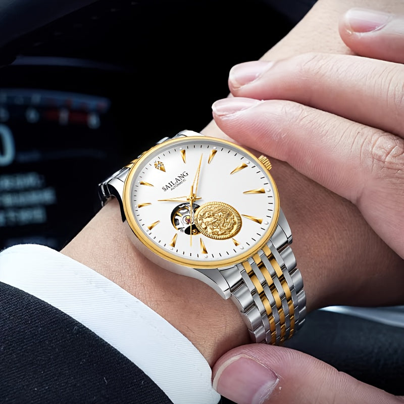 Men'S Automatic Mechanical Watch - Minimalist Business Casual Design with Golden-Tone Stainless Steel Band, Roman Numerals & World Time Feature, Elegant Round Dial for Formal & Casual Attire - Perfect Holiday Gift for Christmas, Thanksgiving, Graduation,