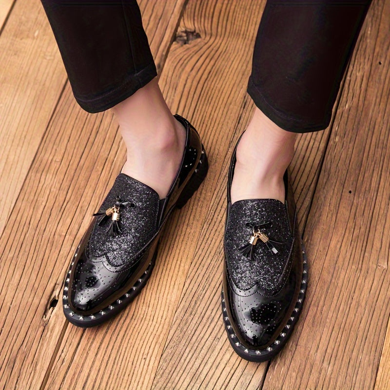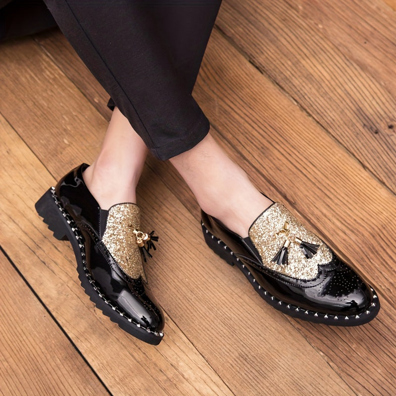 Men's Elegant Black & Golden Glitter Brogue Dress Shoes - Wingtip Tassel Loafers, Breathable Synthetic, Slip-On Formal Shoes for Business, Weddings & Social Events, Wedding Shoes