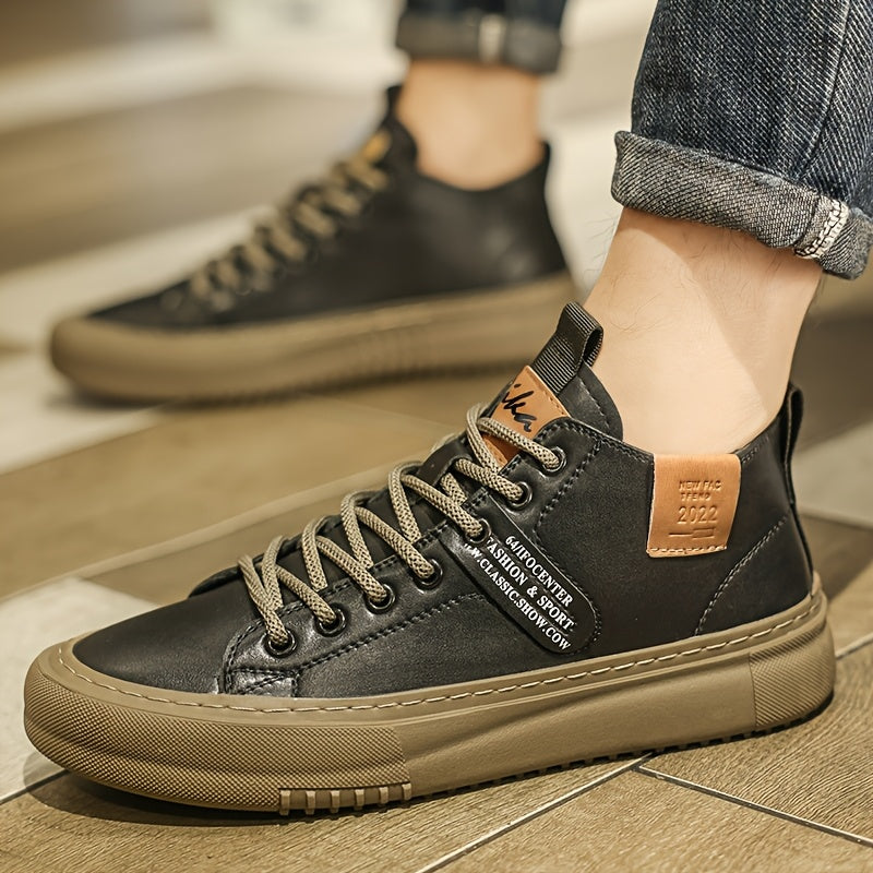 Men'S Fashion Mid-Top Casual Sneakers, Solid Color Lace-Up Shoes, Lightweight, Soft Sole, Synthetic Upper, PU Inner, Fabric Lining, Rubber Outsole, PU Insole