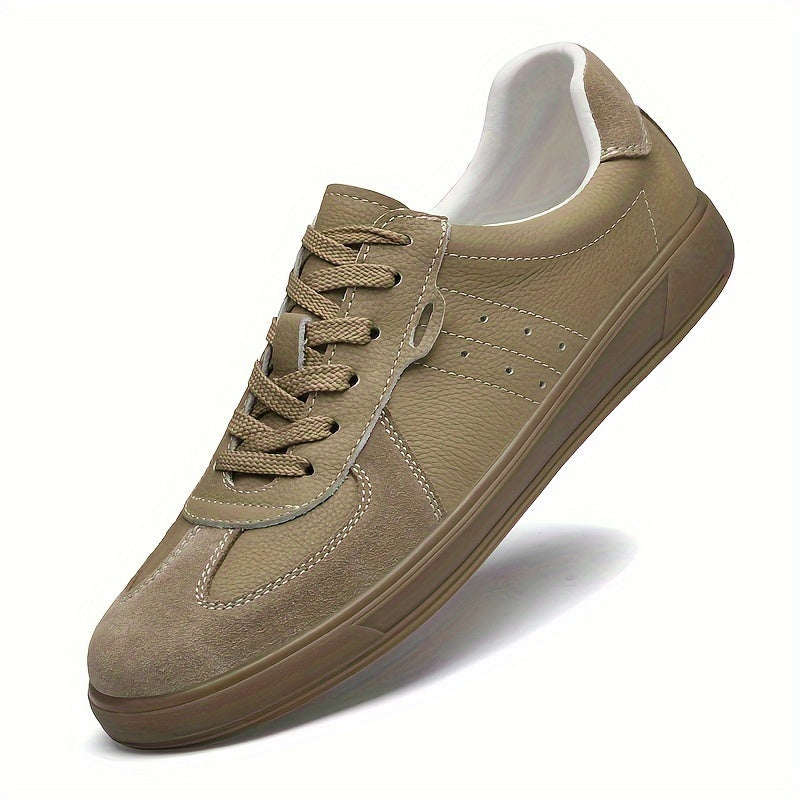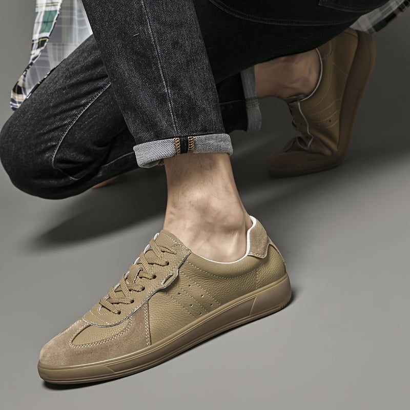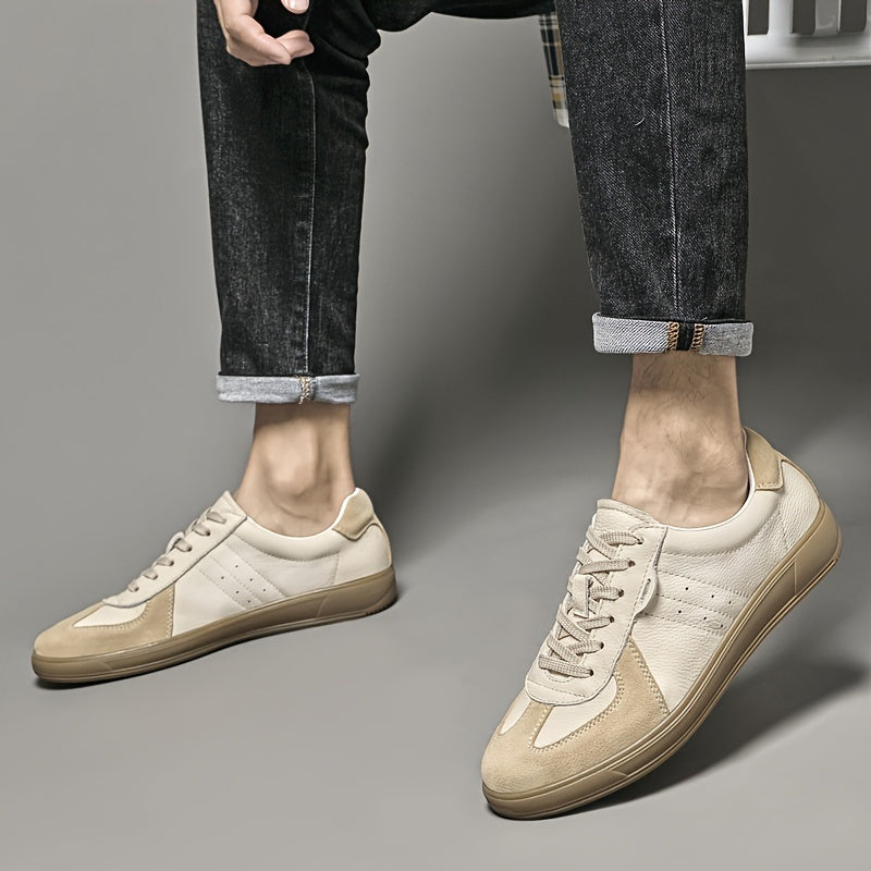 Men's Genuine Leather Loafers - Casual & Sporty Lace-Up Sneakers with Rubber Sole, Beige & White Design, Comfortable for Casual Attire, Training, and Outdoor Activities