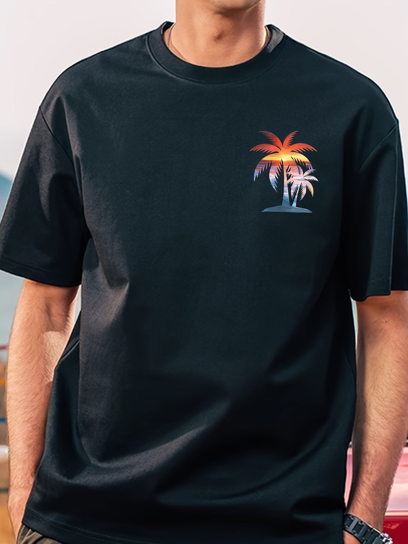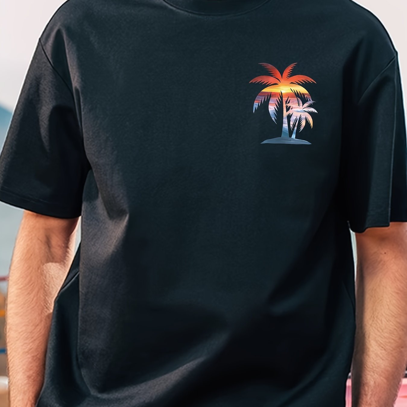 Men's High-Quality Cotton T-Shirt with Tropical Palm Tree Print – Casual Round Neck, Short Sleeve, Breathable Fabric, Ideal for Summer