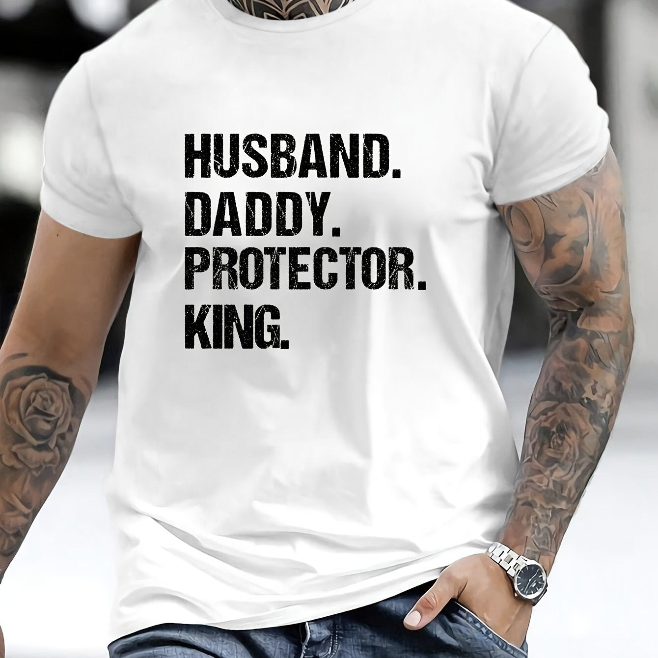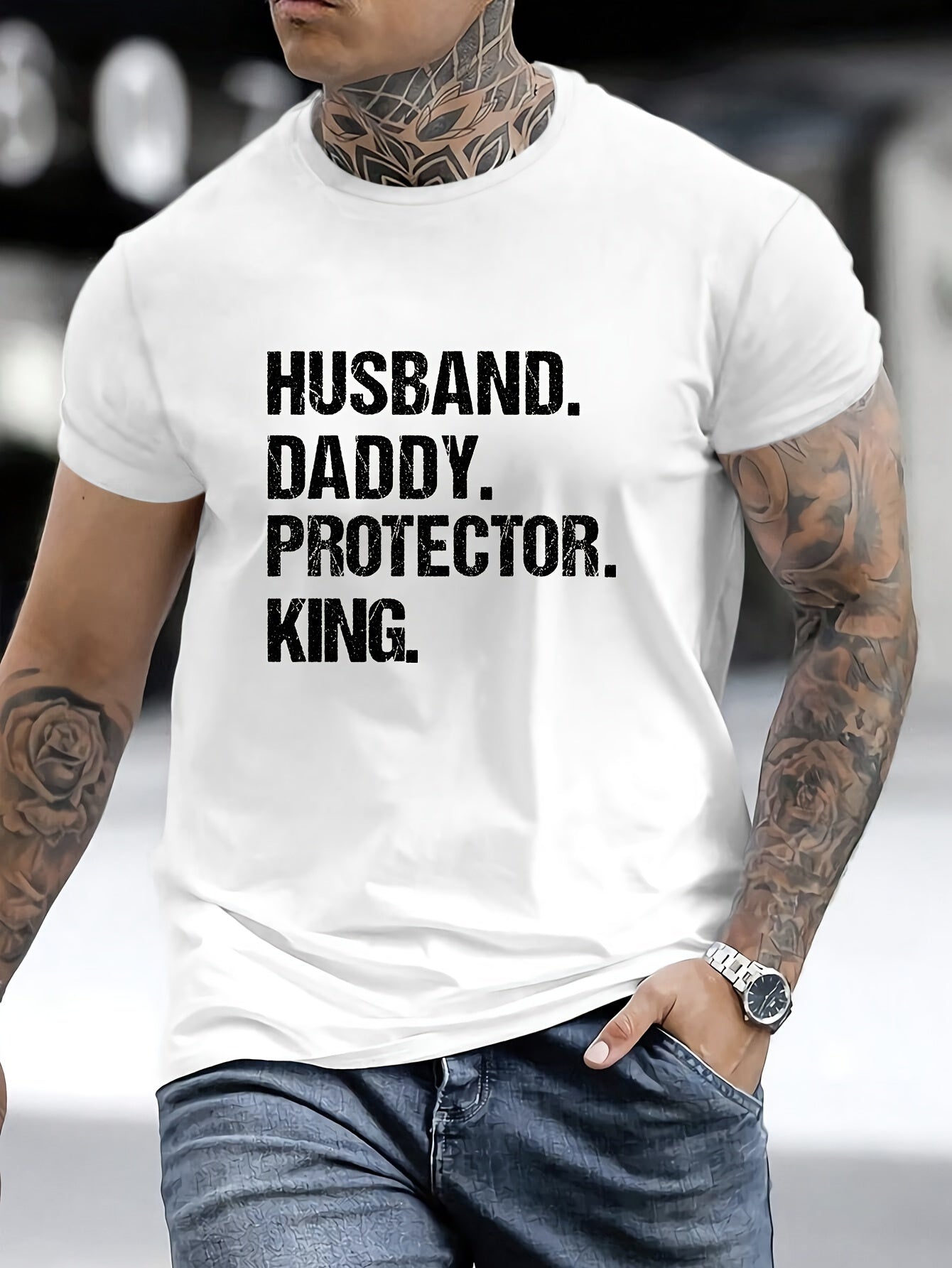 Men's "HUSBAND, DADDY, PROTECTOR, KING" Graphic Tee - 100% Cotton Casual Black T-Shirt with White Lettering, Crew Neck, Summer Wear, Perfect for Daily Outings