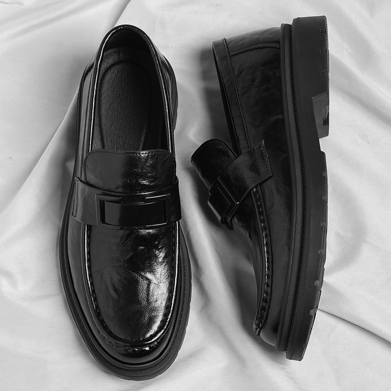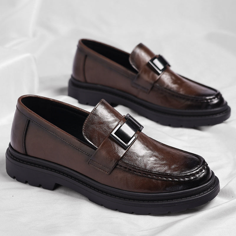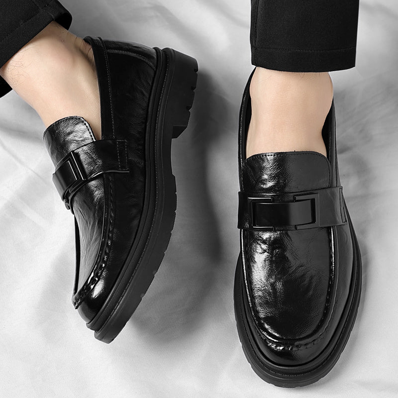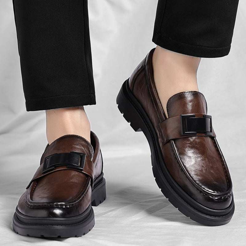 Men's Modern Slip-On Dress Loafers with Stylish Strap Accent Across Upper and Robust Lugged Platform Sole, Comfortable Moc Toe Footwear Ideal for Business Casual Attire and All-Day Support, Made with Durable High-Grade Resilient Materials.