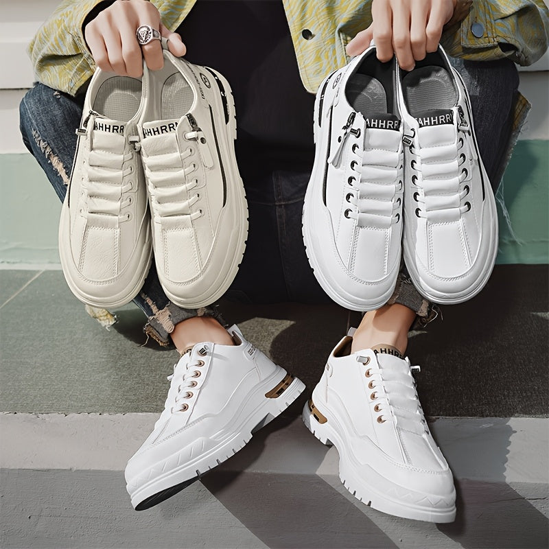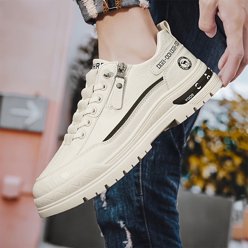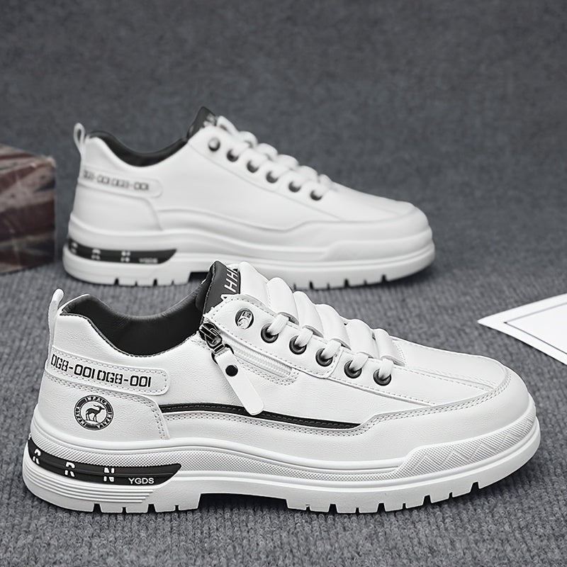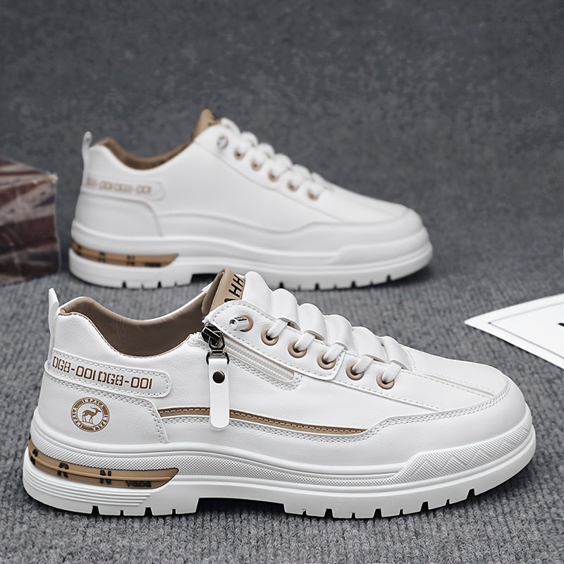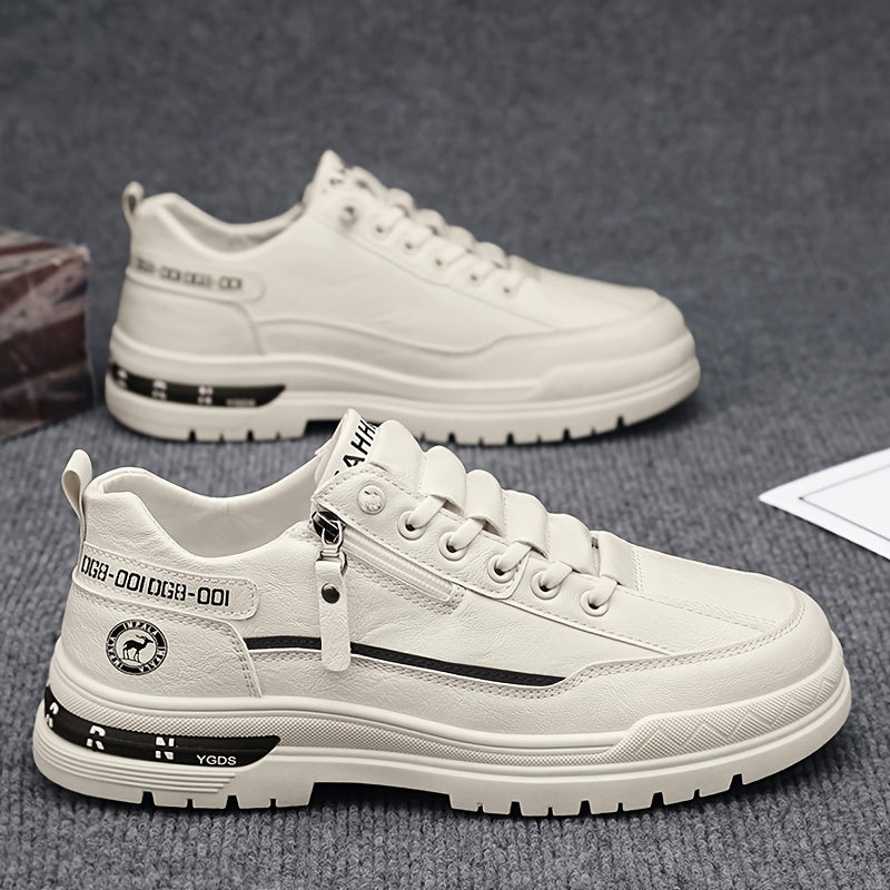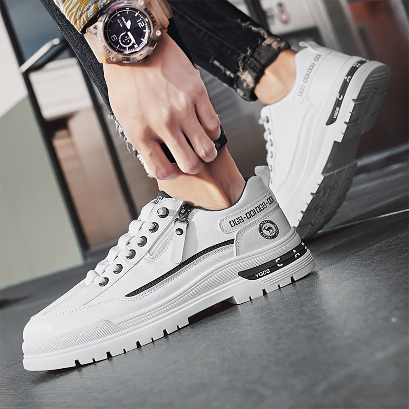 Men's Slip-On High Quality Sneakers - Lightweight Non-Slip Rubber Sole, PU Upper & Fabric Lining, All-Season Casual Shoes for Hiking, Running, Outdoor Activities - White, Stylish Zip Details | Comfortable Fabric Lining
