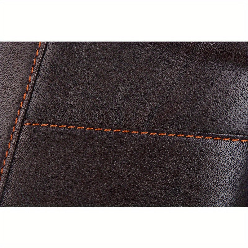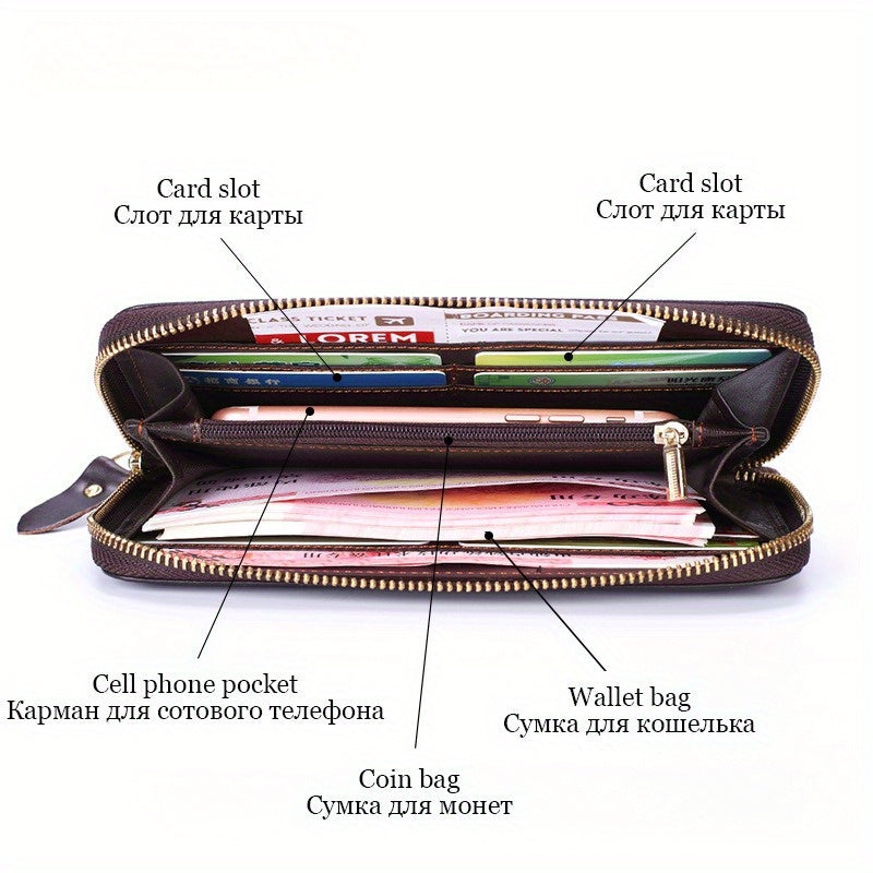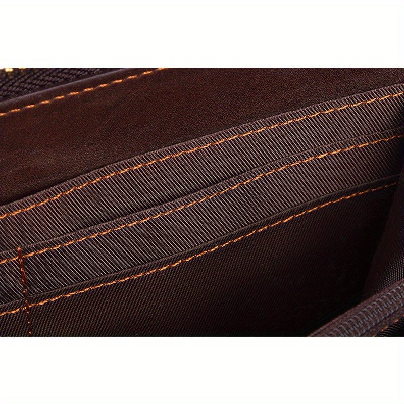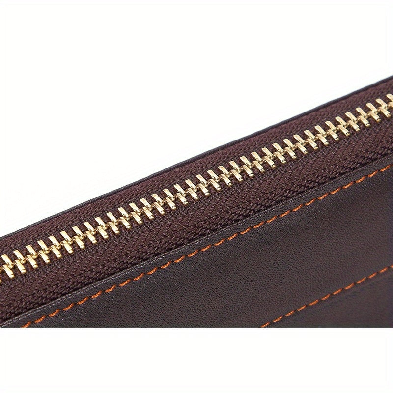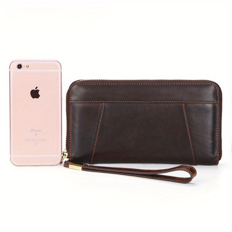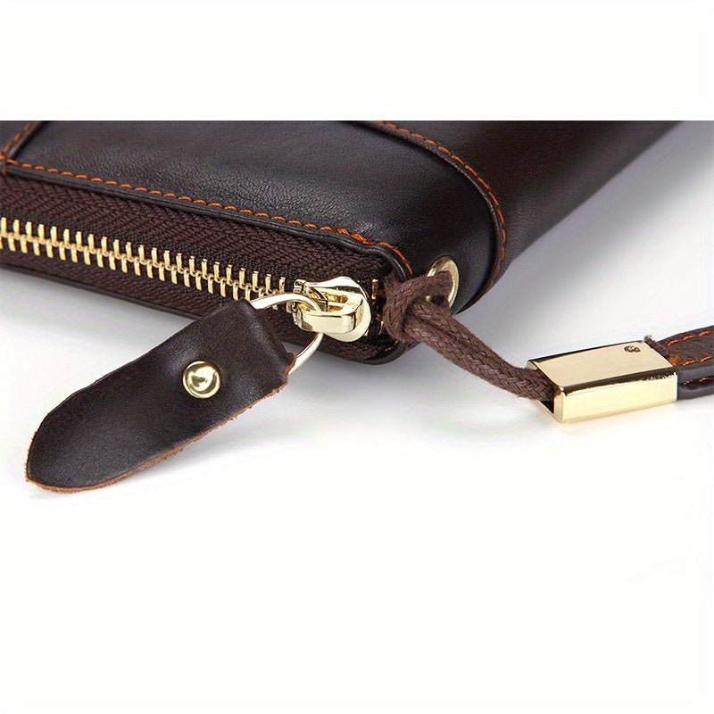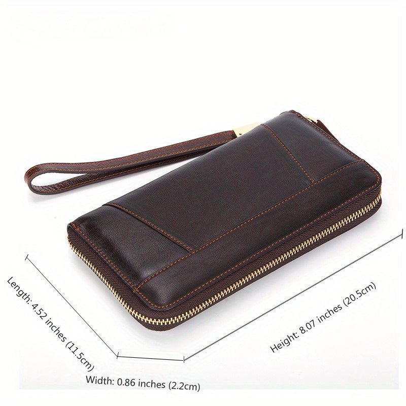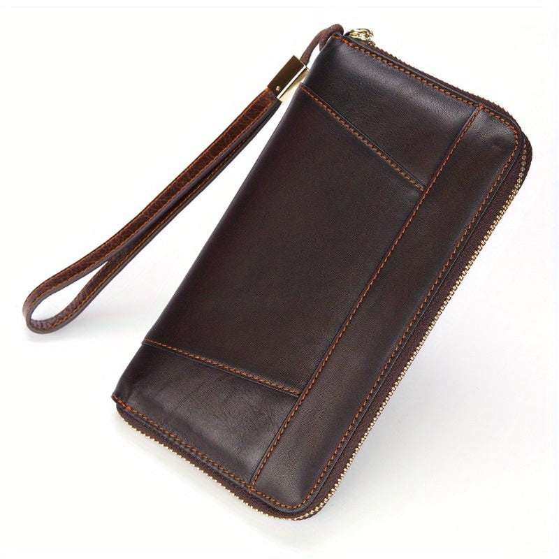 Men's Vintage Genuine Leather Zipper Wallet - Long Style, Brown with Stitching & Wrist Strap, Top Layer Cowhide, Casual Design, Everyday Carry Wallet | Wrist Strap Wallet | Durable Leather Wallet