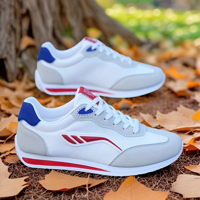 Men's White Lightweight Breathable Mesh Sneakers with Red & Blue Accents - Low-Top Lace-Up Running Shoes, Comfortable EVA Insole & Durable Rubber Sole for Casual, Gym, Jogging, Gym Footwear, Sleek Shoe Design, Fabric Construction, Casual Footwear, Sporty