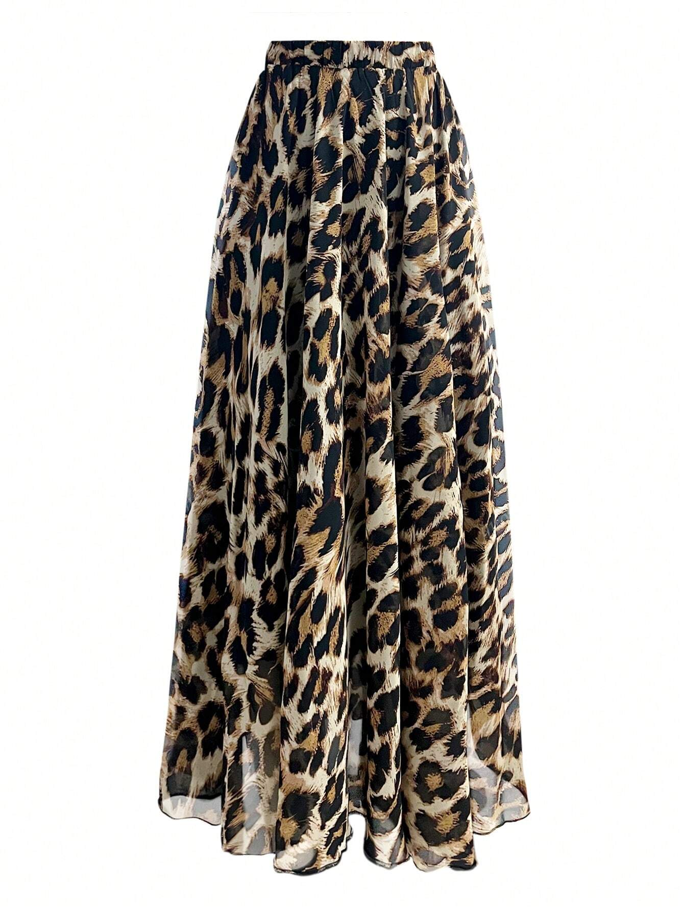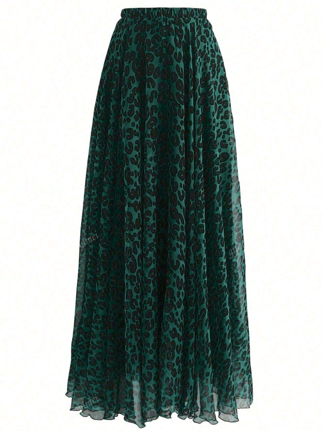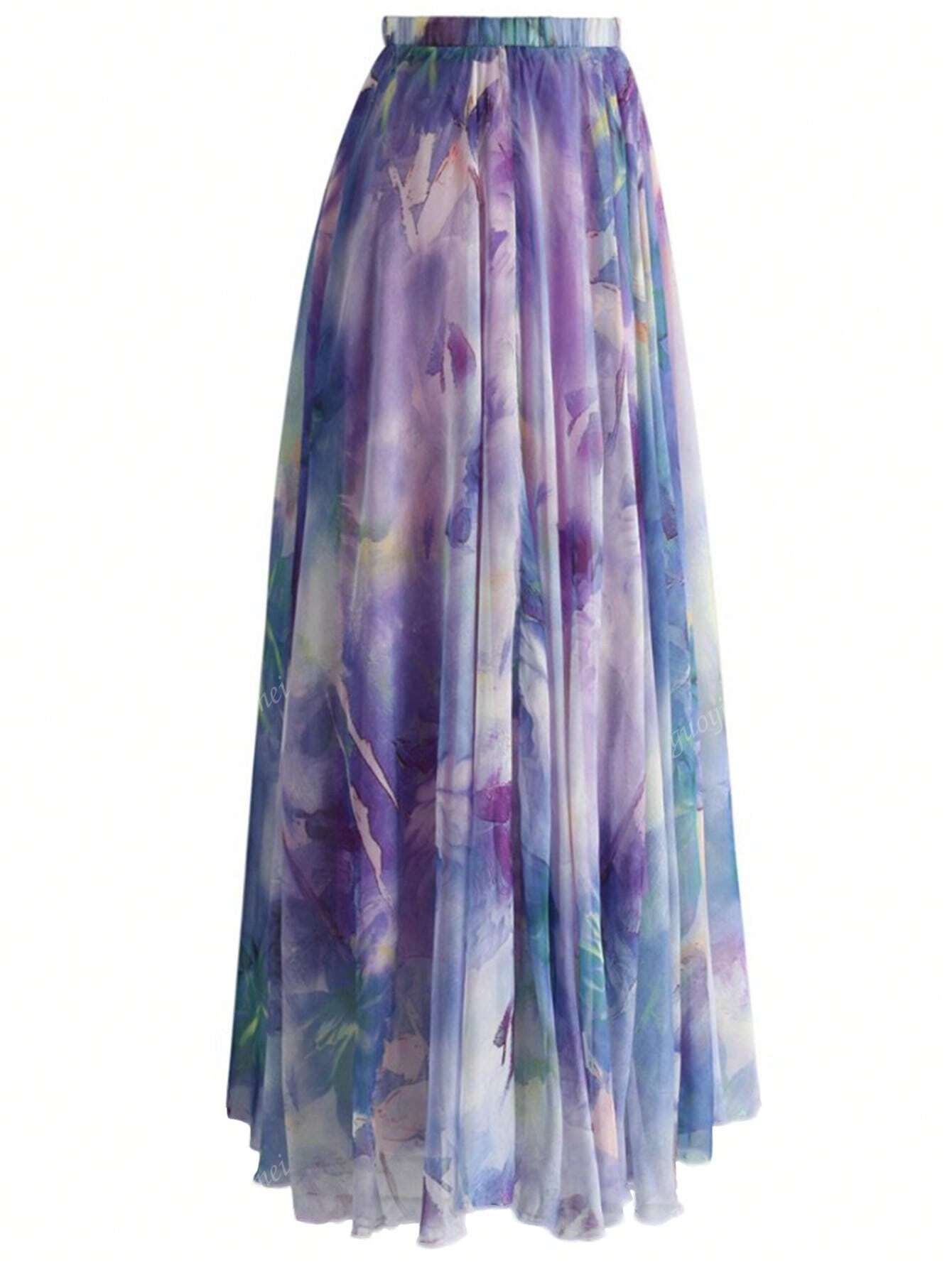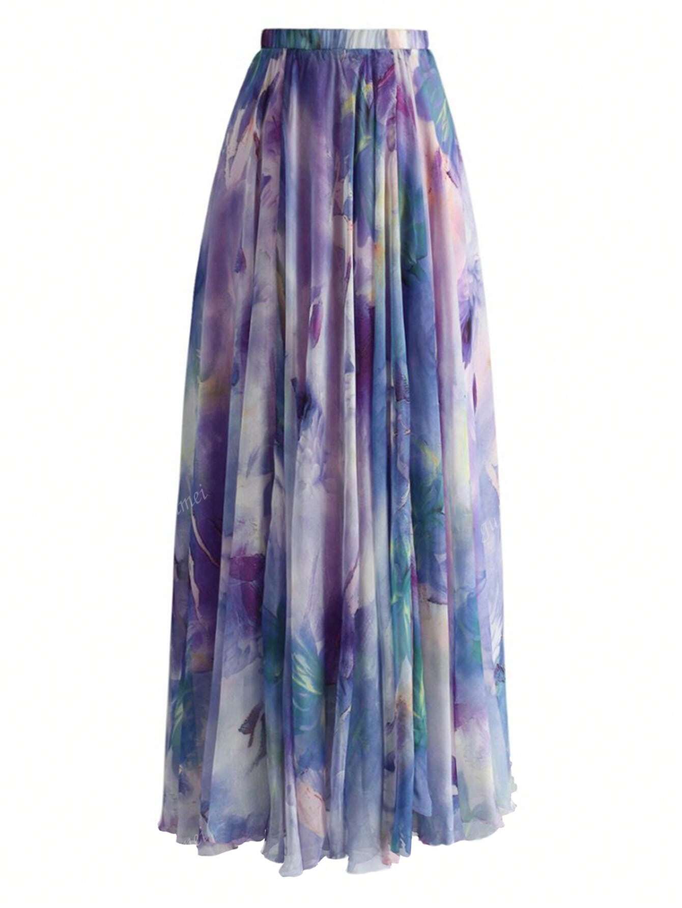 Mesh Printed Long Elastic Waist Elegant A-Line Skirt