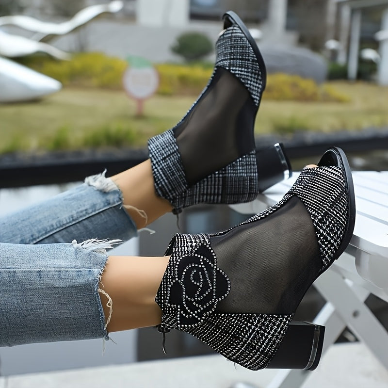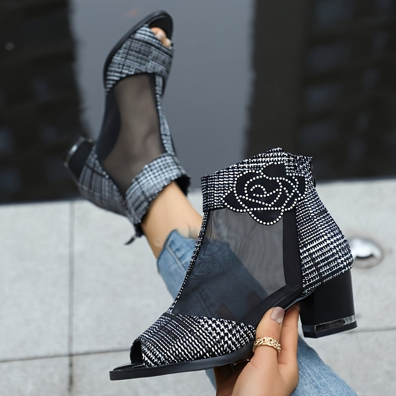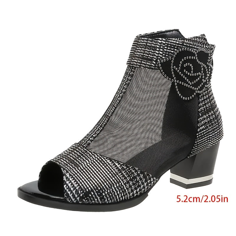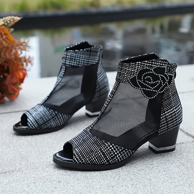 [Mesh Sandals] Breathable Mesh Women's Sandals | Chunky Heel, Floral Accents, Open Toe, Back Zipper Design, Wraparound High Heel