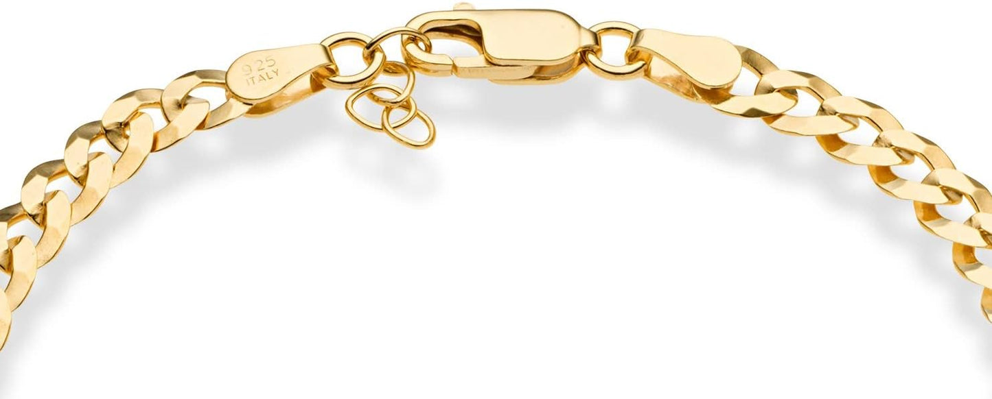 Modern Classic - Add style to a basic look with this solid 18K yellow gold over sterling silver 5mm Curb bracelet. Our flat diamond-cut beveled links are much more reflective than the standard Curb chain for a rich, perfect shine. Strong and durable for daily wear yet not too thick for a comfortable fit. A chain that gives modern elegance to both casual and formal outfits, wear it solo for an everyday polished look or stack with other bracelets for a cool fashion statement.