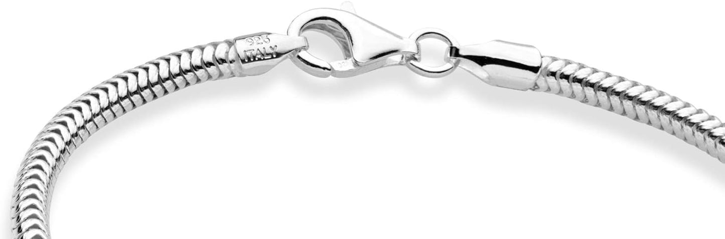 WEAR ALONE OR AS A CHARM BRACELET - Add style to a basic look with this 925 sterling silver solid round snake chain bracelet. Polished to a bright shine, this Italian crafted silky smooth bracelet is strong, comfortable and durable for daily wear. A chain that gives a modern edge to both casual and dressy outfits, it can be worn alone, peared with charms or stacked and layered with other bracelets.