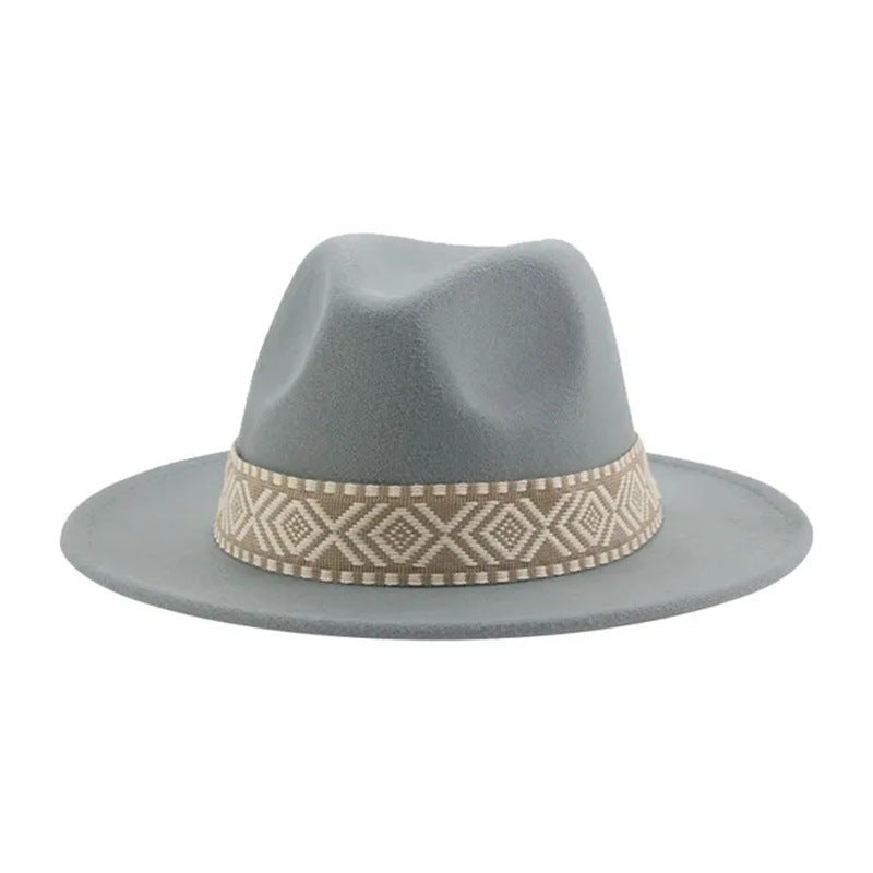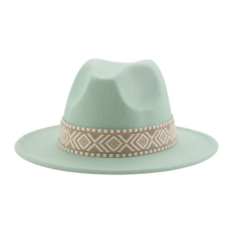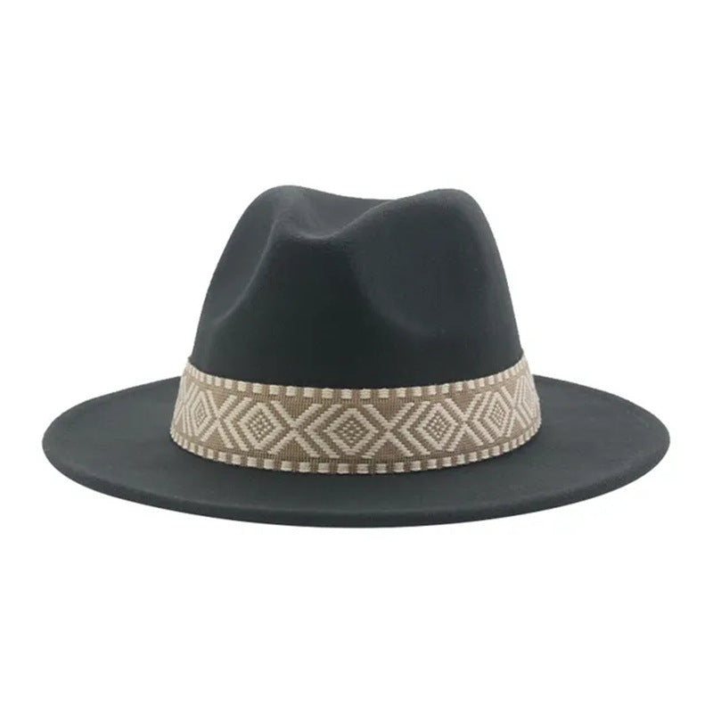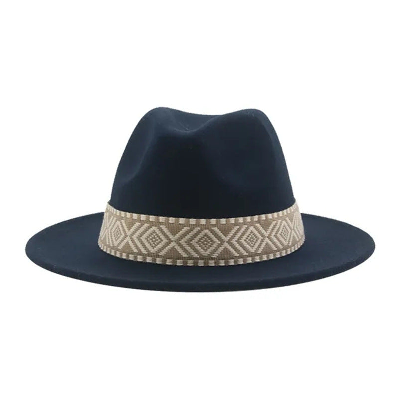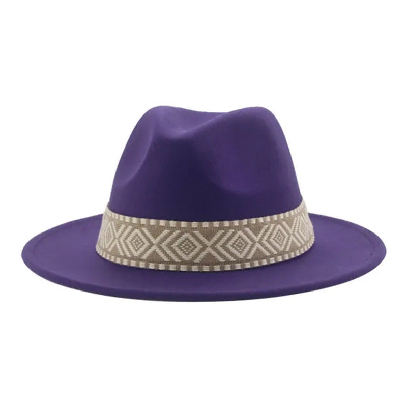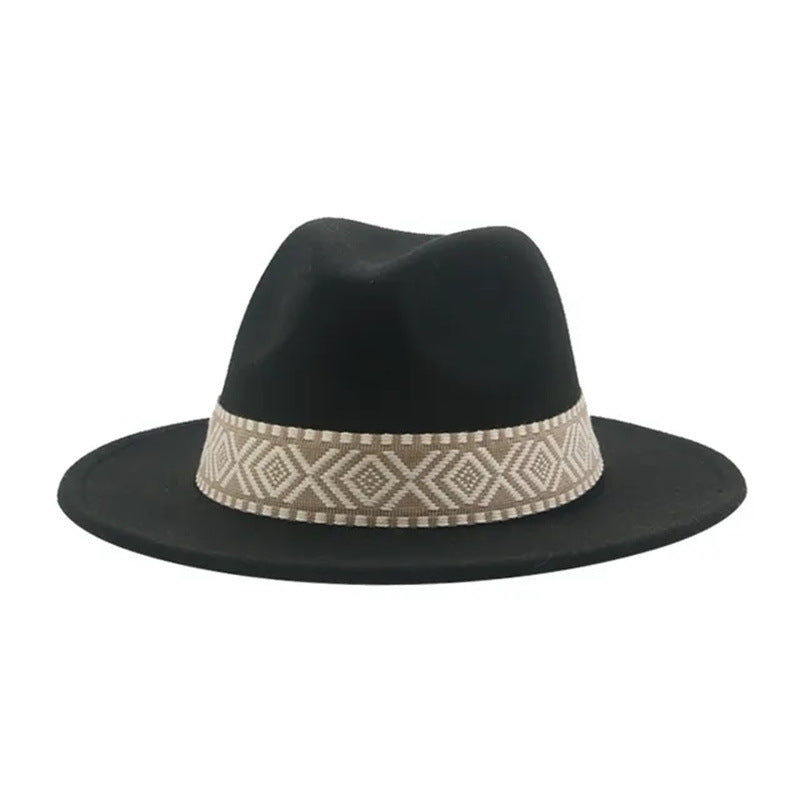[Minimum order quantity is 2 pieces]Wide Brim Woolen Hat Jazz Flat Brim Woolen Hat Geometric Abstract Square Ribbon Felt Cap Retro Tibetan