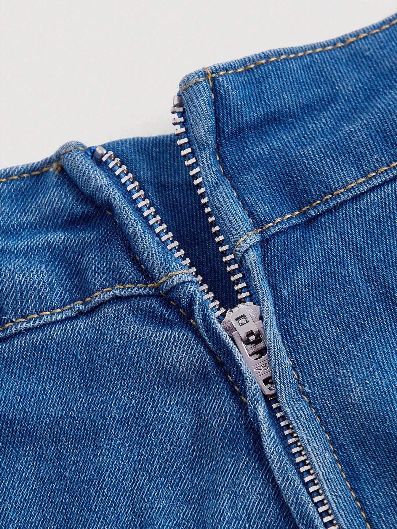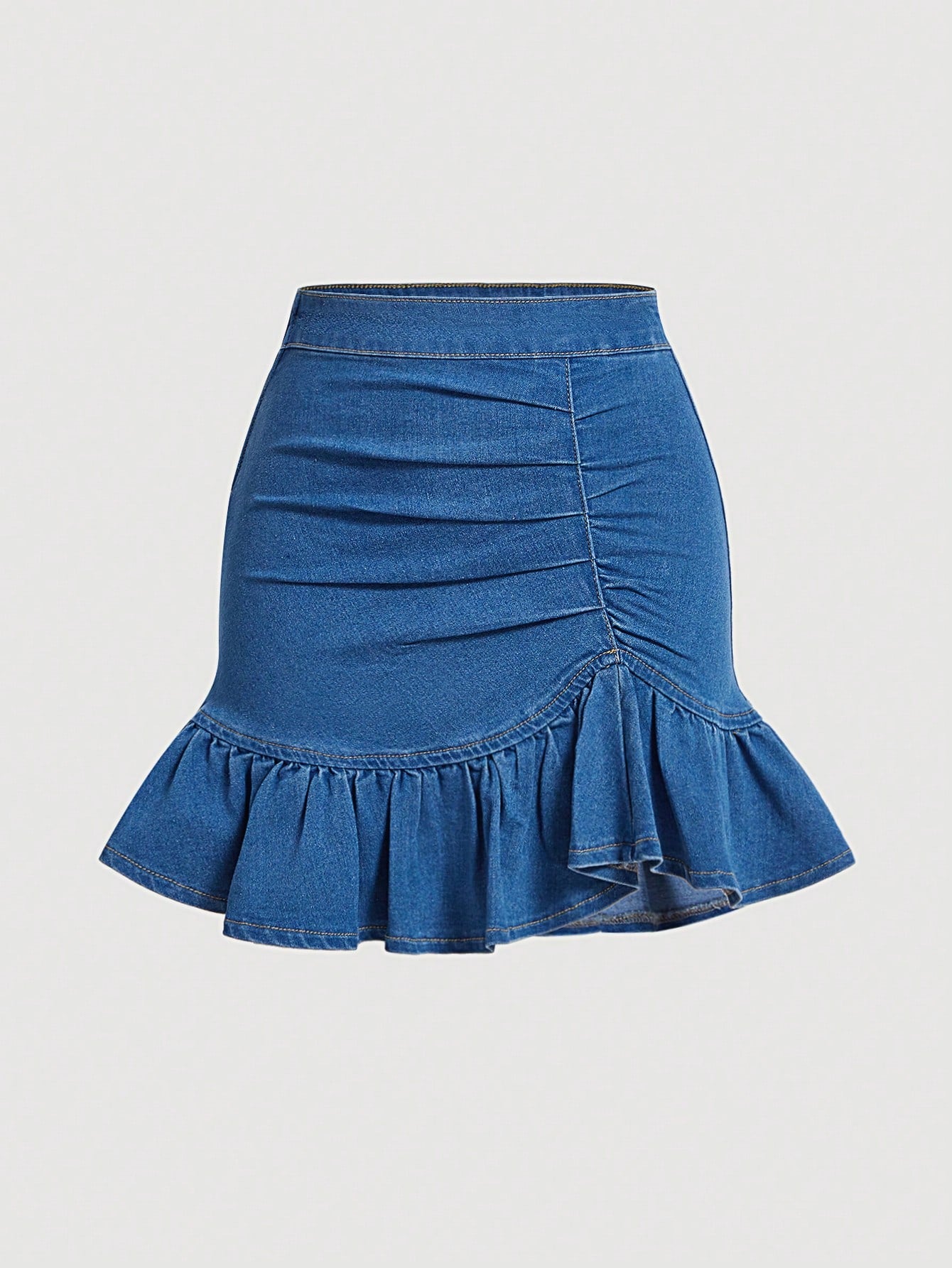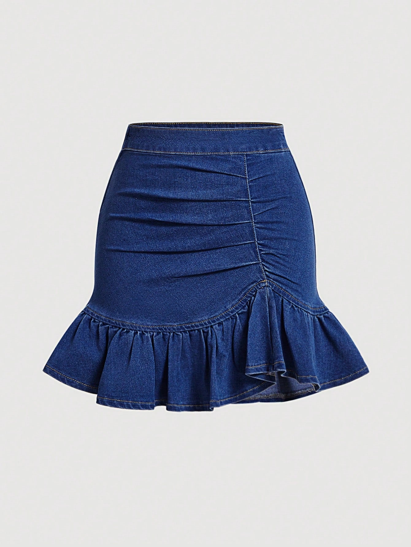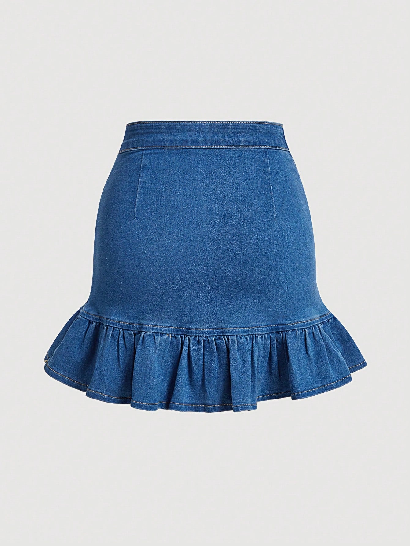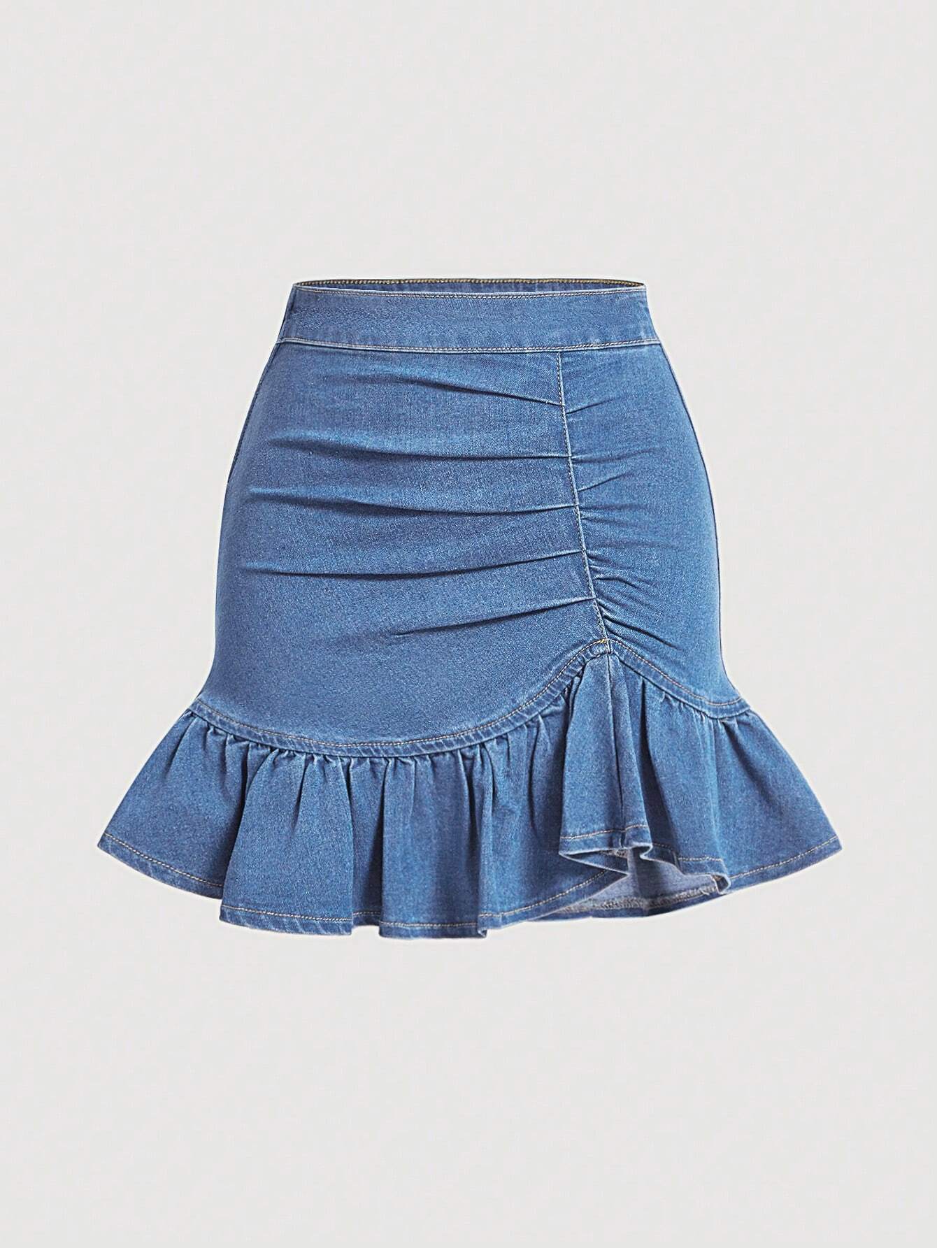 MOD Women Ruffle Hem Bodycon Skirt For Everyday Casual Wear With Denim Effect