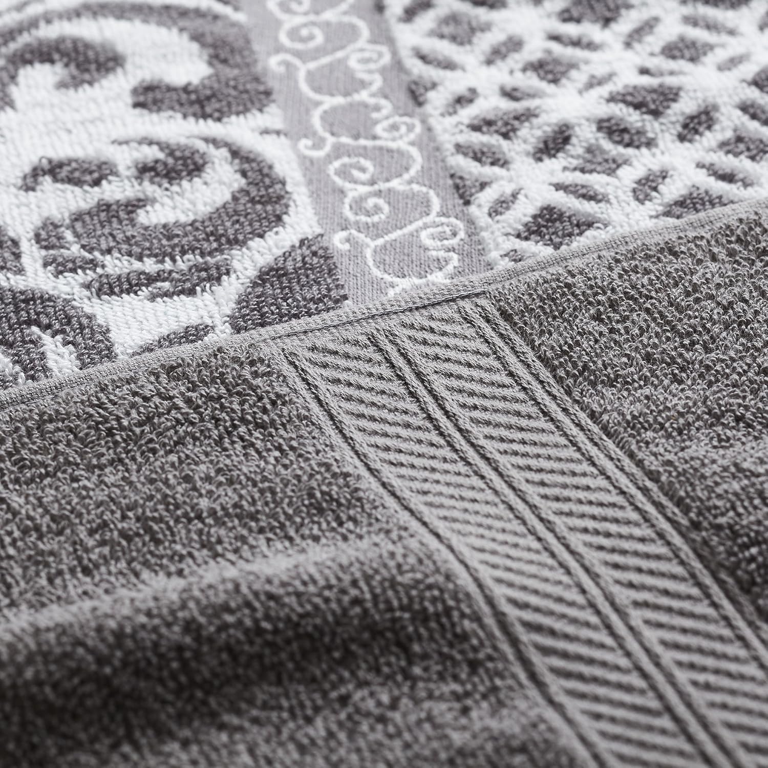 Supple & Stylish Jacquard Bathroom Towel Set: Transform your bathroom into a spa-like oasis with our luxuriously soft jacquard towel set. Including one solid & one jacquard bath towel, one solid & one jacquard hand towel, and two solid washcloths, our contemporary bathroom set is made from 100% yarn-dyed highly absorbent cotton. Enhance your guest or personal bathroom and experience hotel quality plushness after every relaxing bath.