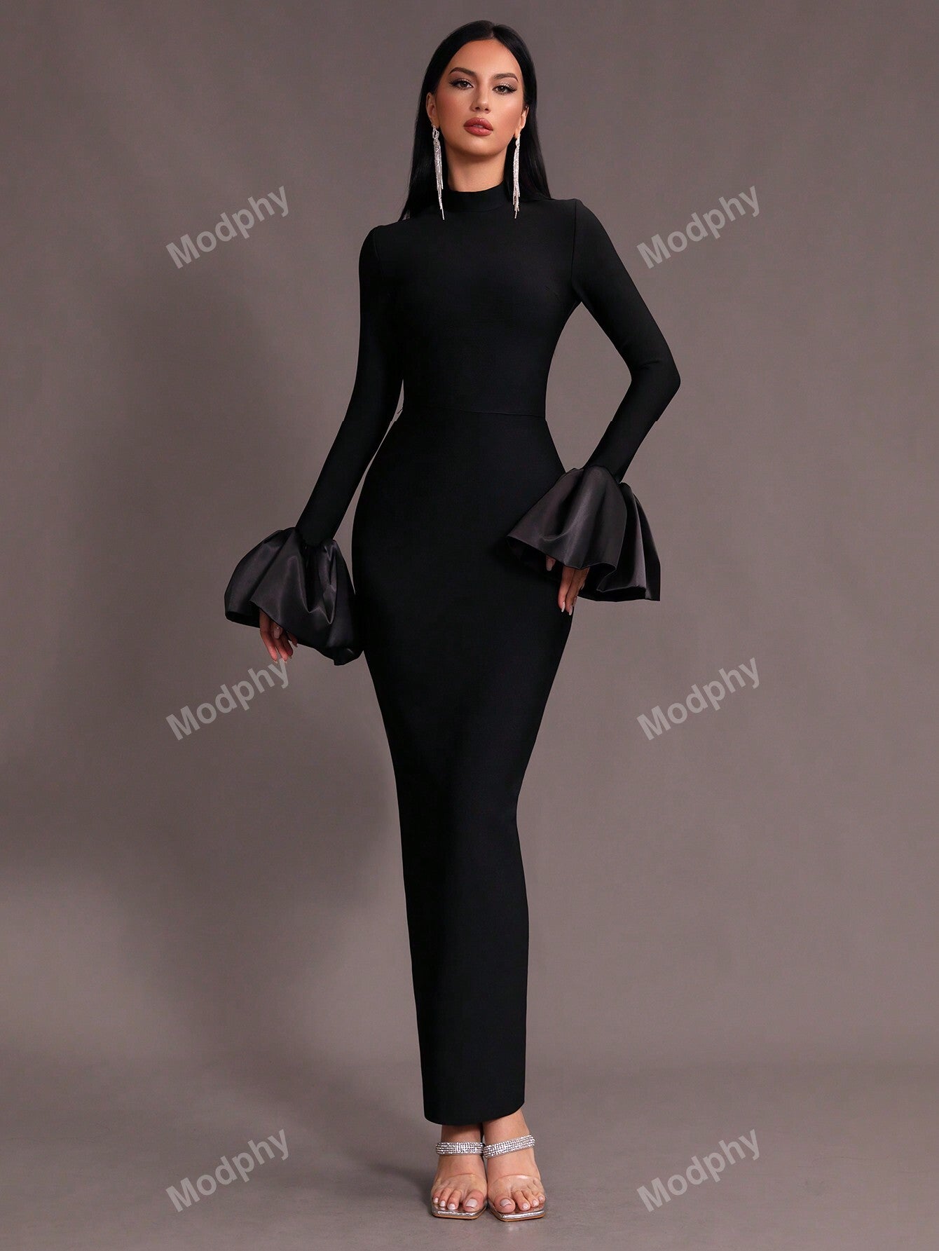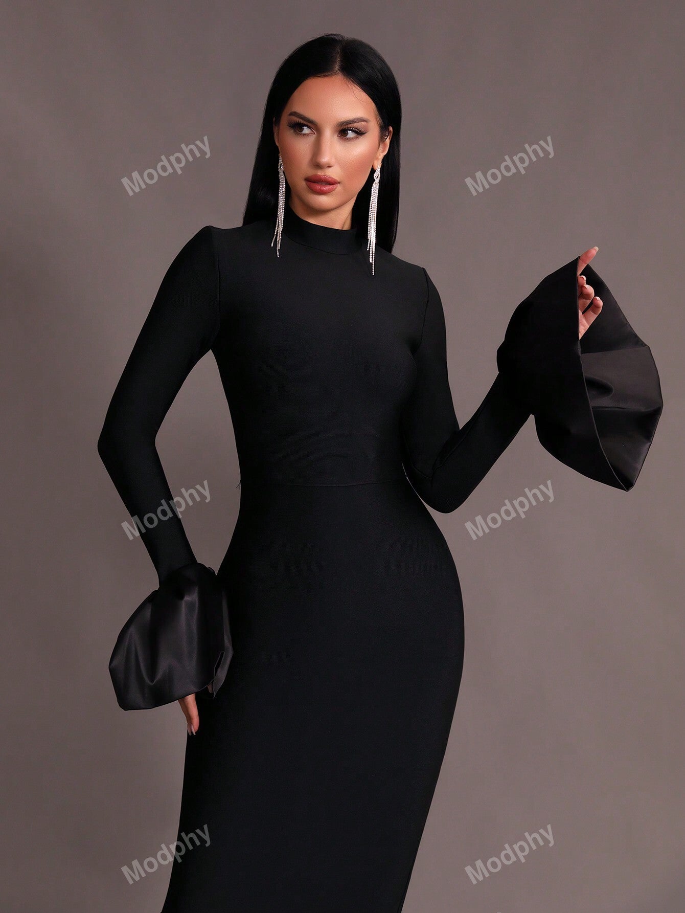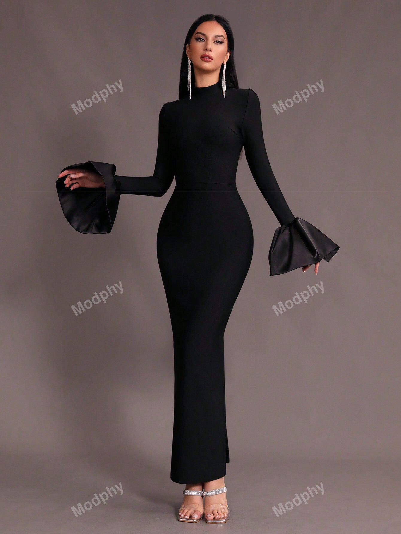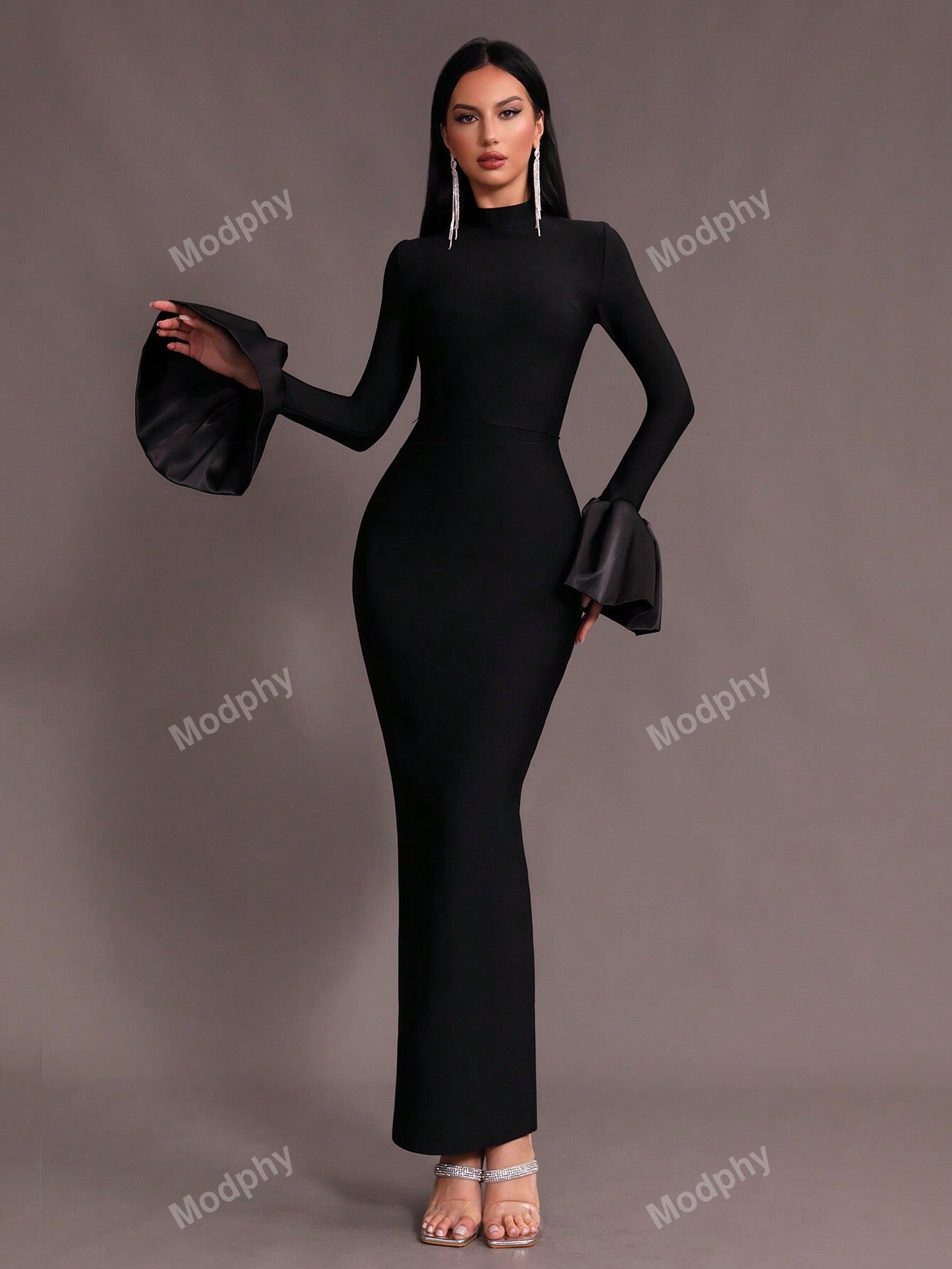 Modphy New Dark Green Sexy V-Neck Long Sleeve Mermaid Dress, High Collar Form Fitting Bodycon Gown For Women, Wedding, Cocktail Party, Special Occasion