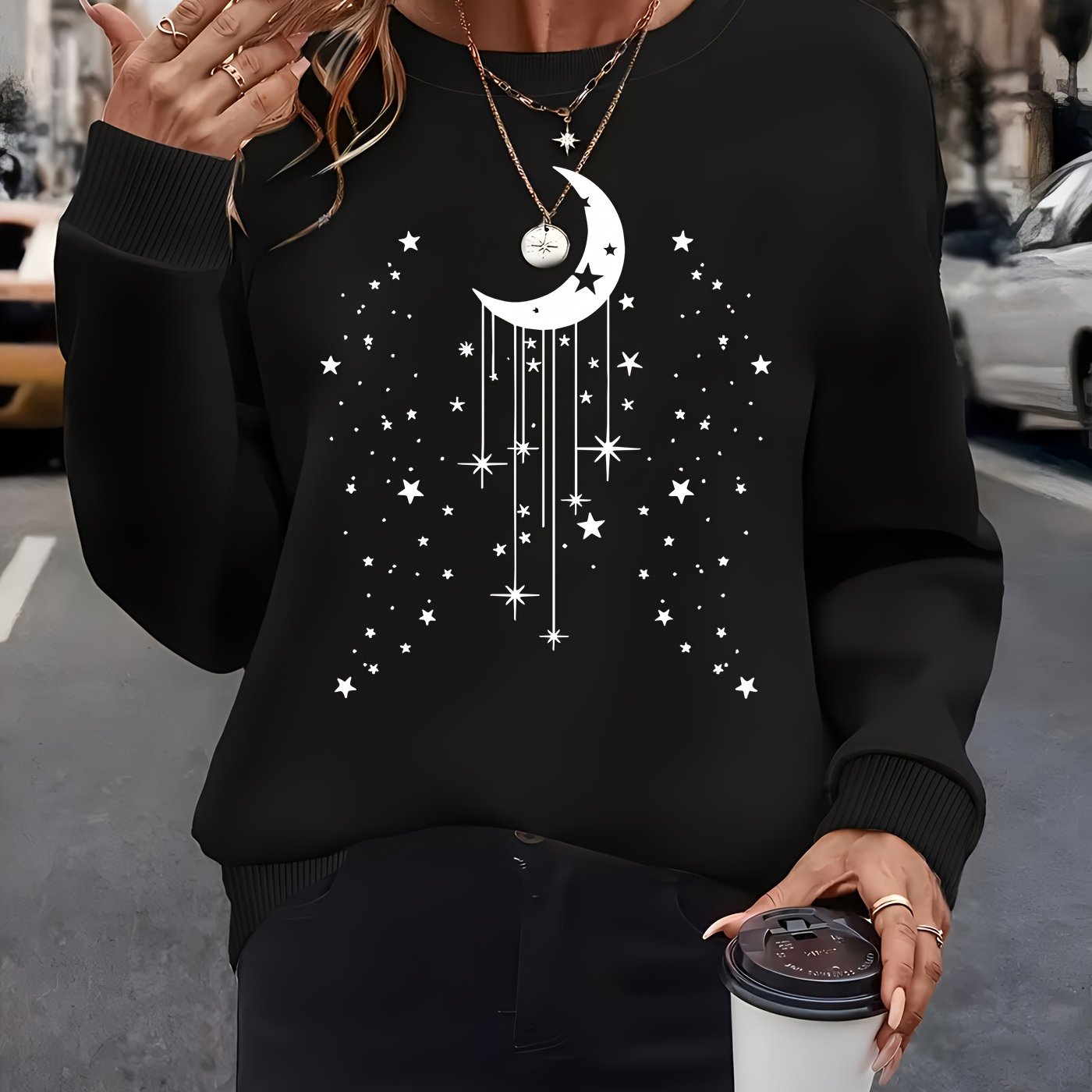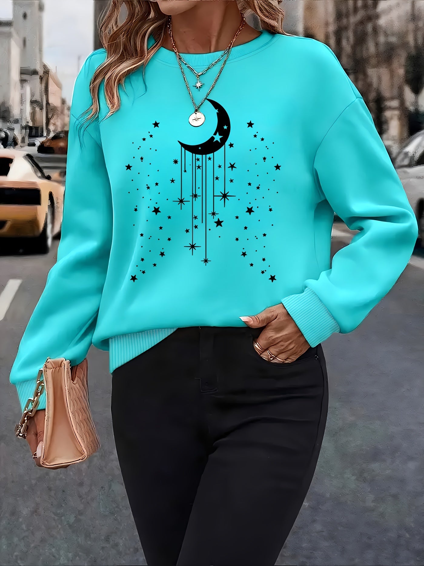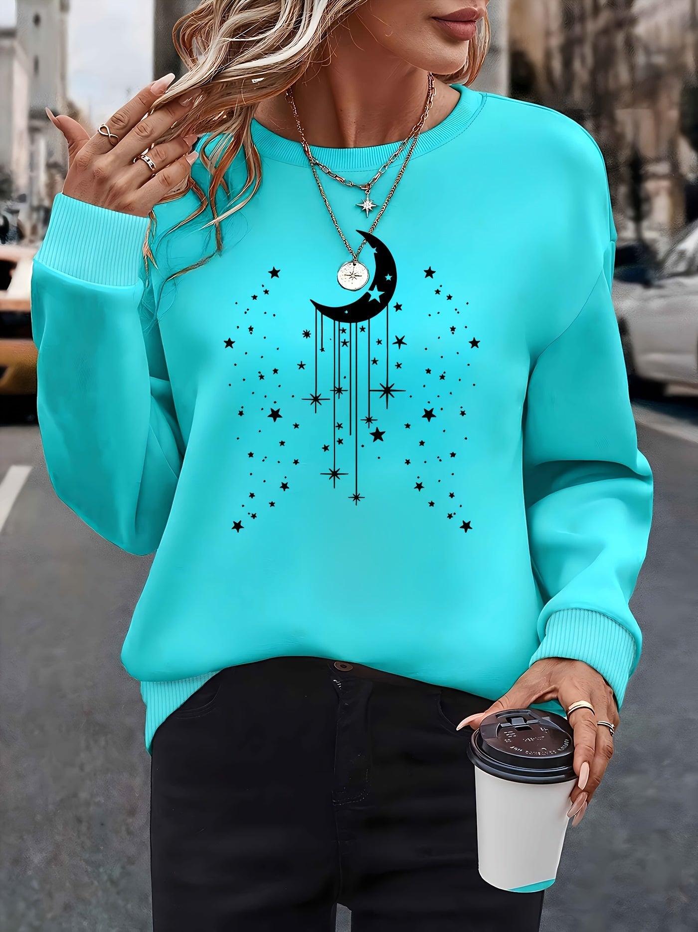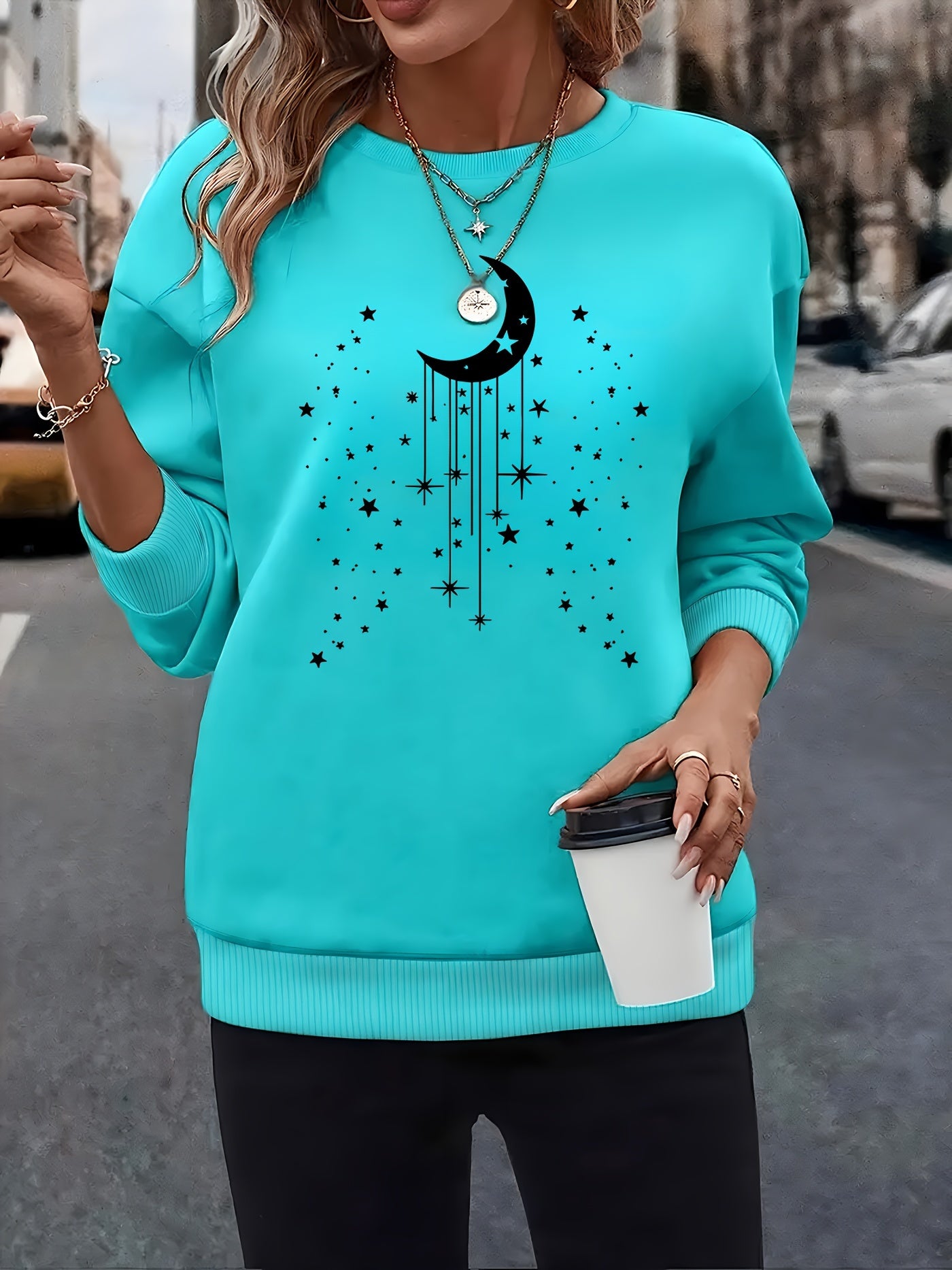 Moon Print Pullover Sweatshirt, Casual Long Sleeve Crew Neck Sweatshirt for Fall & Winter, Women's Clothing