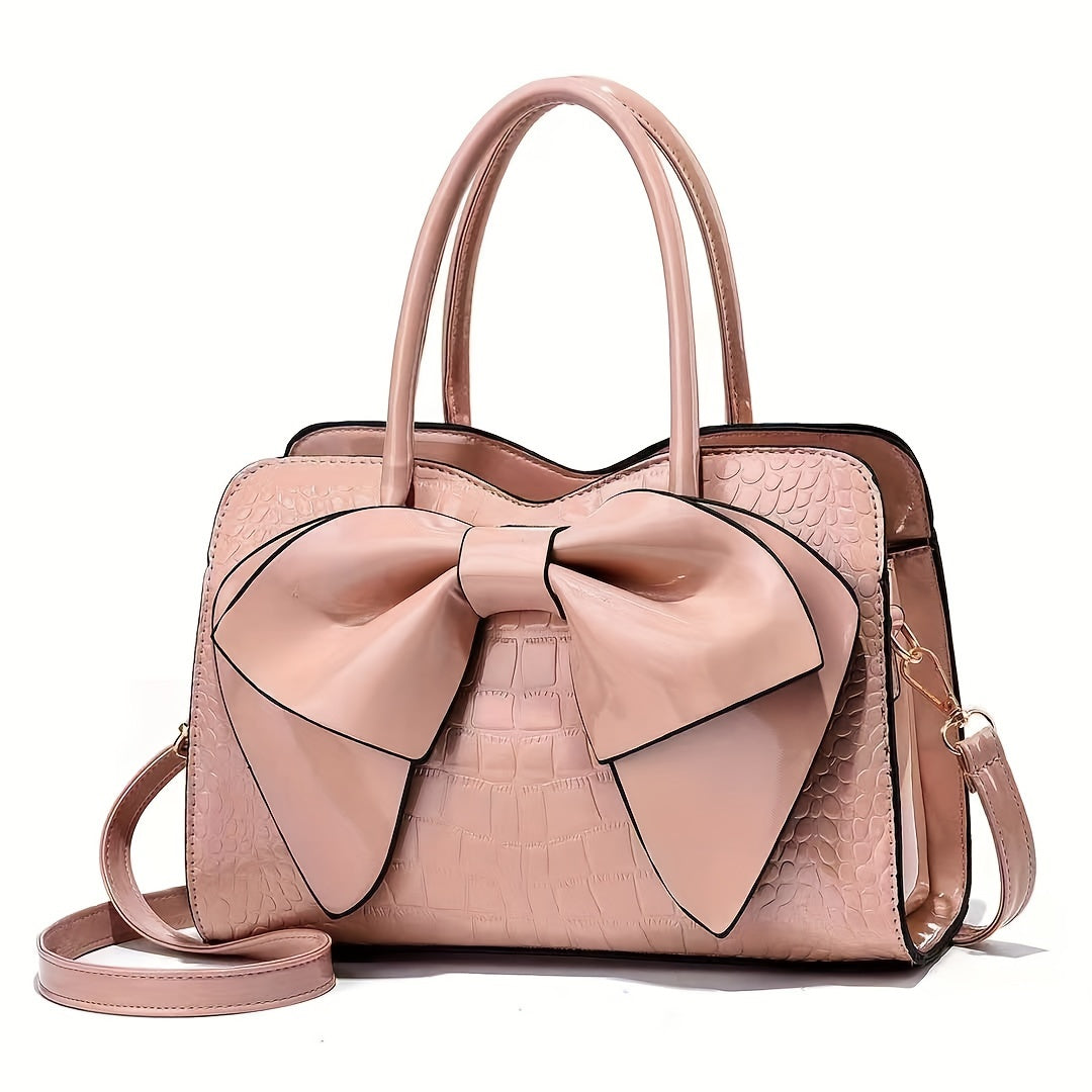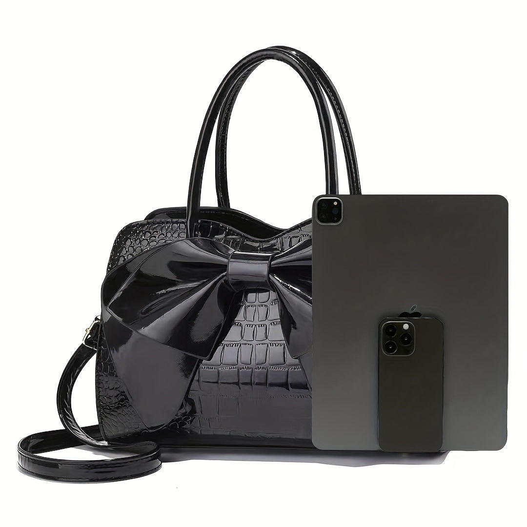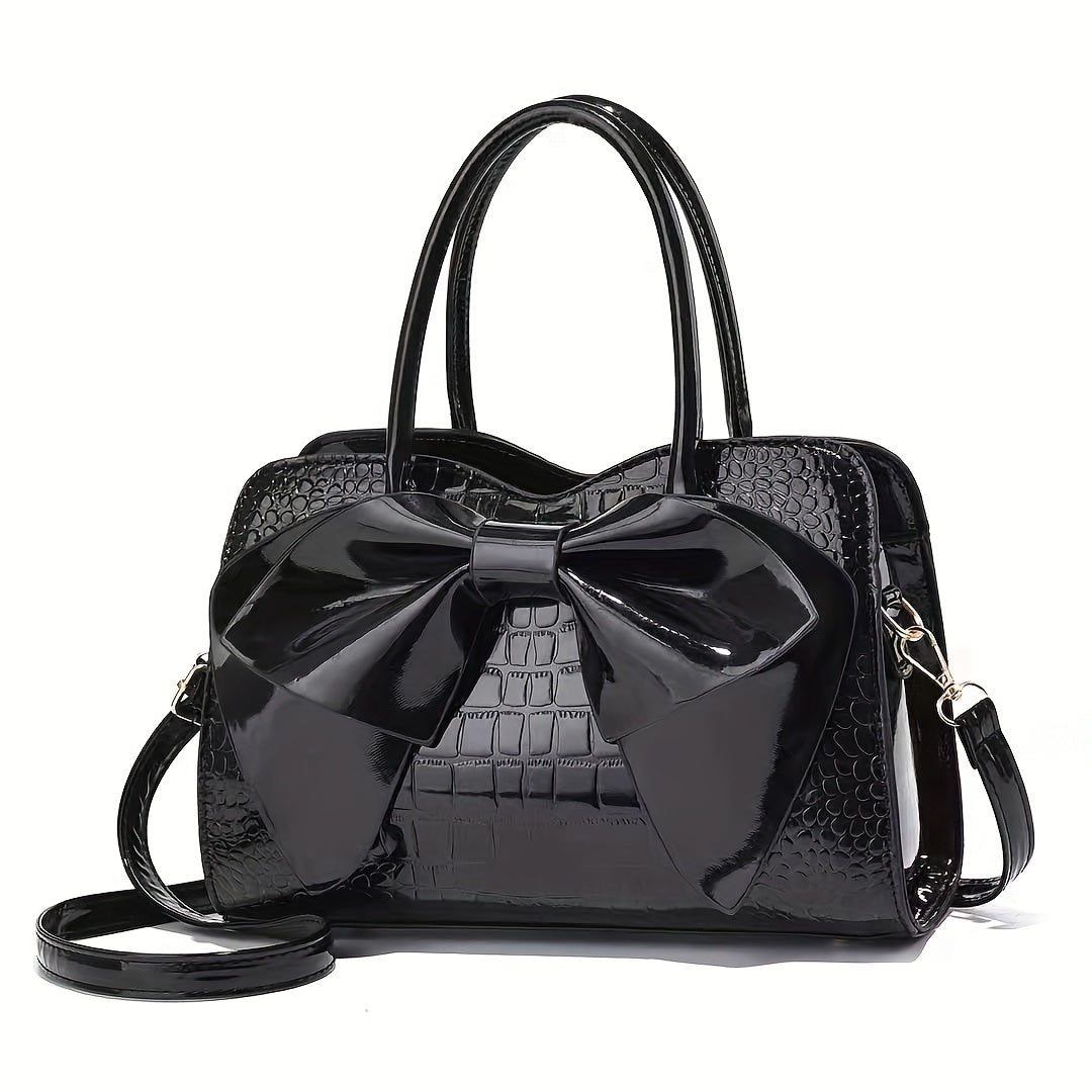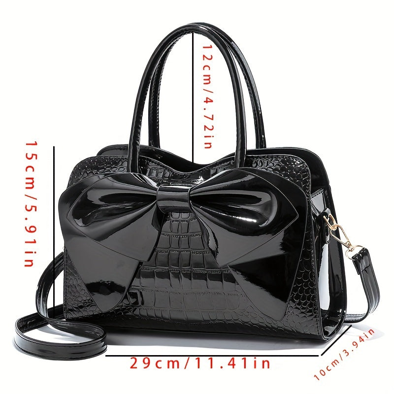 Mother's Day Gift for Mom - Large Capacity Tote Bag with Crocodile Print and Bow, Simple Fashionable Patent Handbag as Easter Present