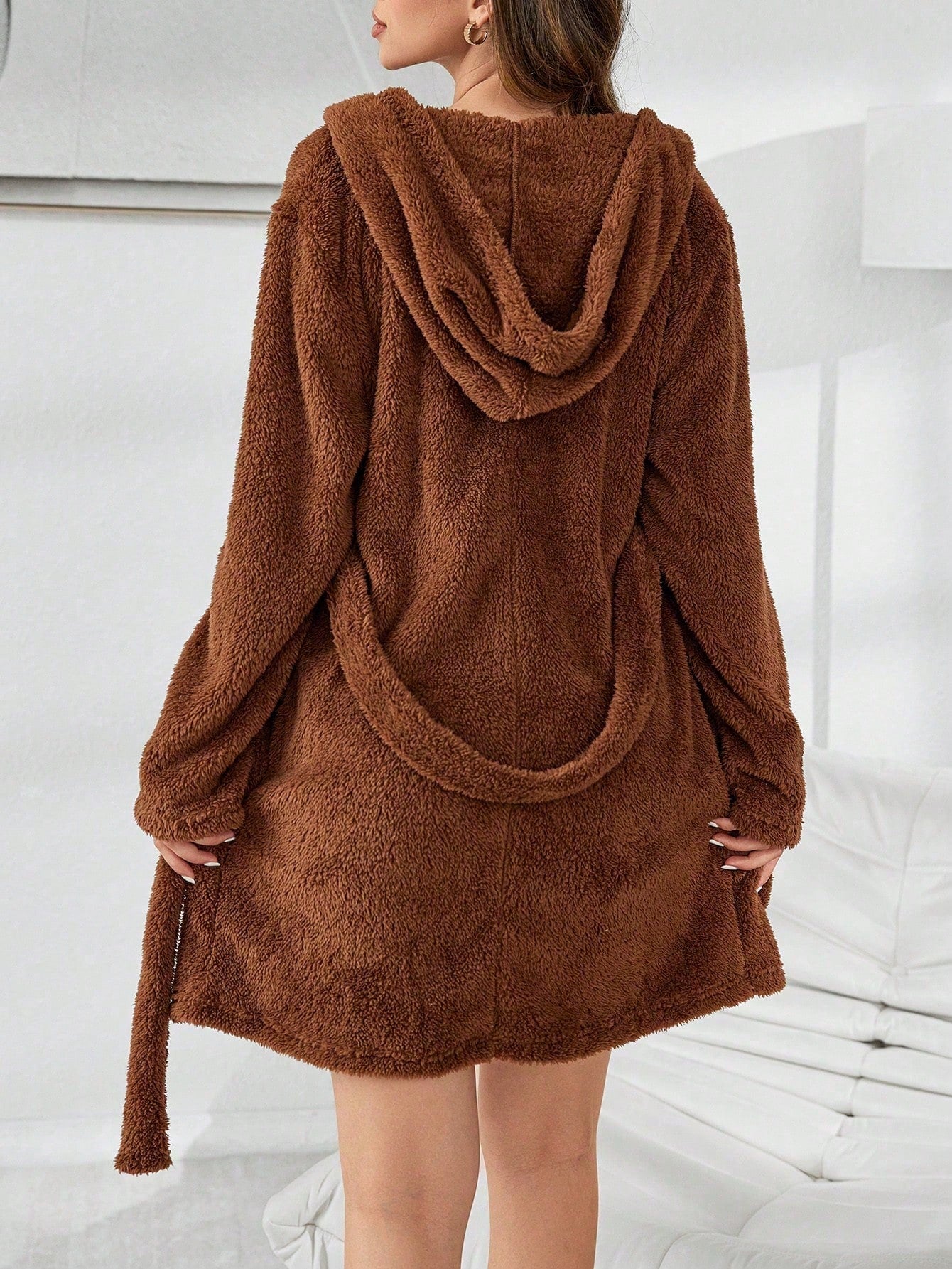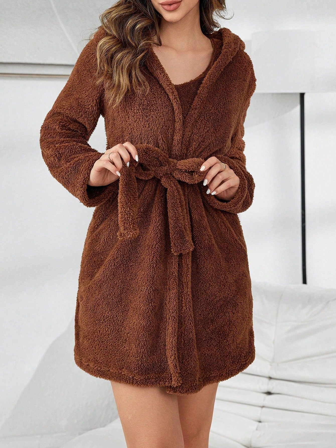 My Everyday 3pcs/Set Solid Color Plush Vest, Shorts, And Hooded Robe
