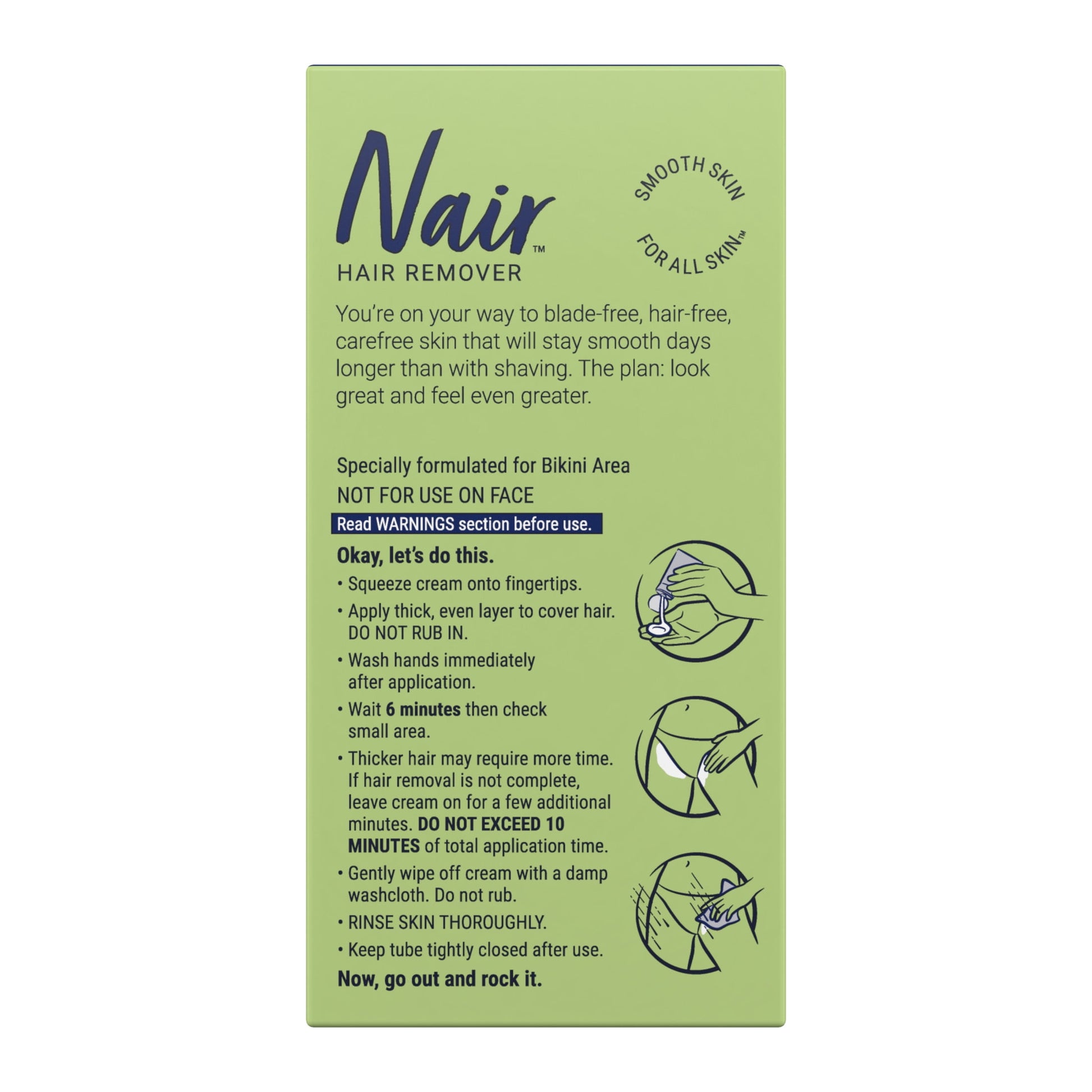 Instructions: Okay, let’s do this.• Squeeze cream onto fingertips.• Apply thick, even layer to cover hair. DO NOT RUB IN.• Wash hands immediately after application.• Wait 6 minutes then check small area.• Thicker hair may require more time.If hair removal is not complete, leave cream on for a few additional minutes.DO NOT EXCEED 10 MINUTES of total application time.• Gently wipe off cream with damp washcloth. Do not rub.• RINSE SKIN THOROUGHLY.• Keep tube tightly closed after use.Now, go out and rock it.