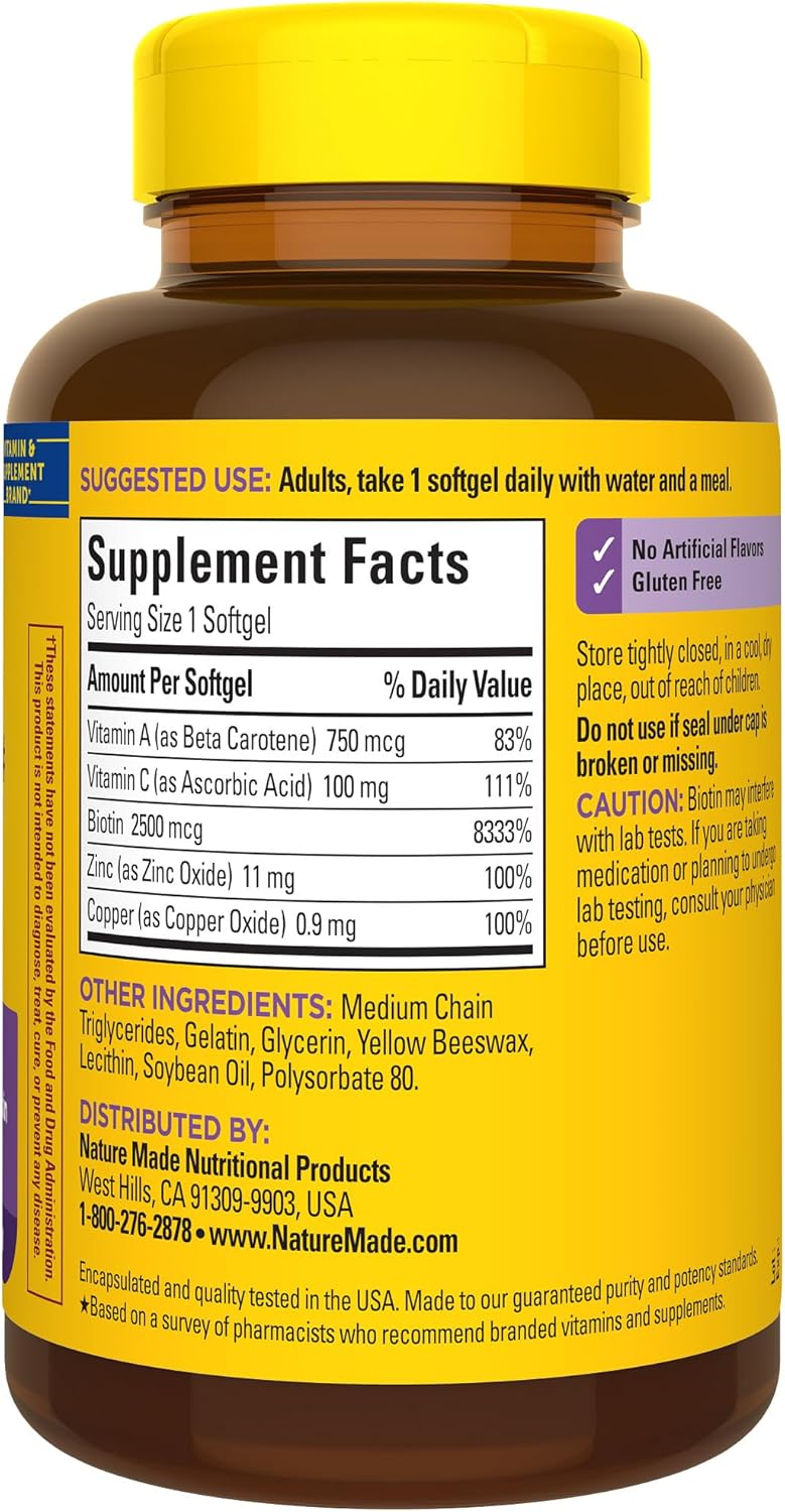 Each Nature Made Biotin 2500 mcg softgel supports hair health, skin health, and healthy nails for those low in Biotin