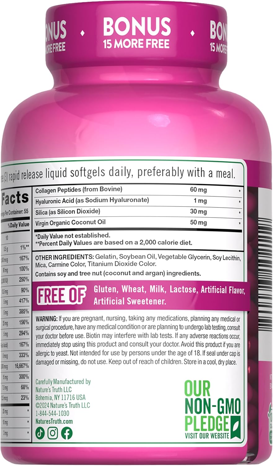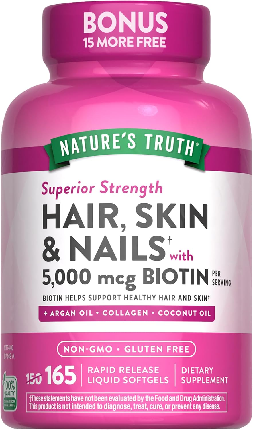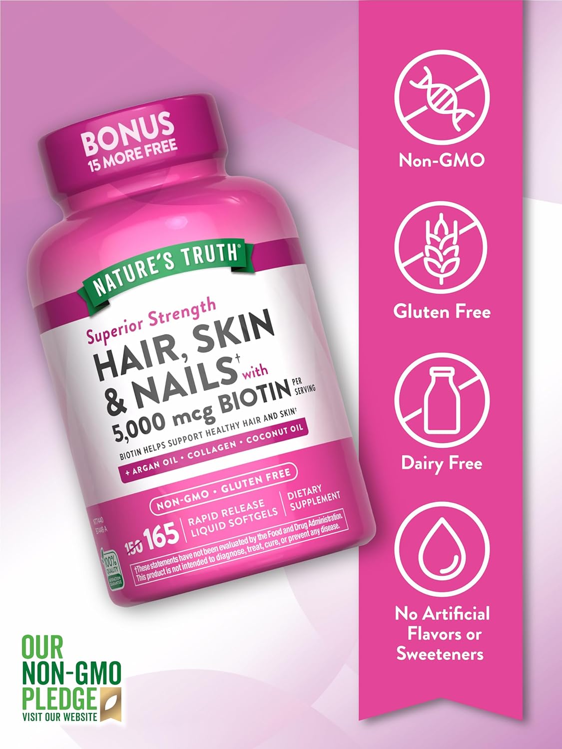 Nature's Truth Hair, Skin & Nails Vitamin | 5000 mcg Biotin | 165 Softgels | with Collagen | Non-GMO & Gluten Free Supplement