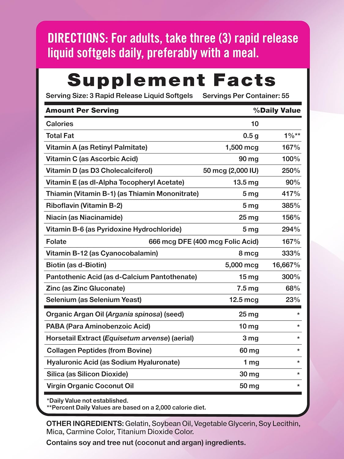 - Hair skin nails* supplement: 5000 mcg of Biotin per serving with Argan Oil, Coconut Oil & Collagen.