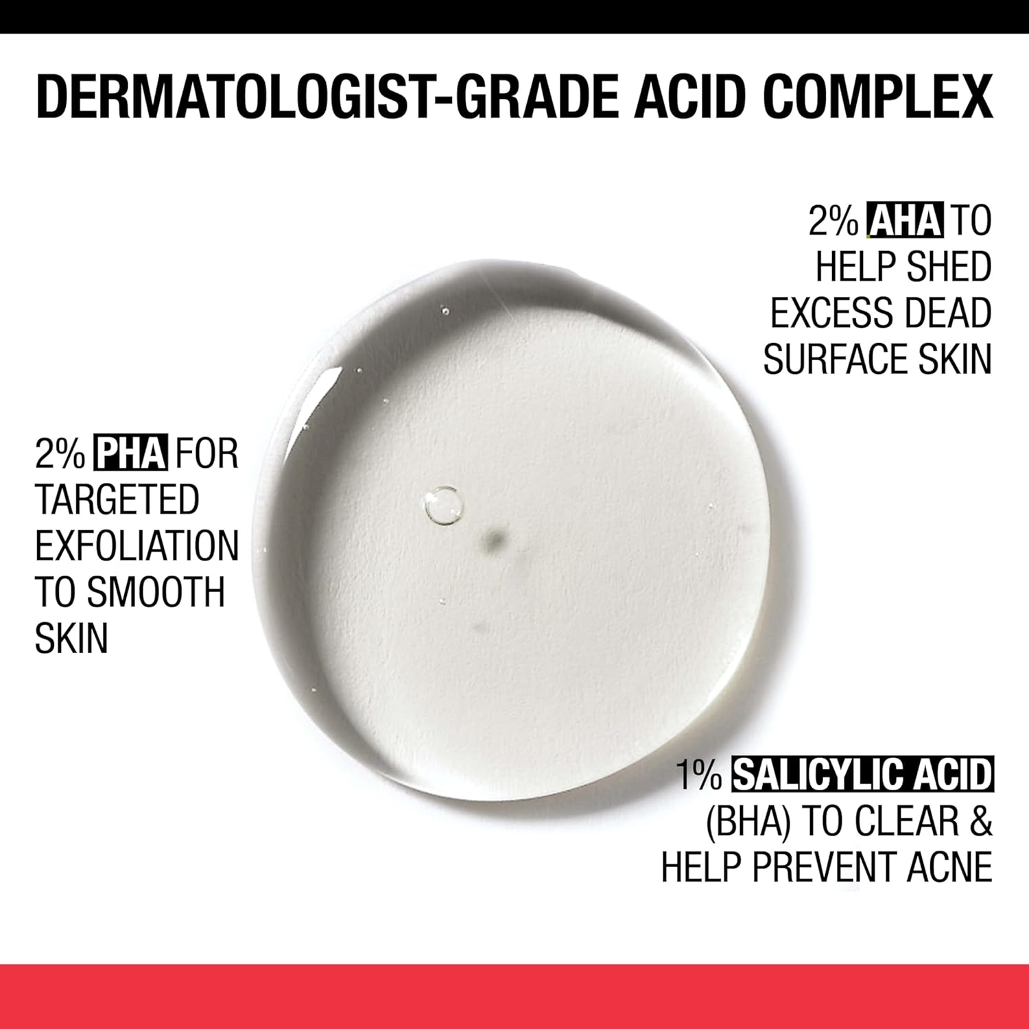 The dermatologist grade acid complex contains 2% glycolic acid (AHA) to help loosen and shed excess dead surface skin plus 2% polyhydroxy acid (PHA) for targeted exfoliation to clear and smooth skin