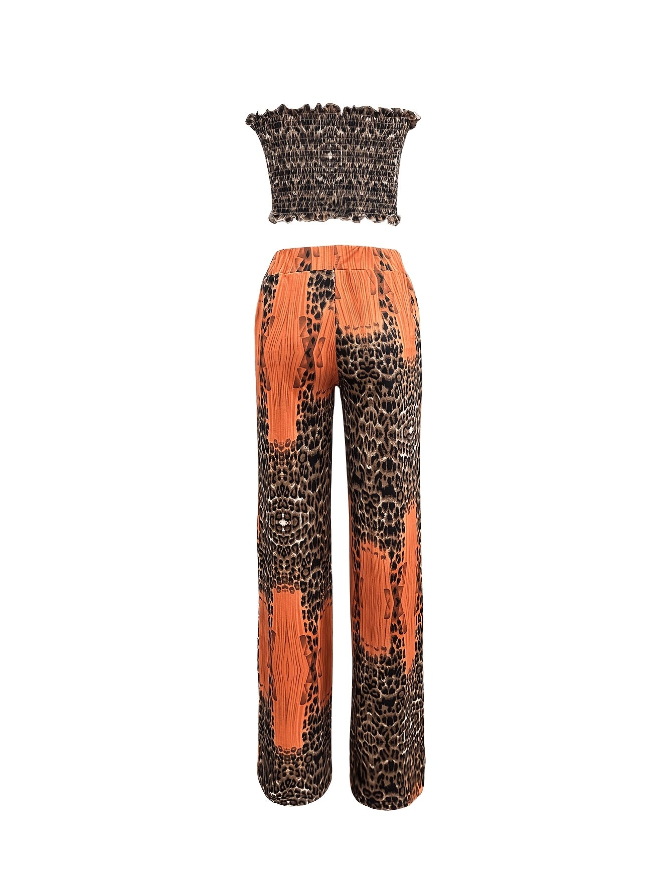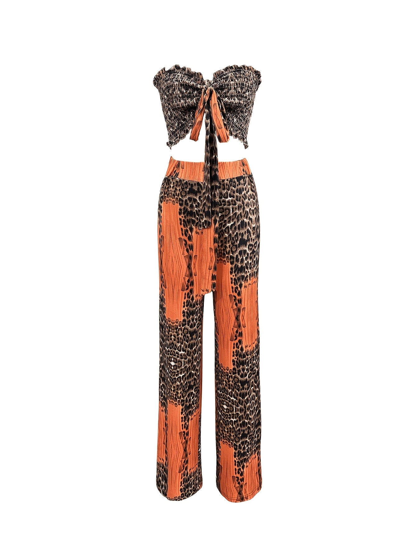 New Summer Leopard Print Halter Neck Tie Loose Wide Leg Trousers