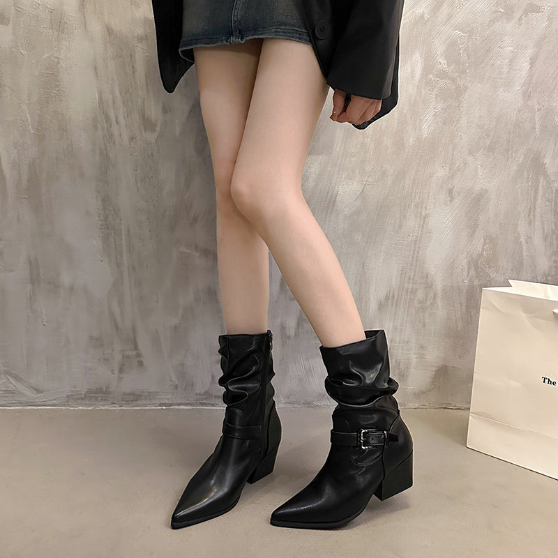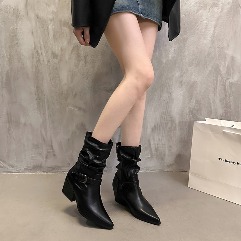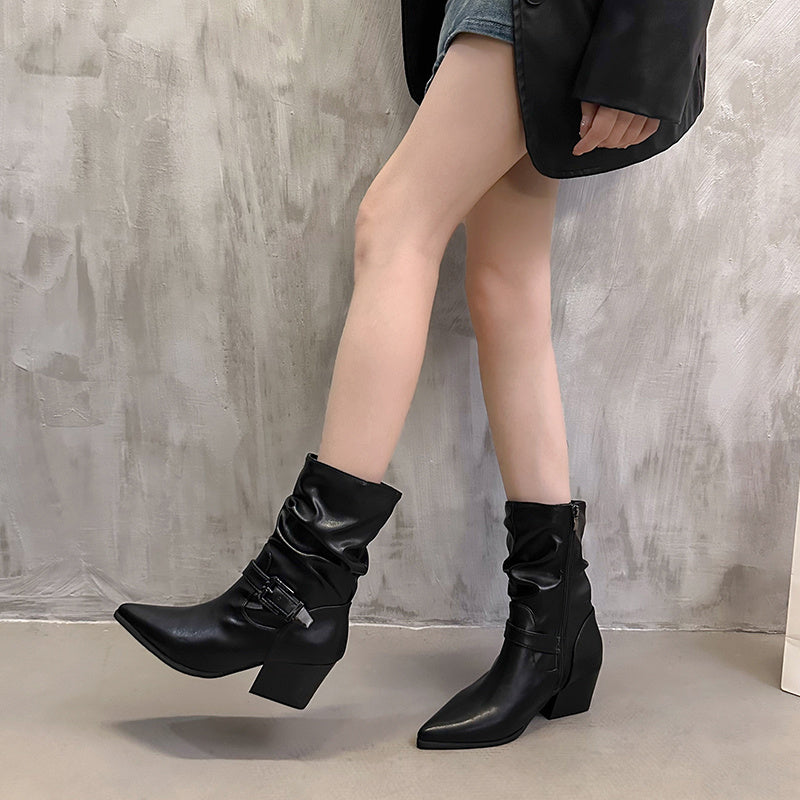 New Women's Pointed Toe Chunky Heel Ankle Boots with Side Zipper Design, Fashionable Mid-Calf Single Shoes