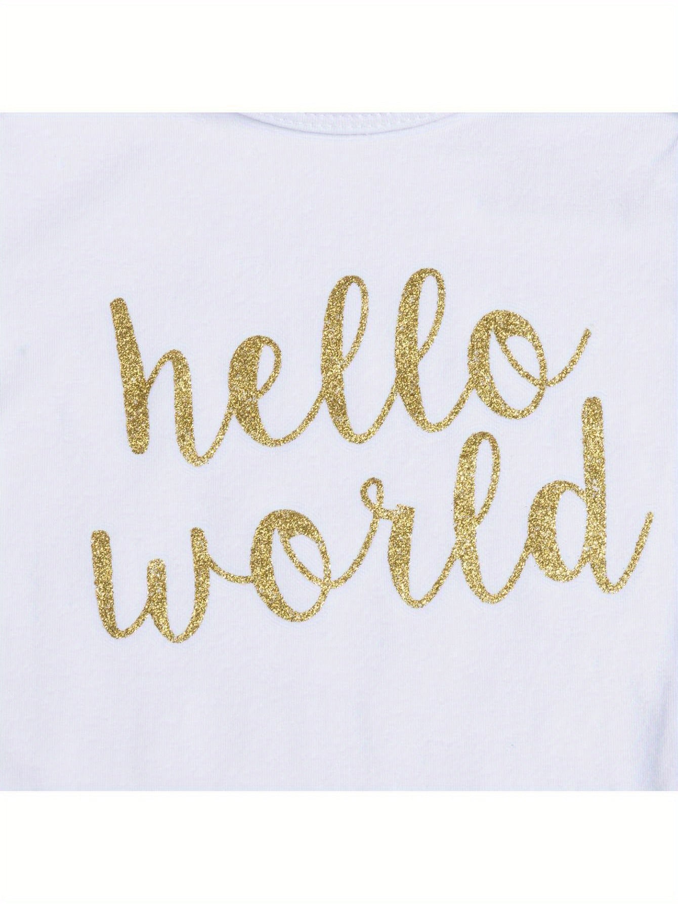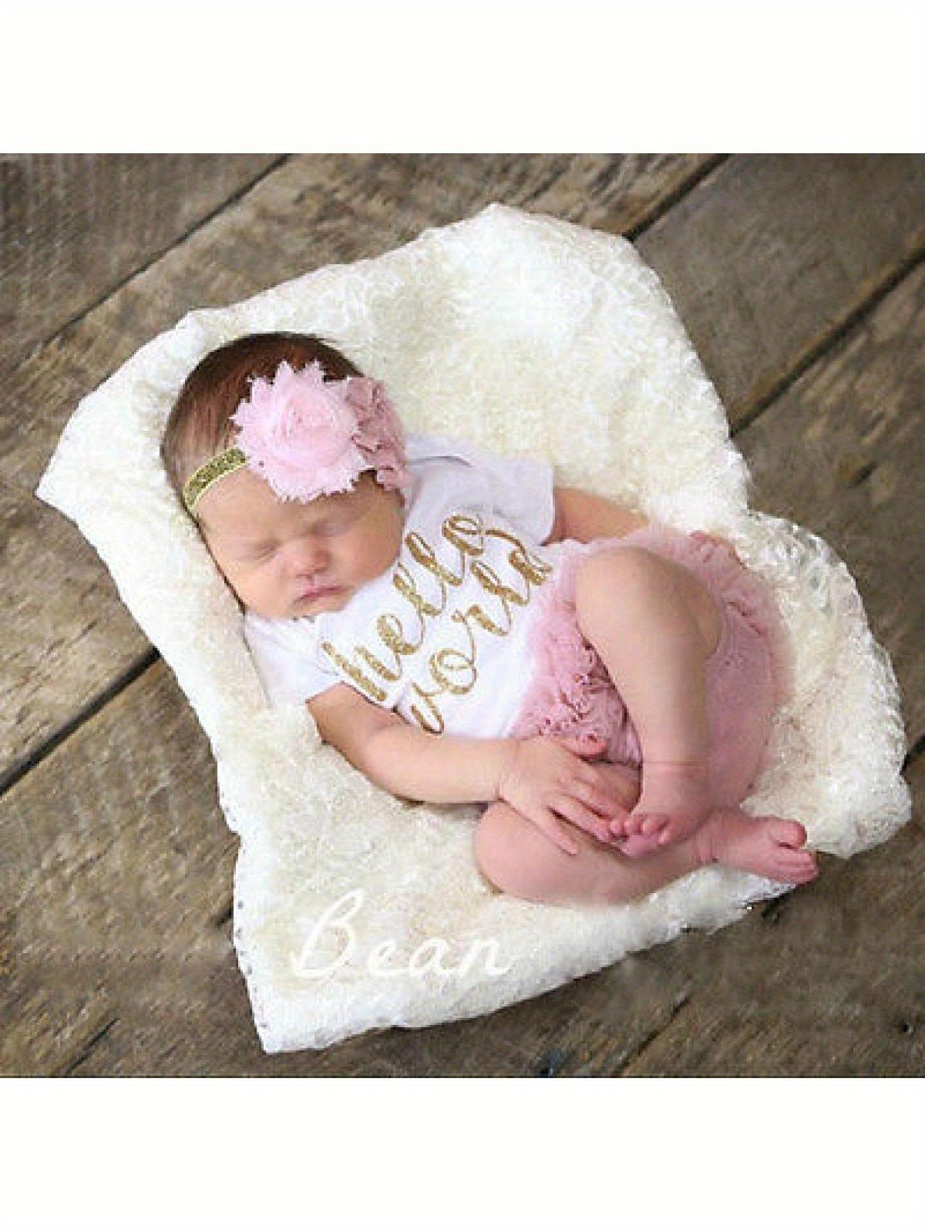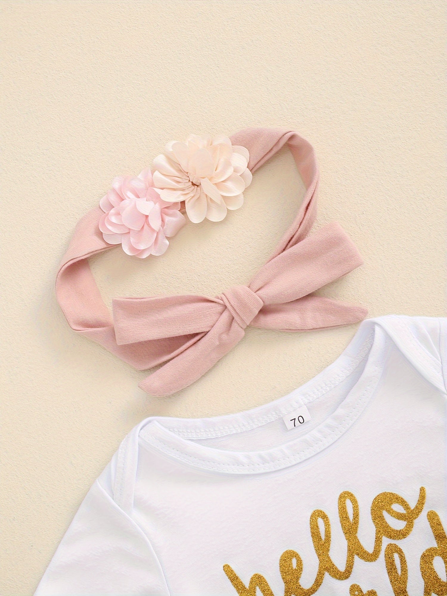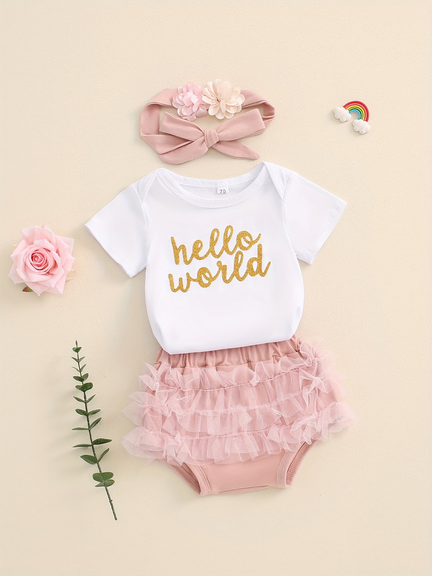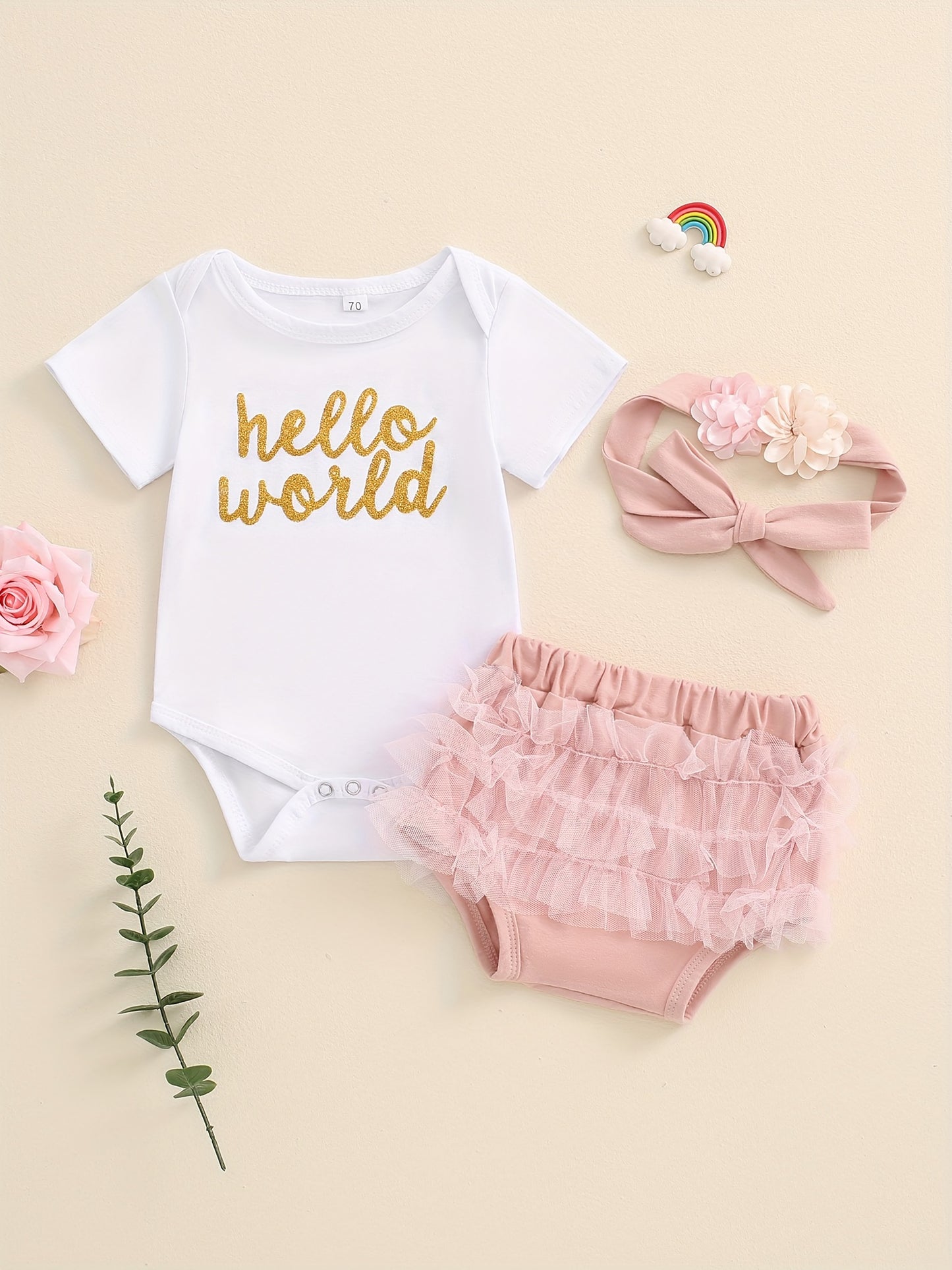Newborn Baby Girl Clothes Hello World Romper Bodysuit + Bloomers Shorts + Headband Set 3pcs Preemie Coming Home Outfits, for Outdoor
