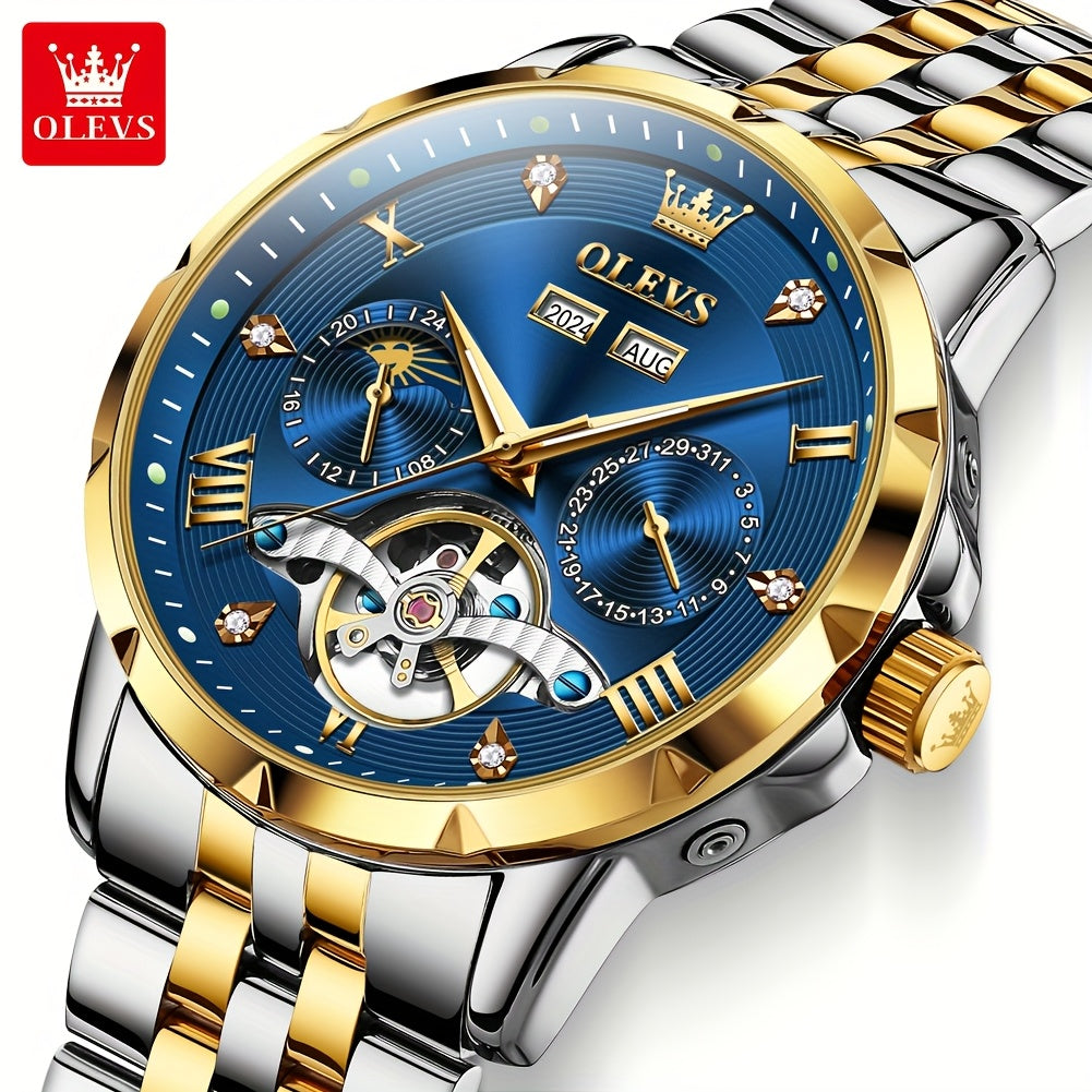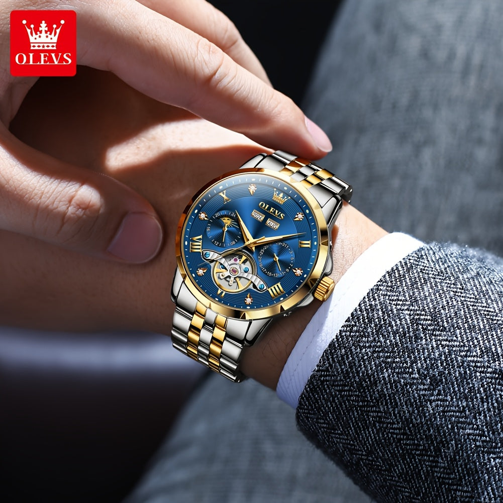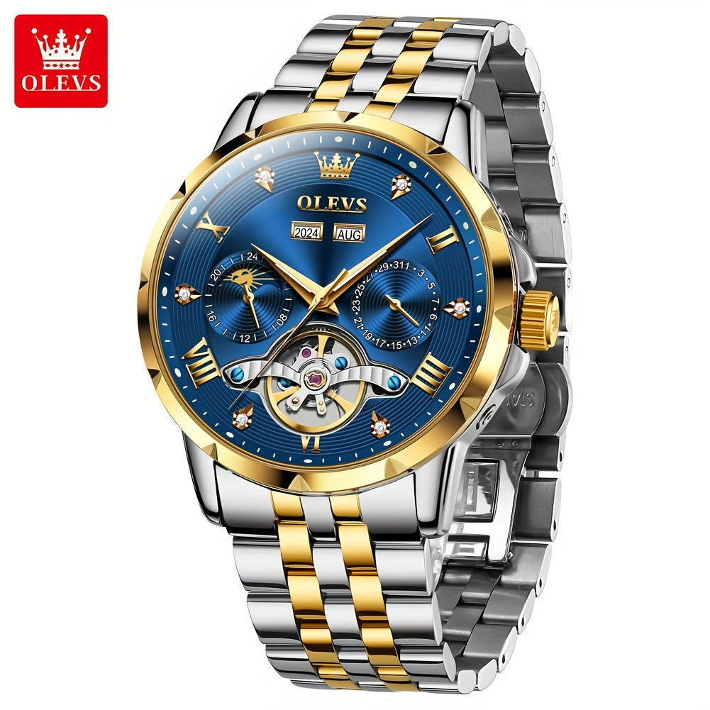 OLEVS Luxury Luminous Stainless Steel Automatic Mechanical Watch for Men - Blue Dial with Golden Accents, Roman Numerals, Date & Day Display, Chronograph, High Quality 1181.1inch, Casual & Business Formal Wear, Professional Timepiece, Classic Design, Dura