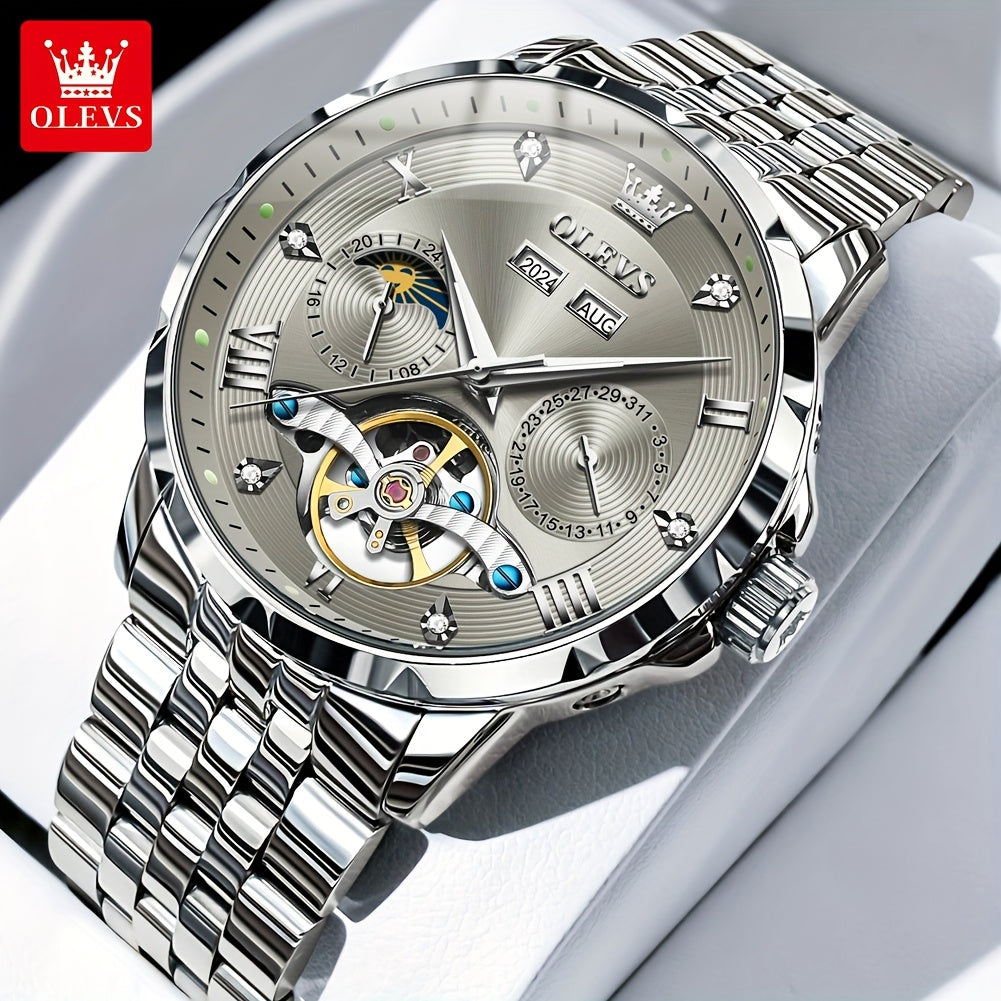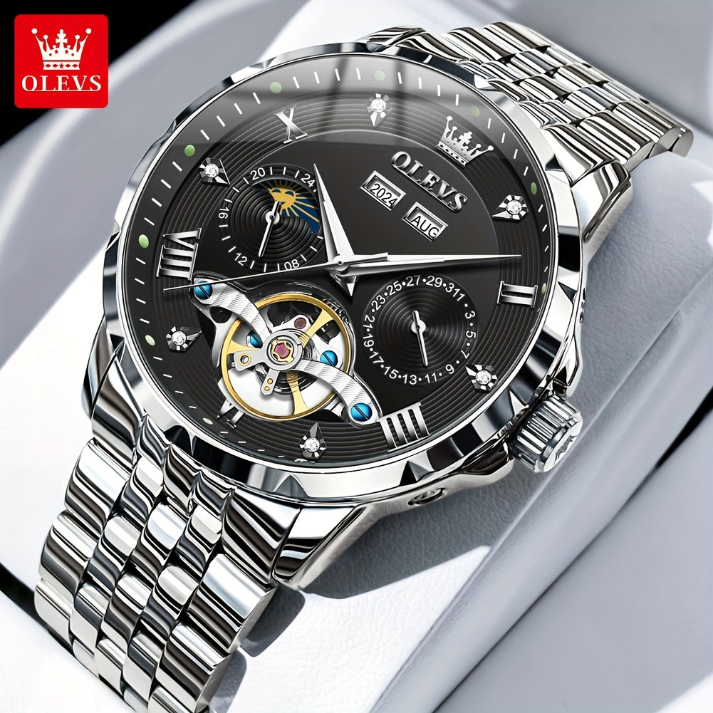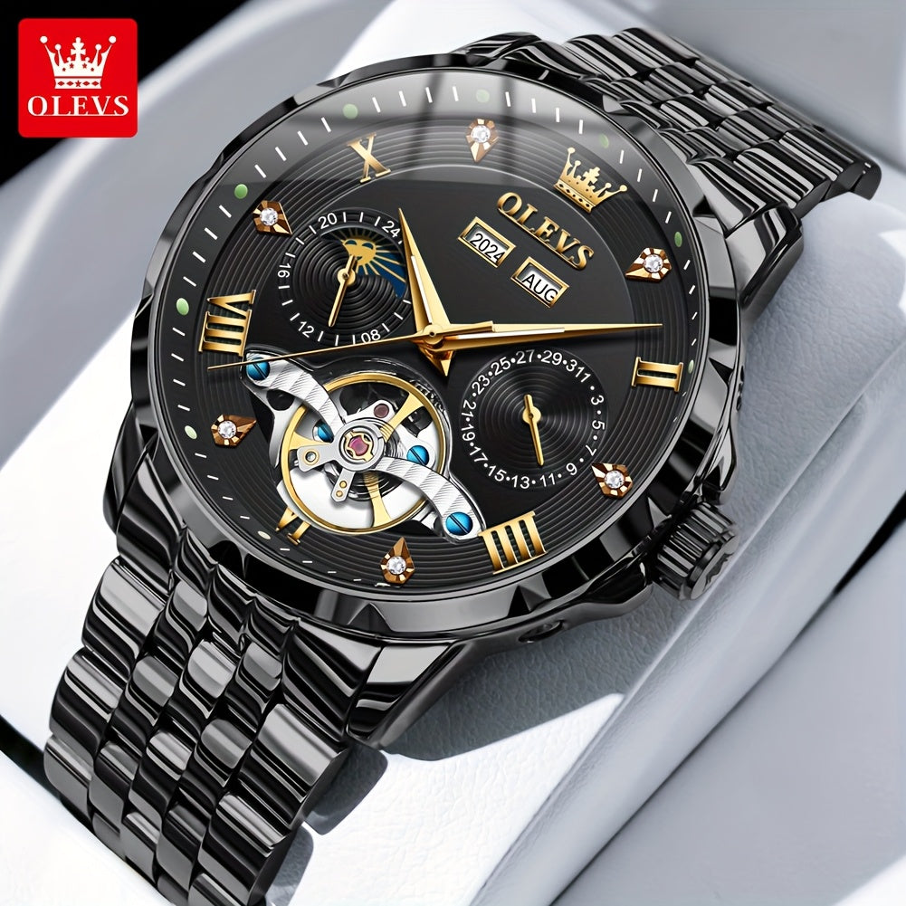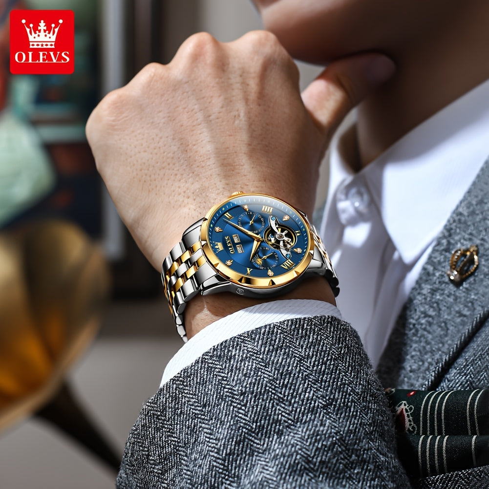 OLEVS Luxury Luminous Stainless Steel Automatic Mechanical Watch for Men - Blue Dial with Golden Accents, Roman Numerals, Date & Day Display, Chronograph, High Quality 1181.1inch, Casual & Business Formal Wear, Professional Timepiece, Classic Design, Dura